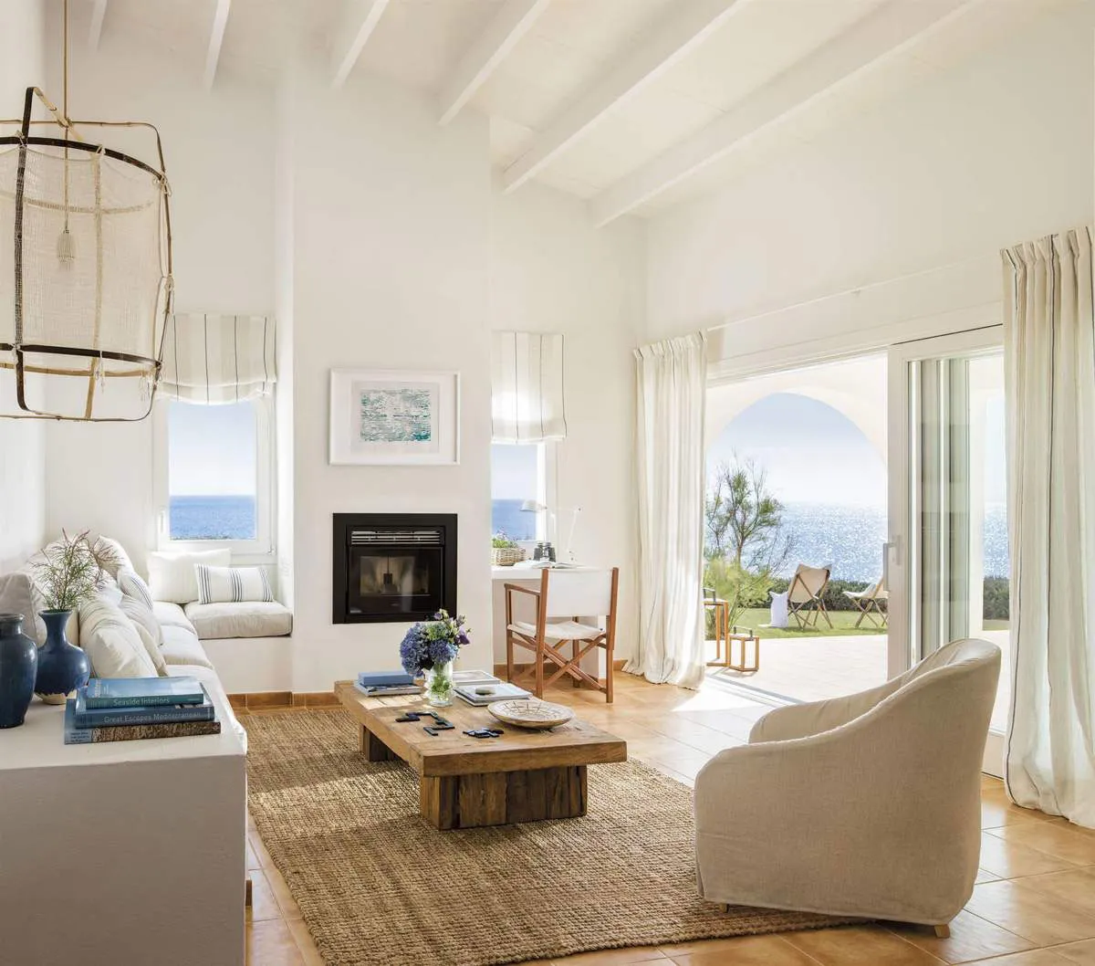Interior blanco aireado de una casa pequeña frente al mar en España