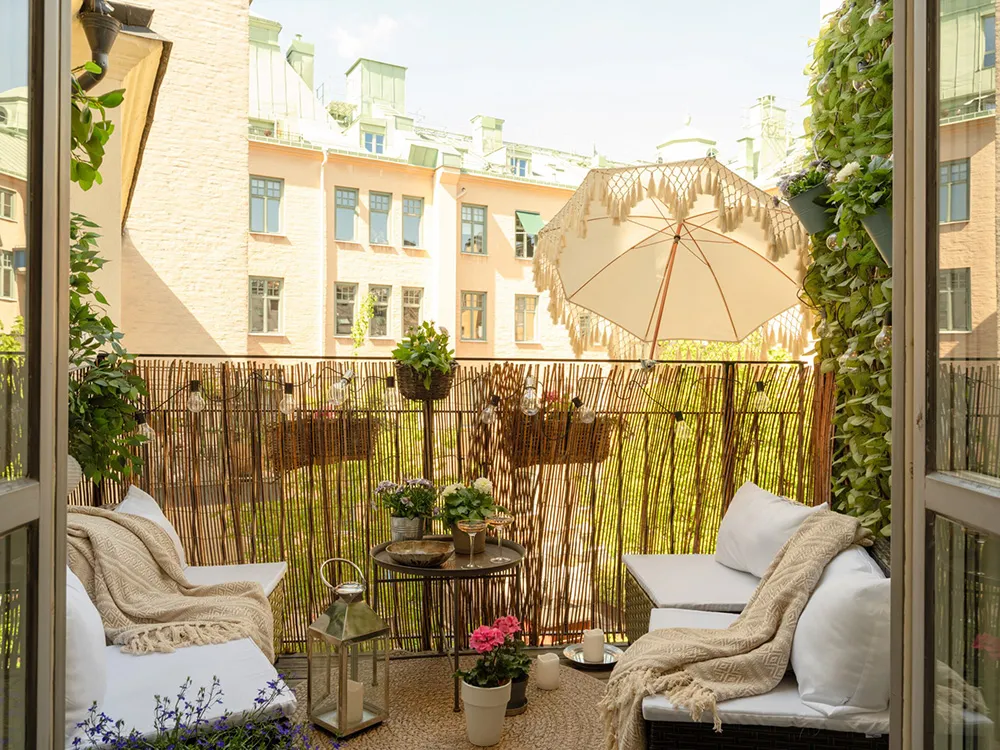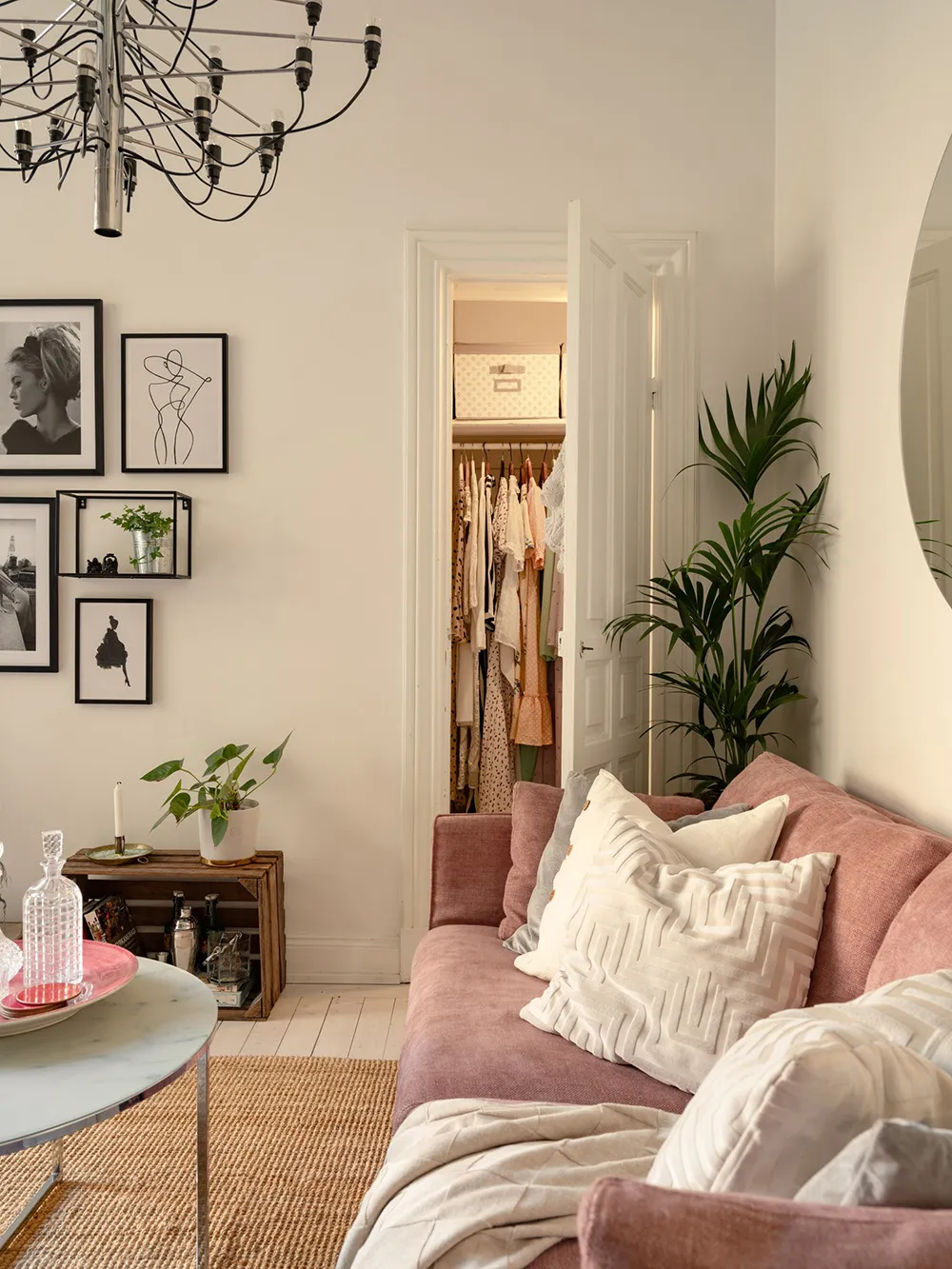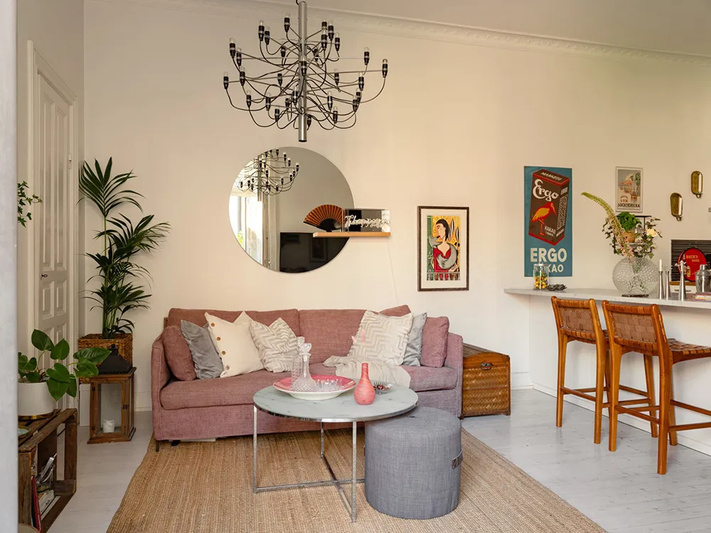Pequeña casa blanca de dos habitaciones con sofá rosa en Estocolmo (47 m²)