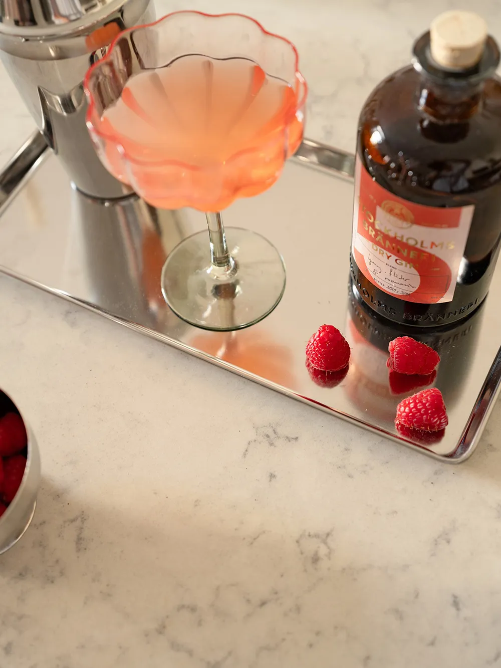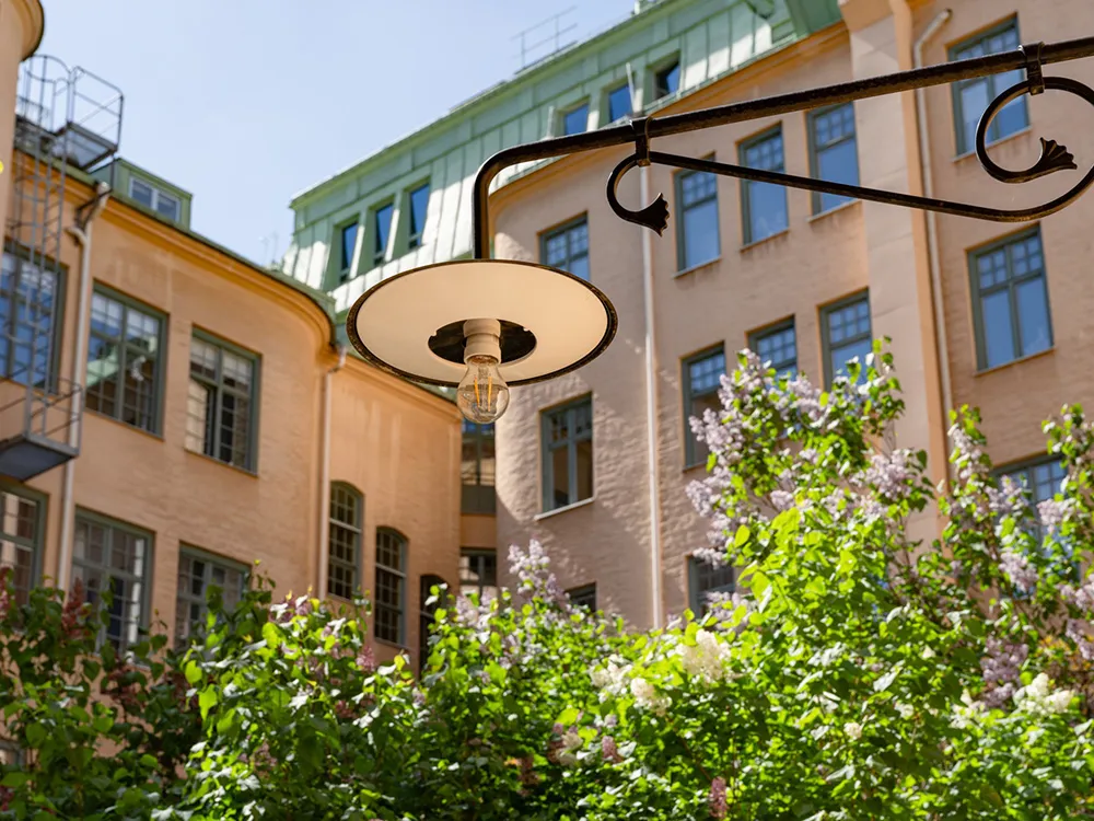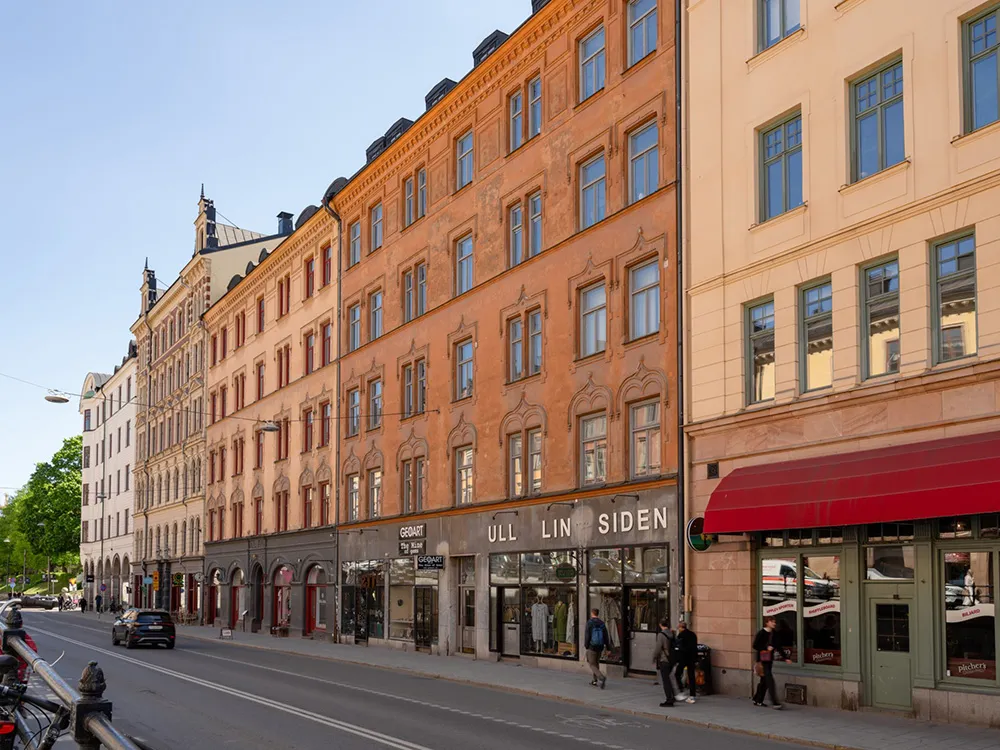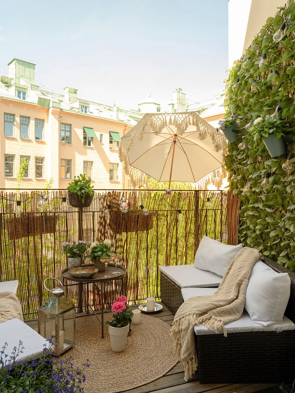 Pequeña casa blanca de dos habitaciones con sofá rosa en Estocolmo (47 m²)