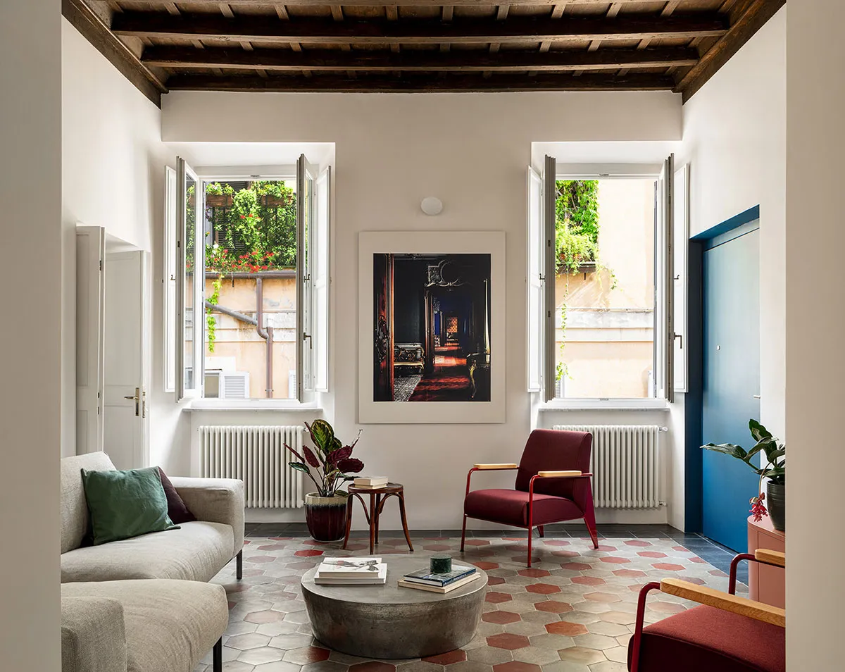 Interior brillante con vigas en una casa del siglo XVII en Roma