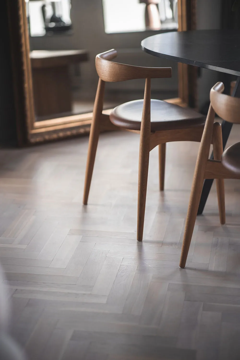 Madera oscura y muebles modernos claros: cabaña en Noruega