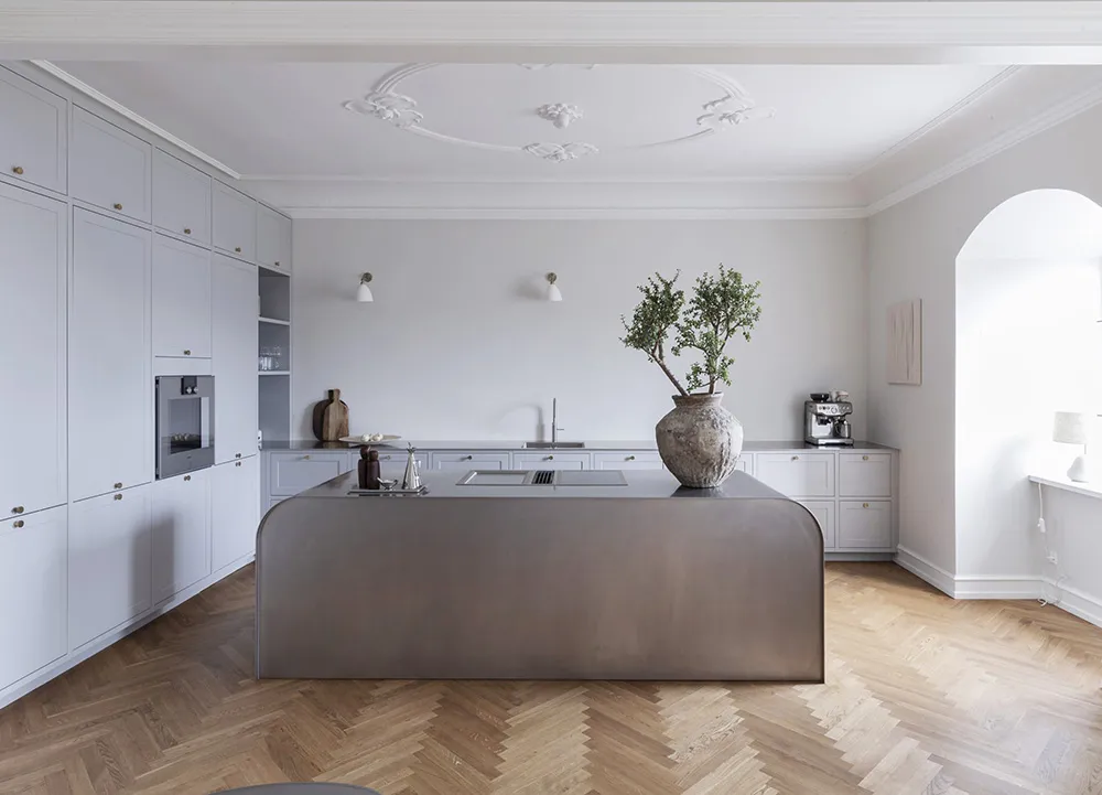 Elegantes apartamentos en Ørbaek con interiores monocromáticos y cocina inusual