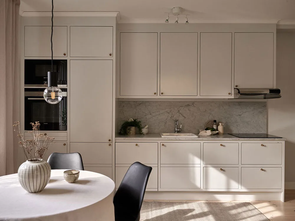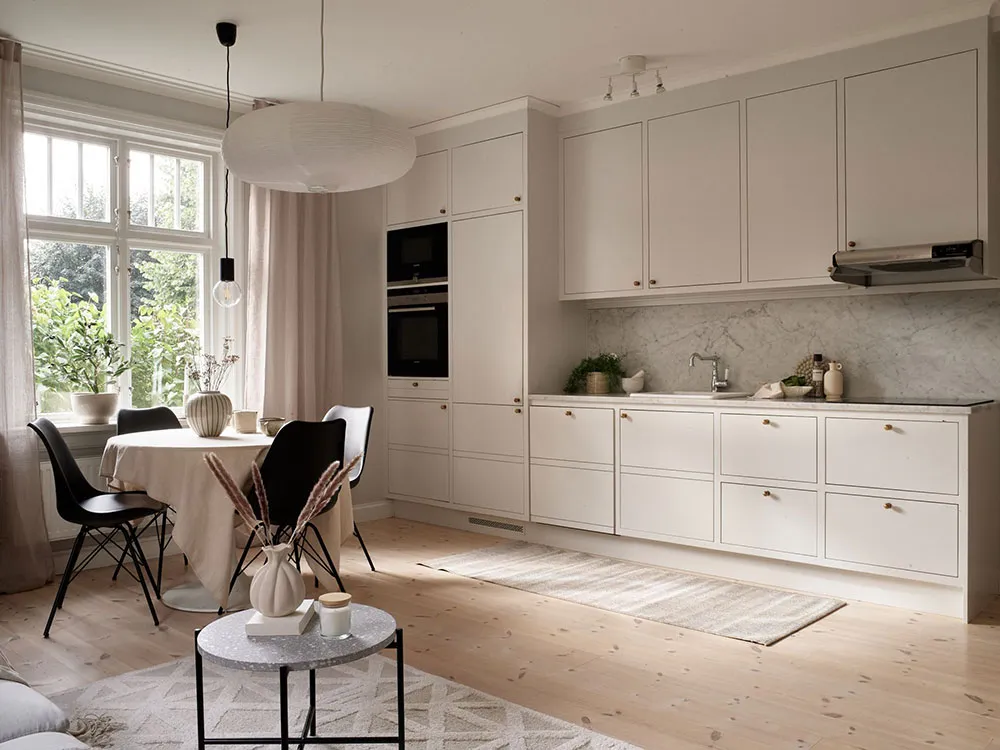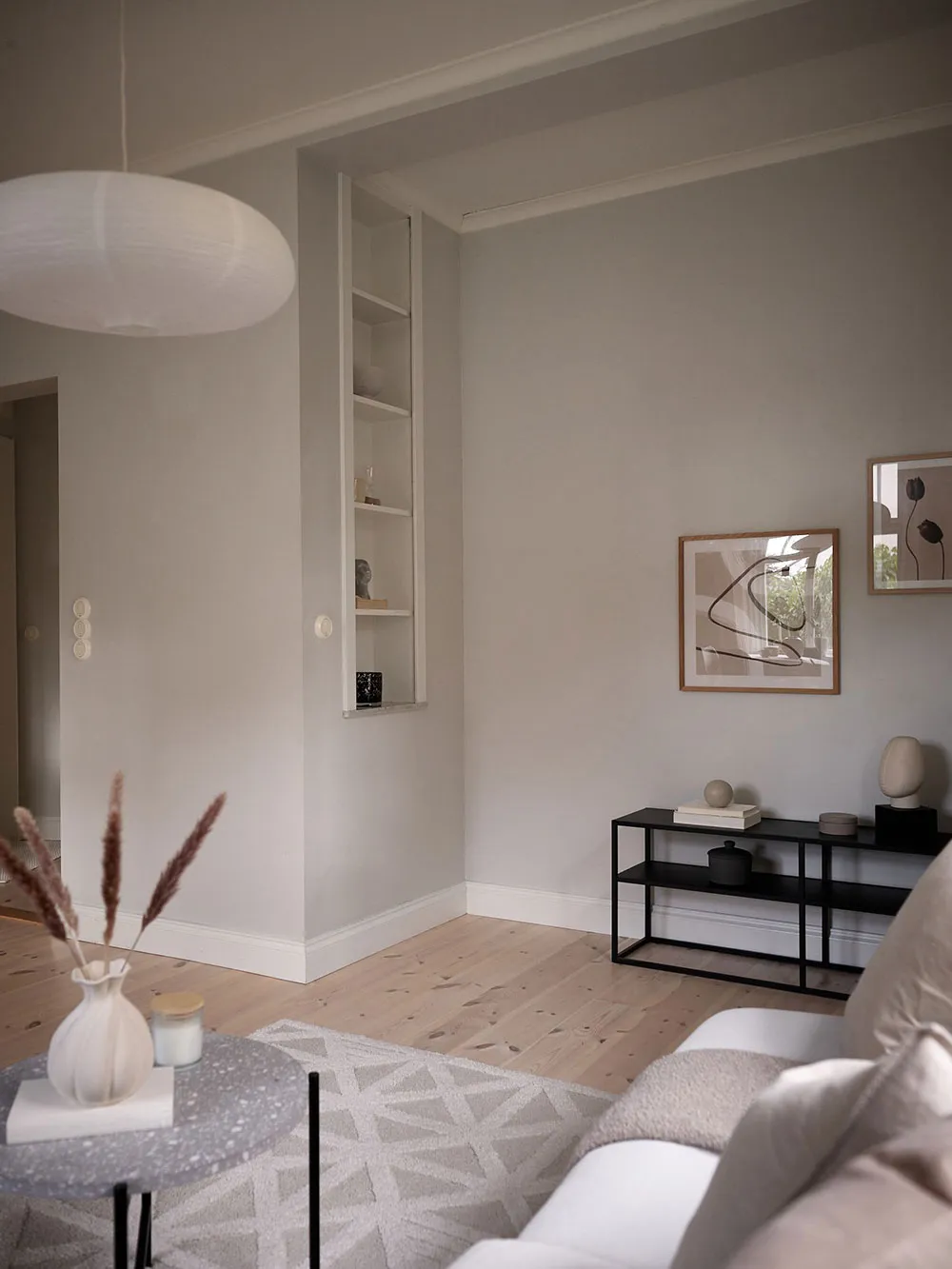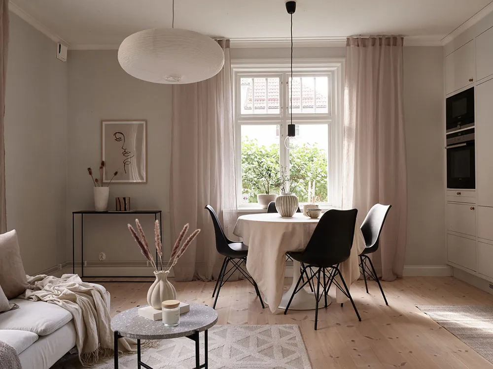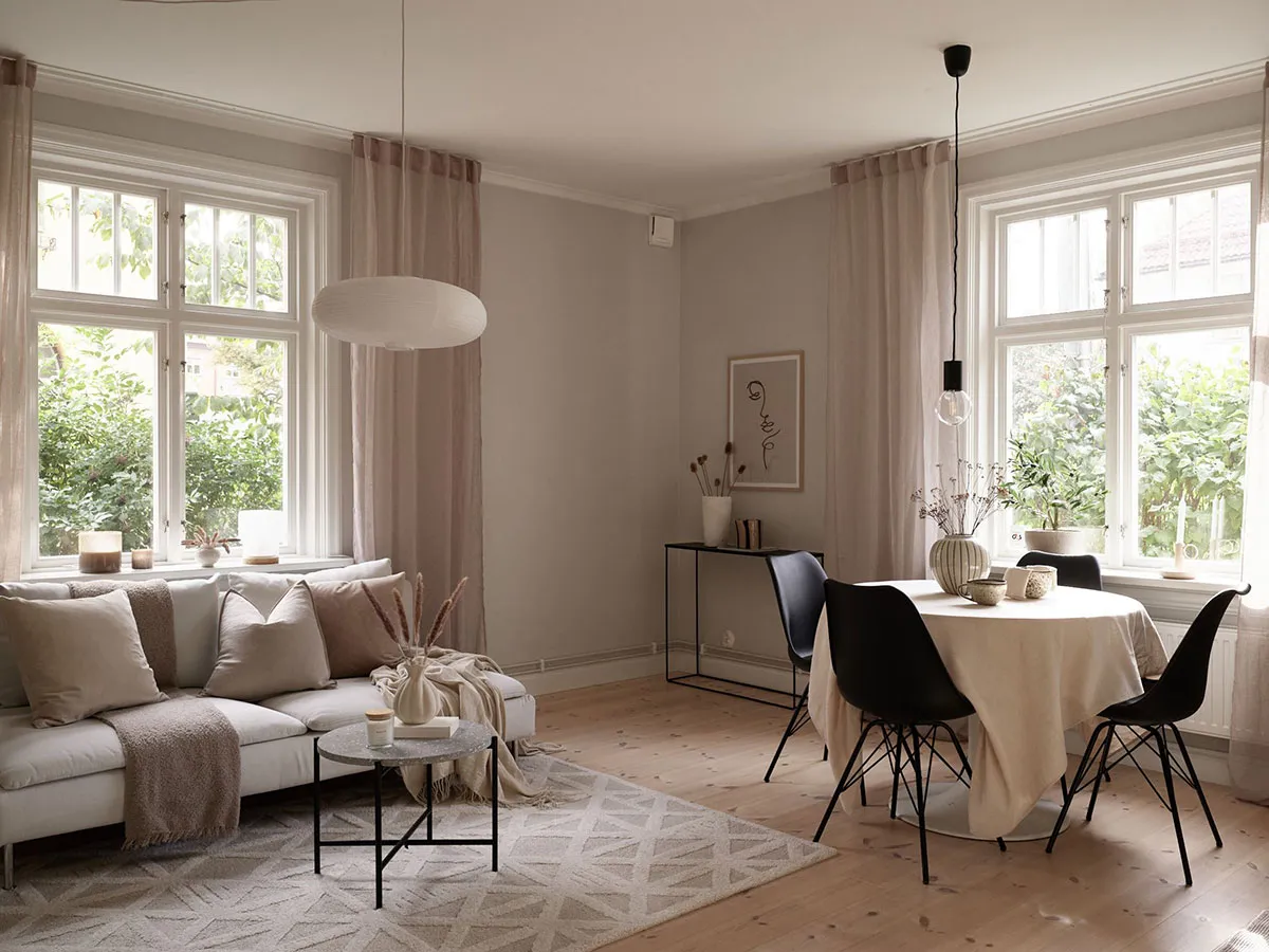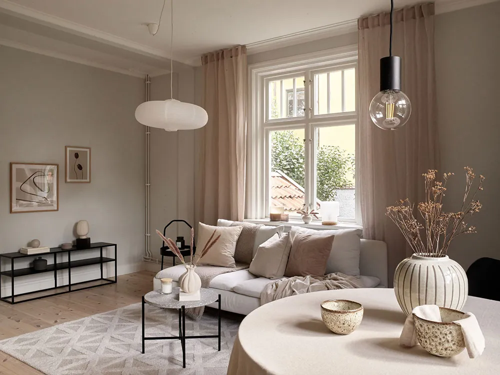 Interior beige suave en apartamento de estilo rústico en casa de campo sueca