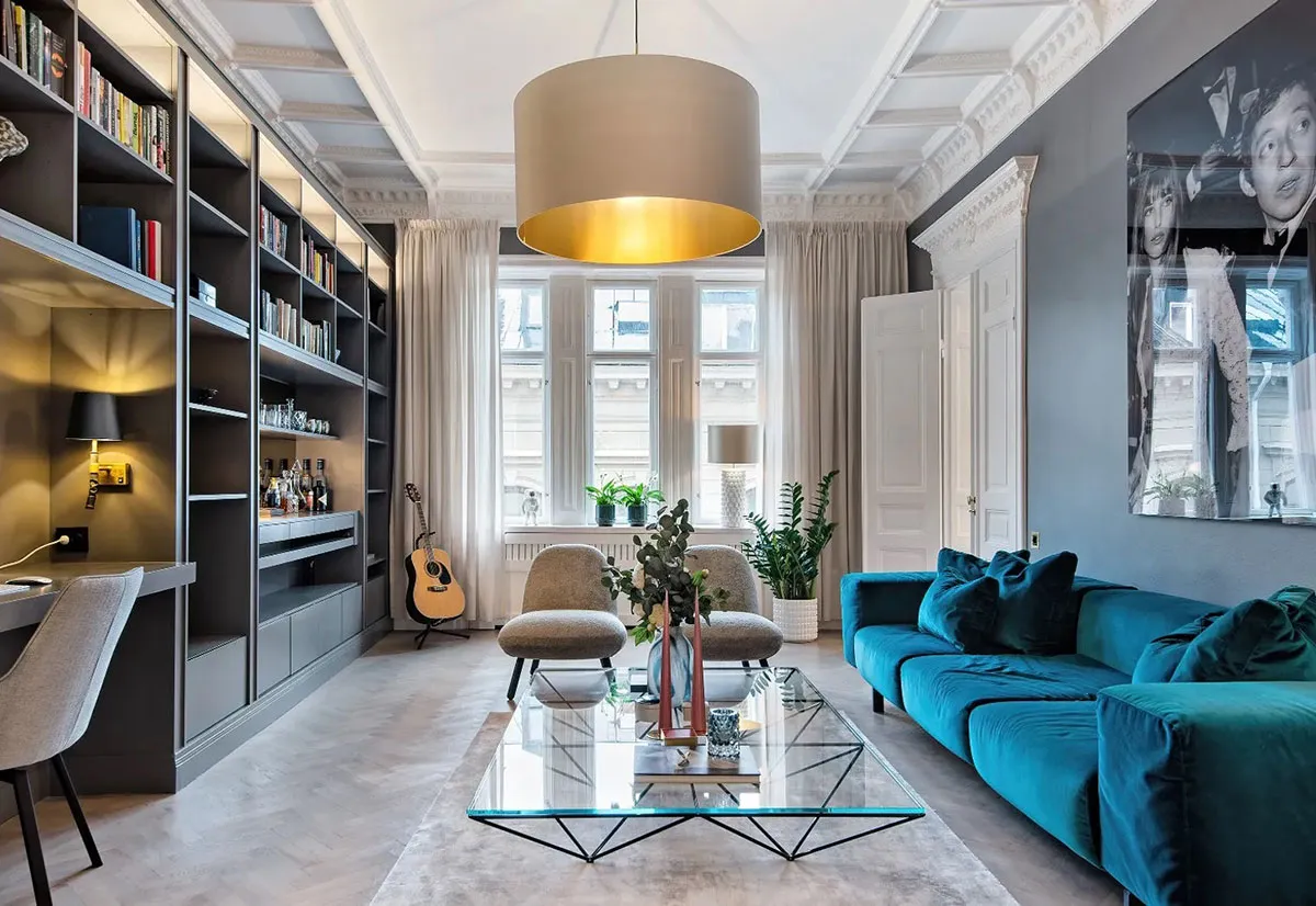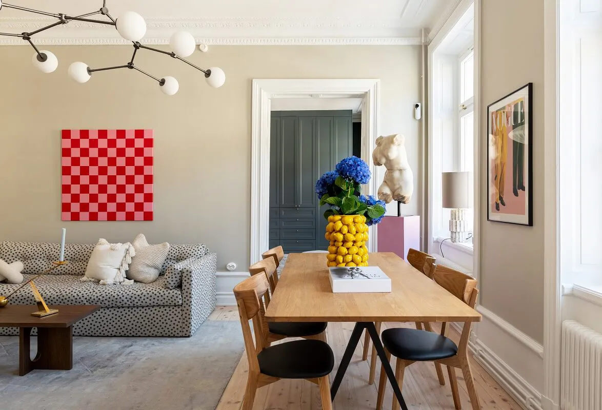 Toro antiguo y sofá manchado: apartamento sueco con decoración ecléctica