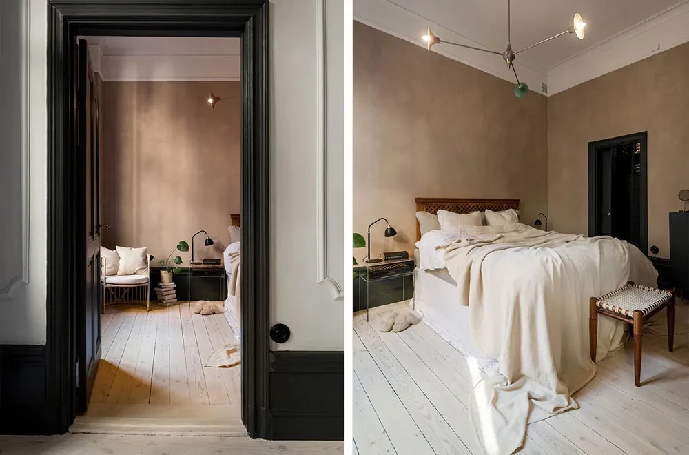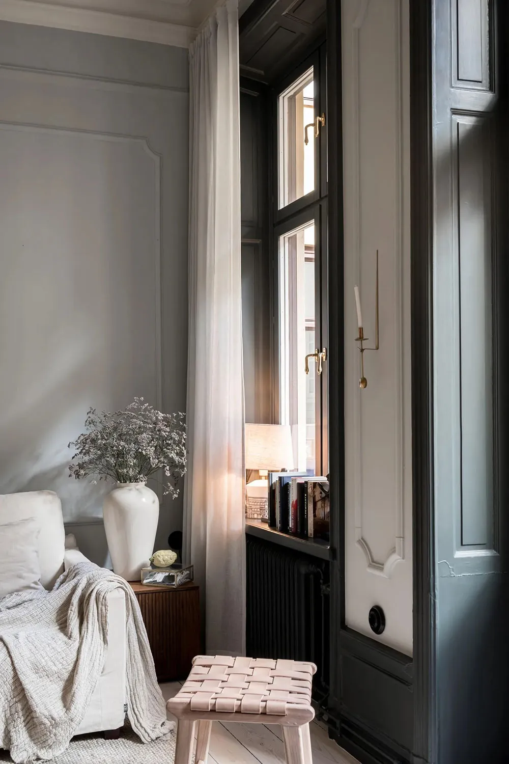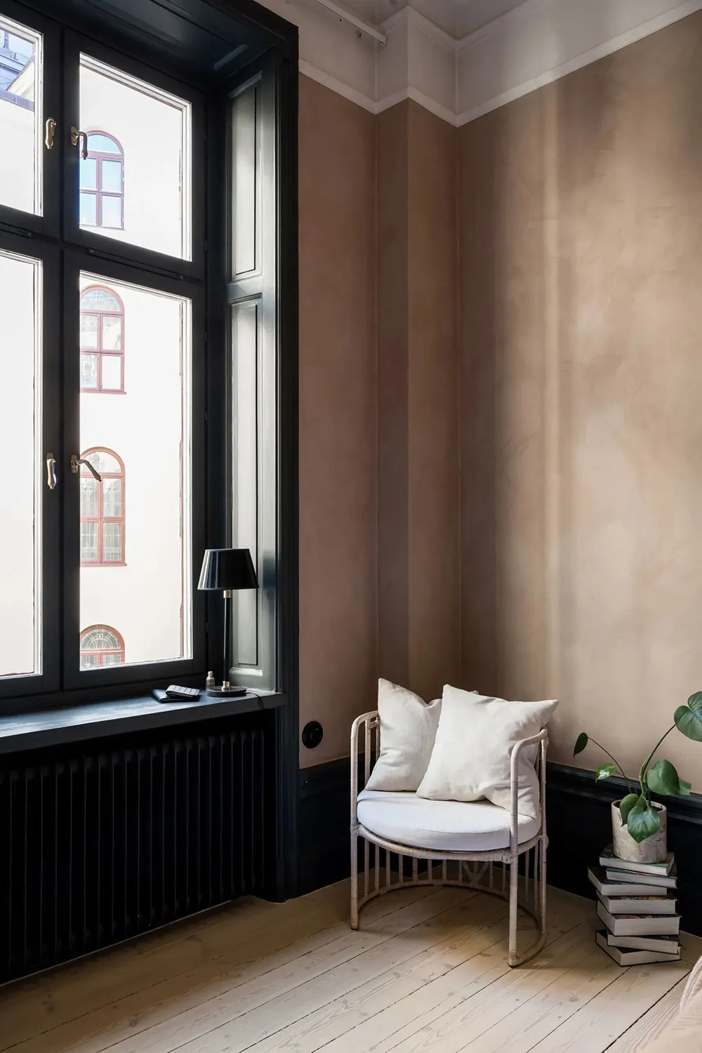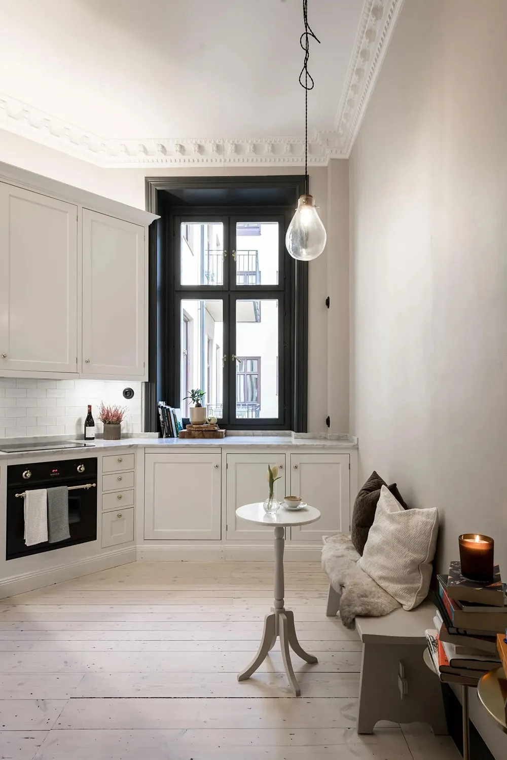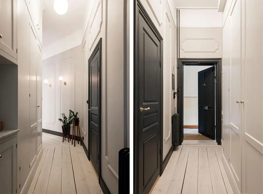 Todos los marcos de puertas y ventanas en este pequeño apartamento de dos habitaciones en Estocolmo están terminados con tonos oscuros llamativos, una solución muy atrevida y elegante.