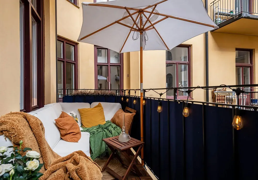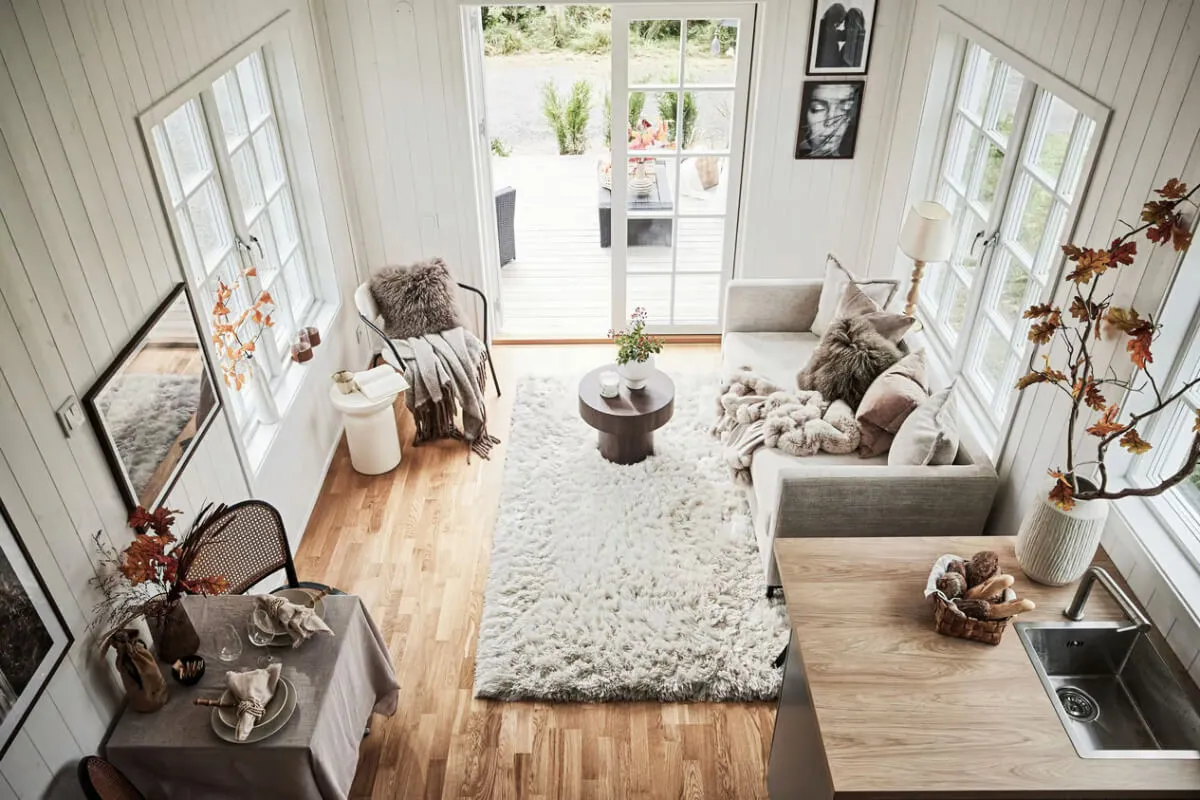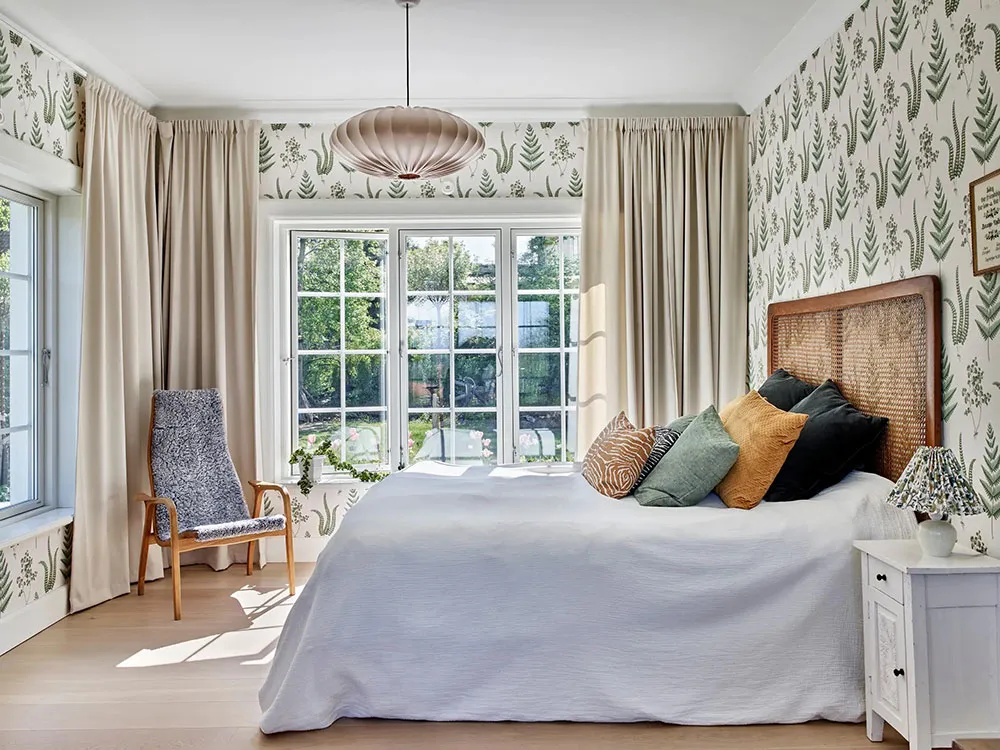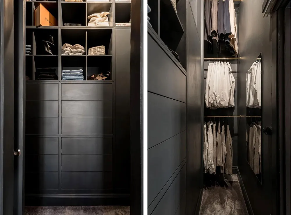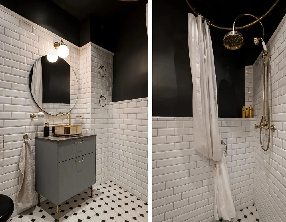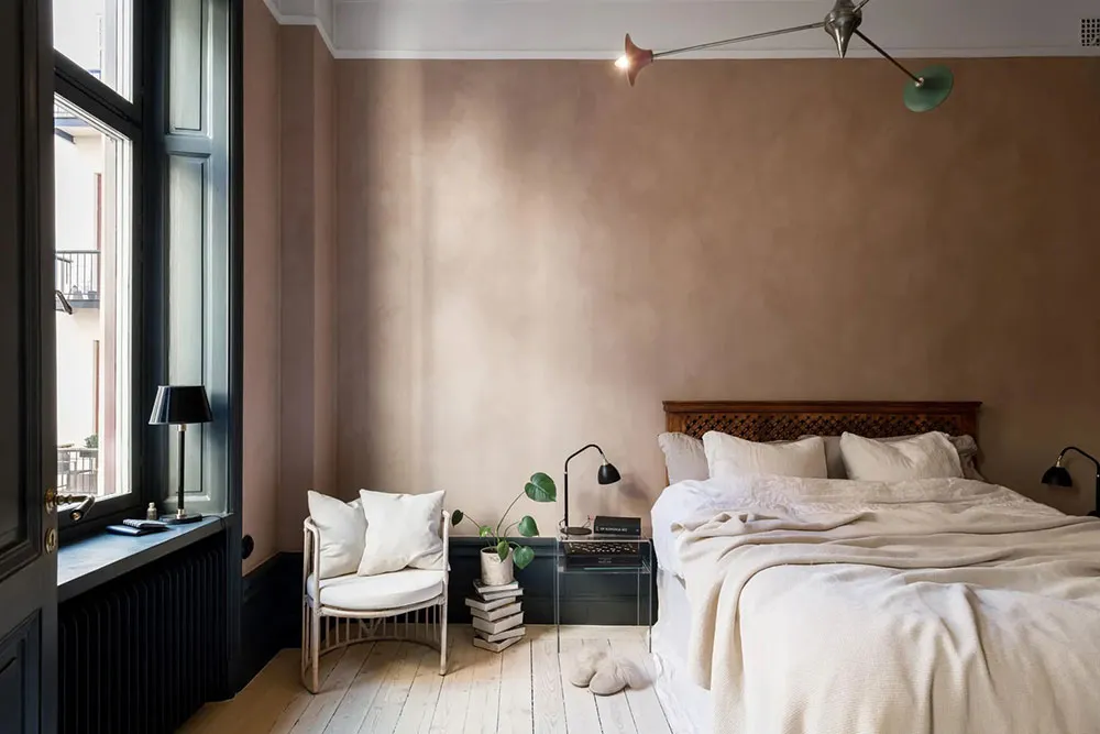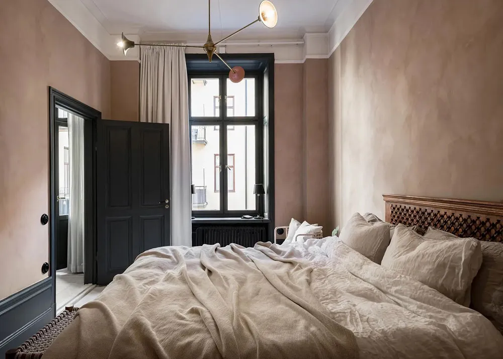 Todos los marcos de puertas y ventanas en este pequeño apartamento de dos habitaciones en Estocolmo están terminados con tonos oscuros llamativos, una solución muy atrevida y elegante.