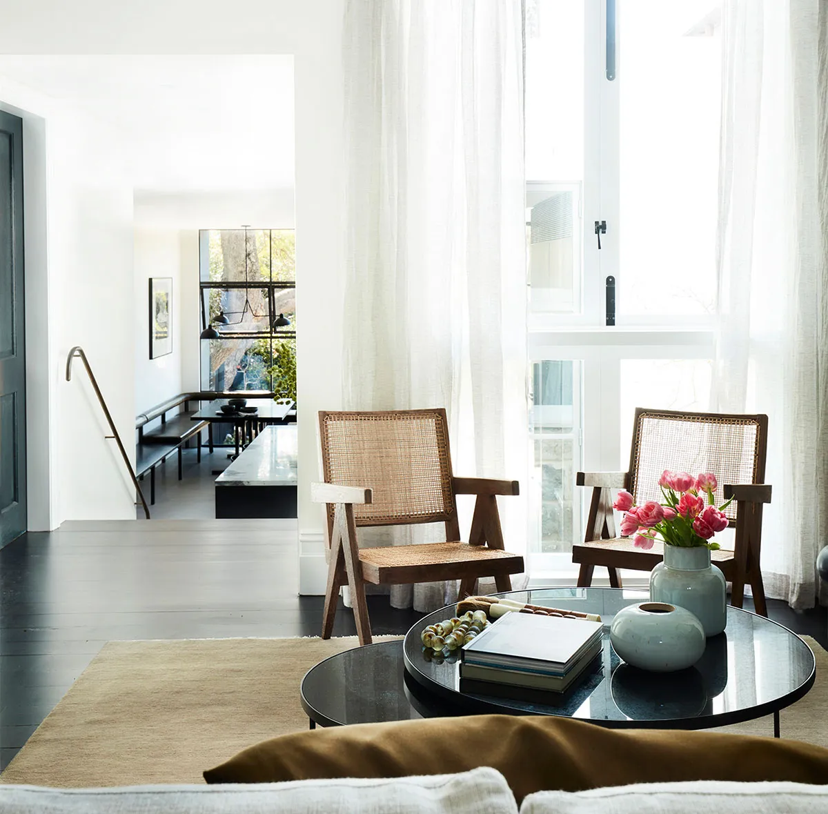 Estilosos interiores blanco y negro en casa histórica de Sídney