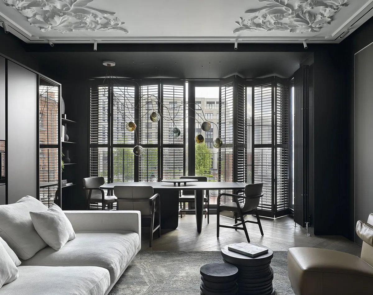 Minimalismo en tonos oscuros y estucado: un interior atrevido para un joven en Moscú (73 m²)