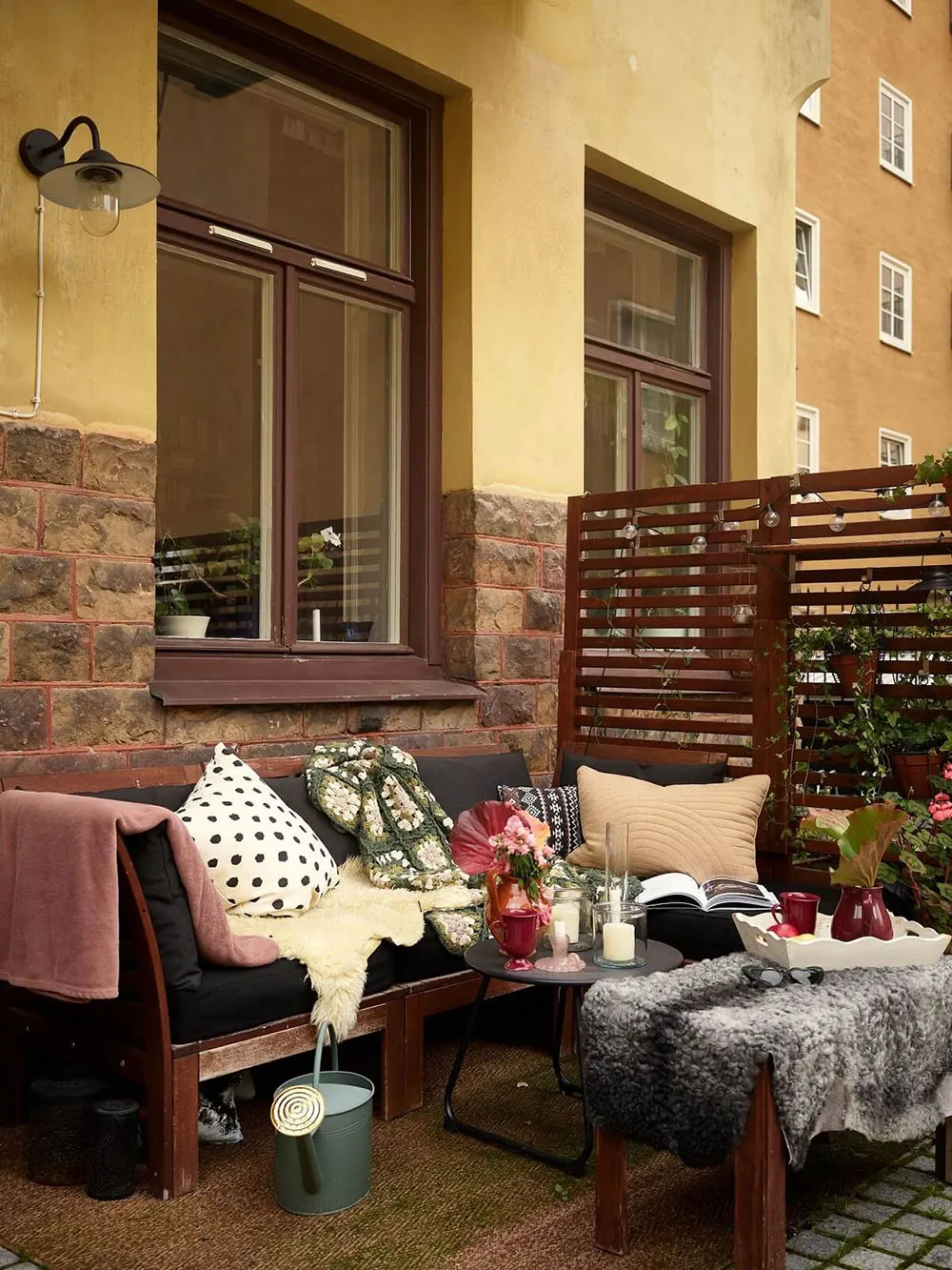 Textil colorido y decoración para una acogedora casa de campo sueca