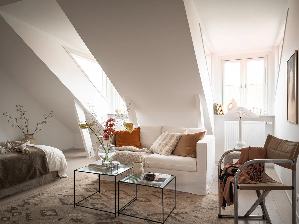 Pequeña mansarda con diseño abierto y decoración cálida (35 m²)