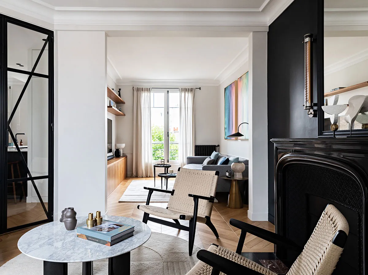 Diseño de interior en blanco y negro de un apartamento de dos plantas en París