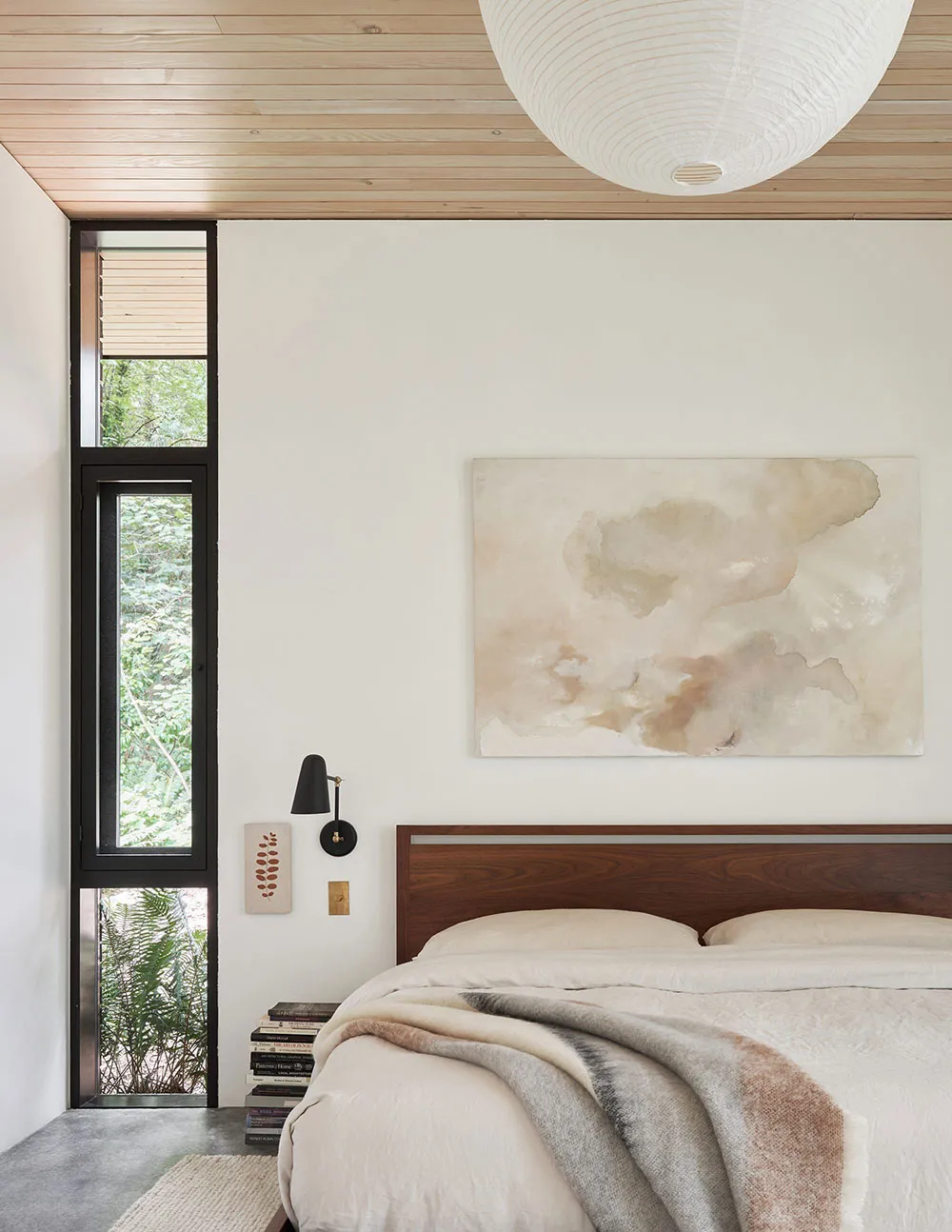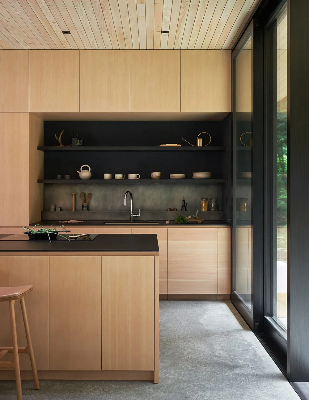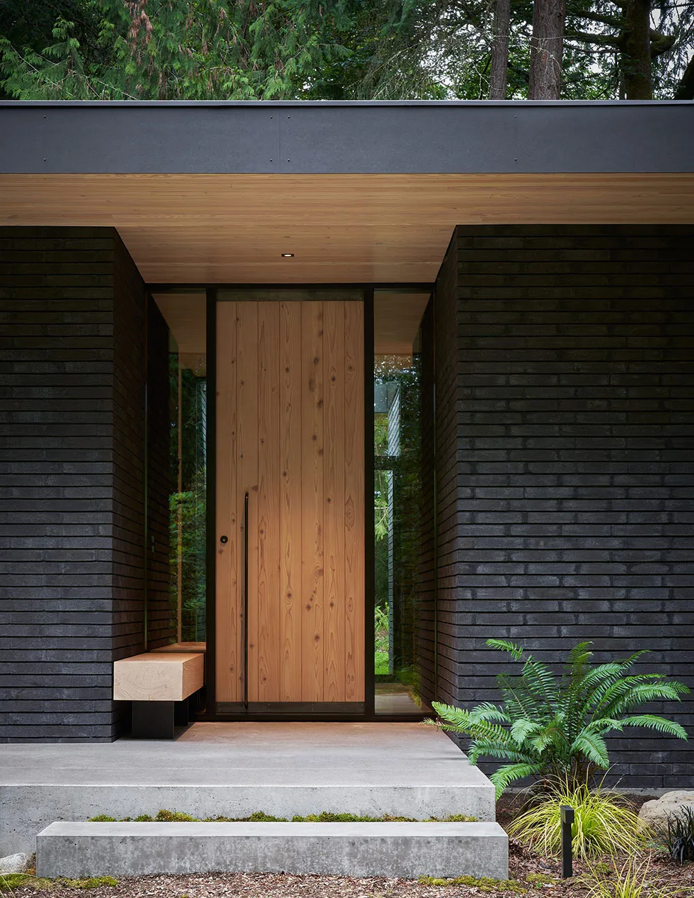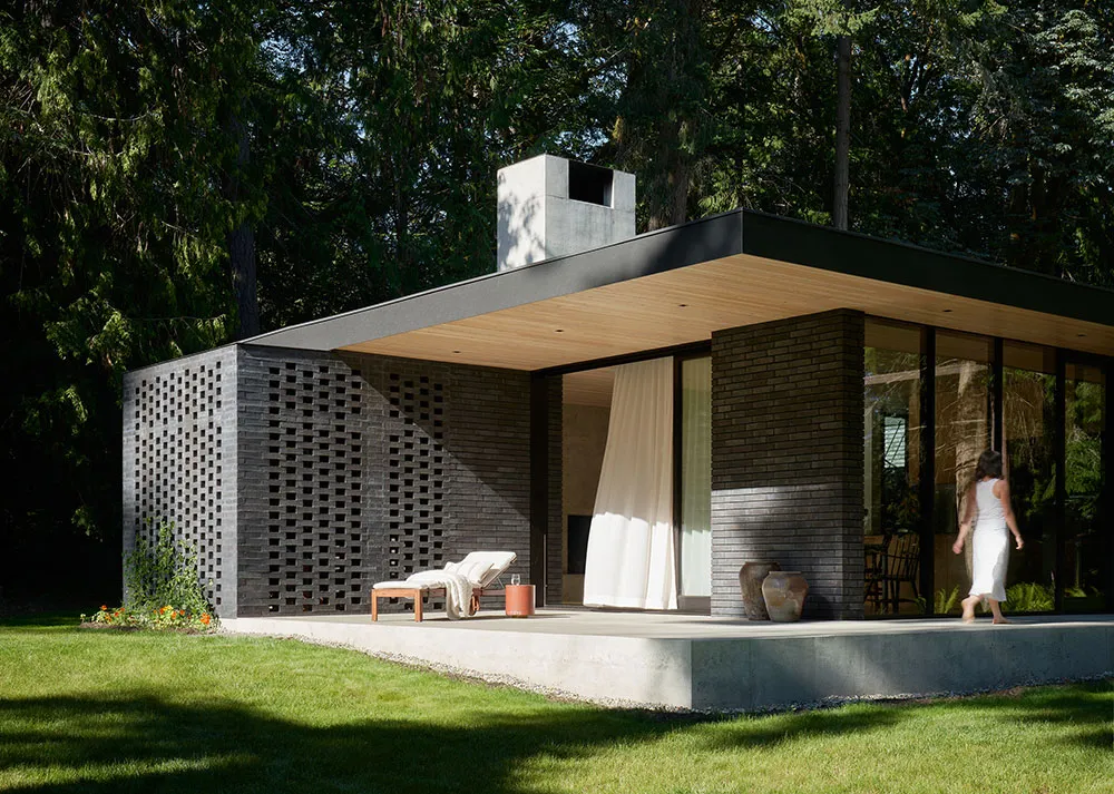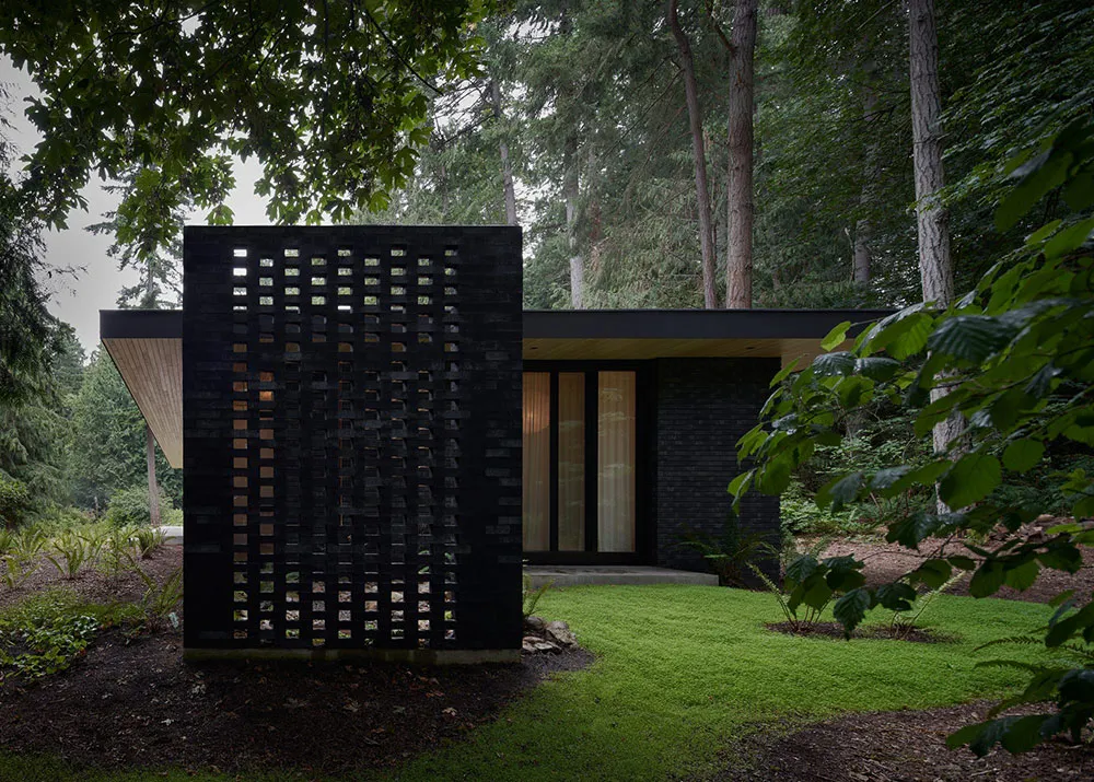 Esta moderna cabaña en el bosque cerca de Seattle parece bastante pequeña desde afuera: una estructura de un solo piso con materiales naturales se integra perfectamente en el paisaje local.