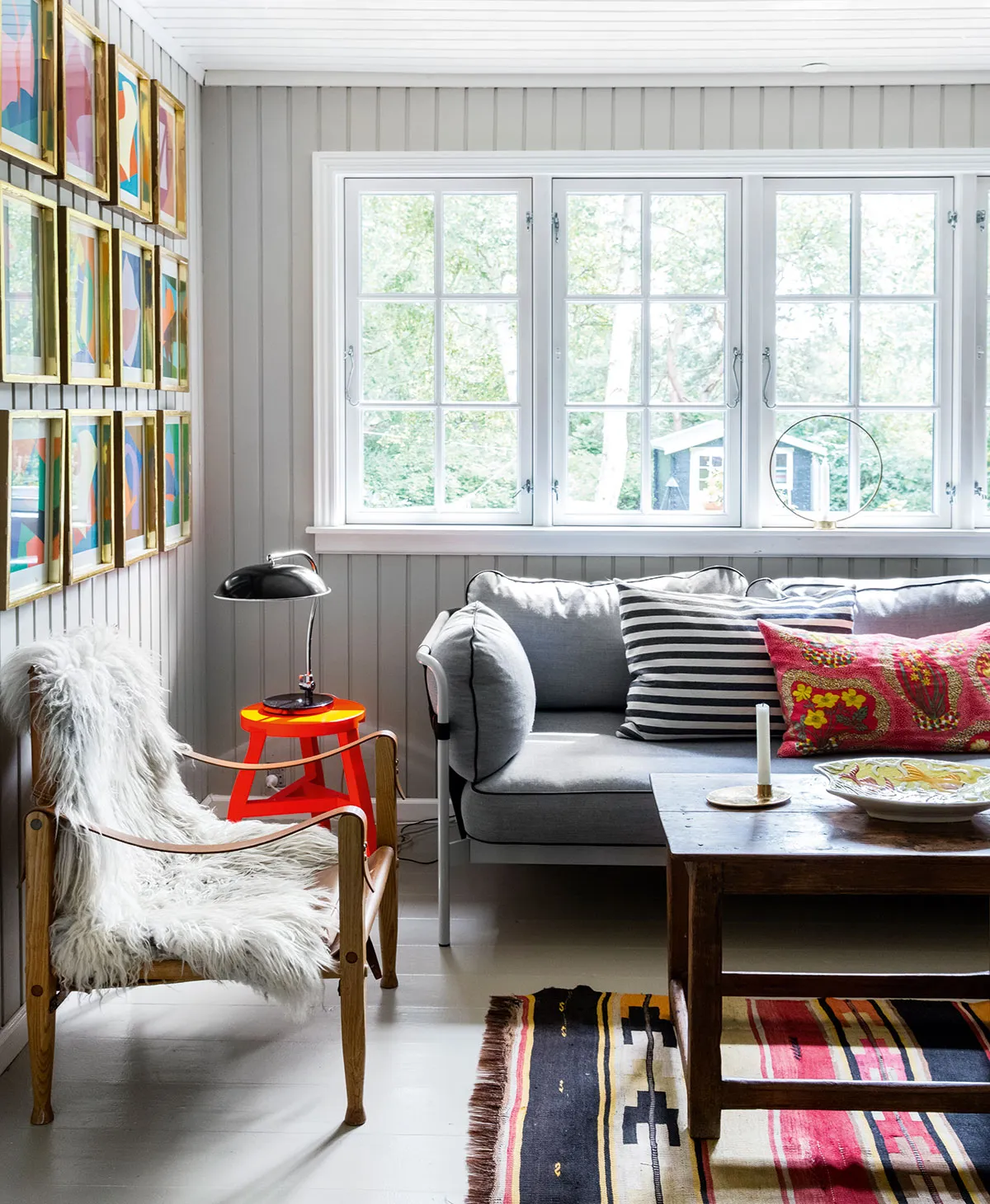 Textil colorido y decoración para una acogedora casa de campo sueca