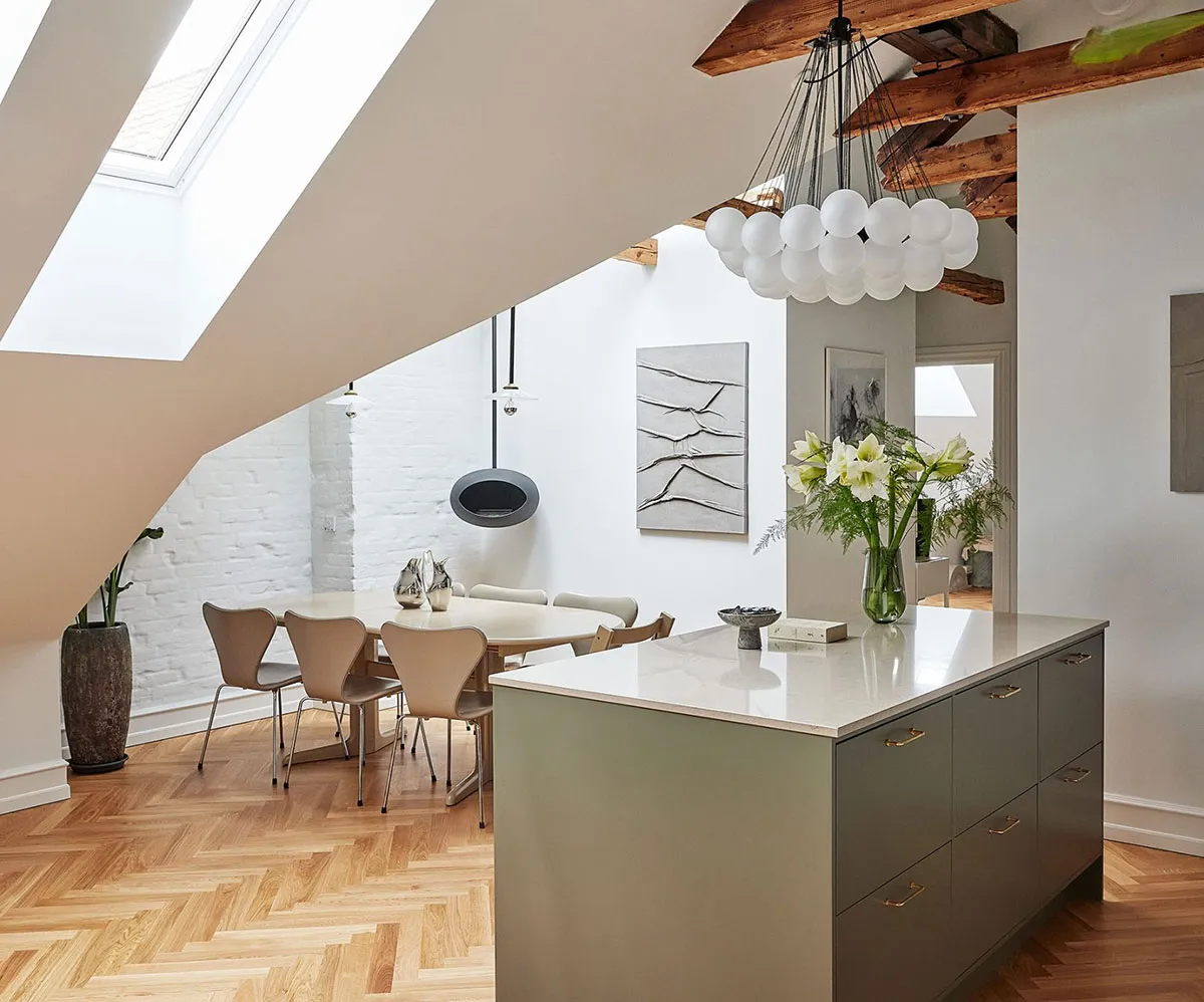 Estilo de apartamento con vigas bajo el techo de una villa histórica en Copenhague