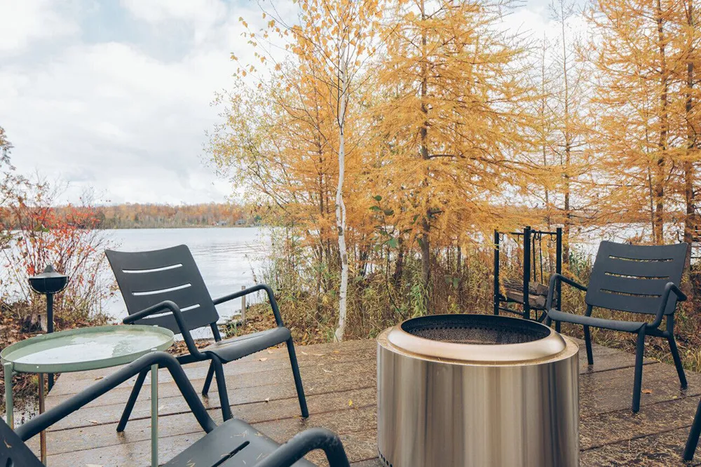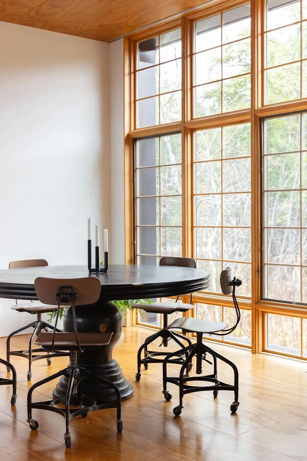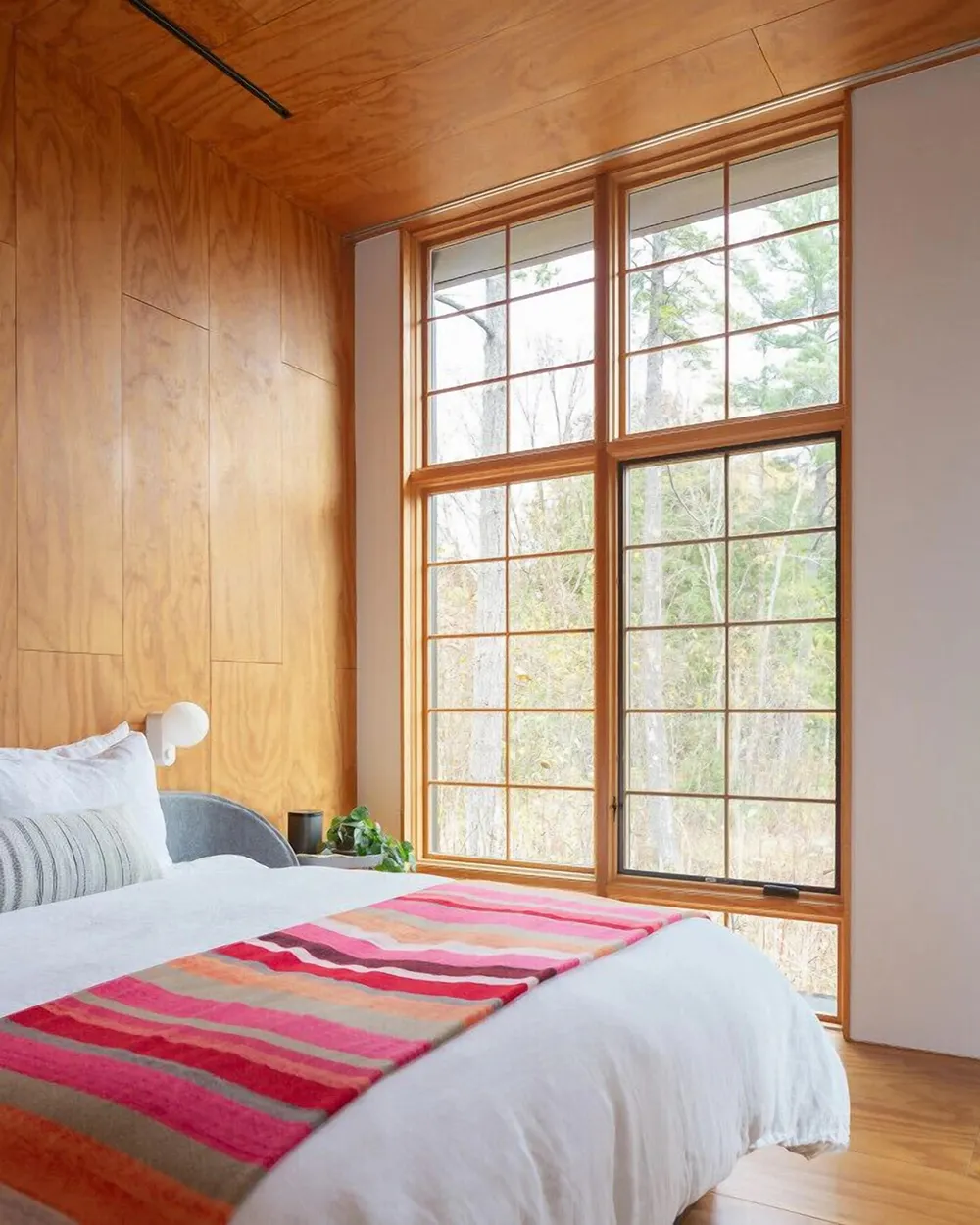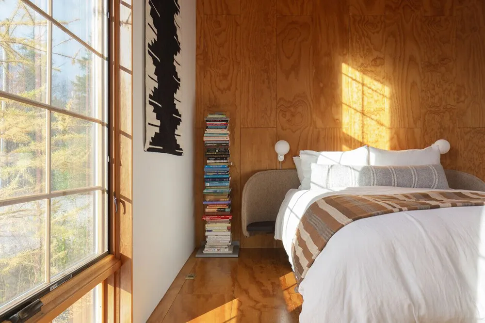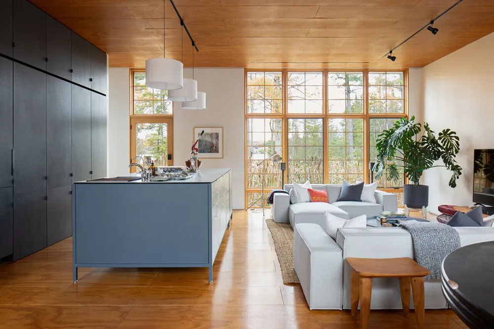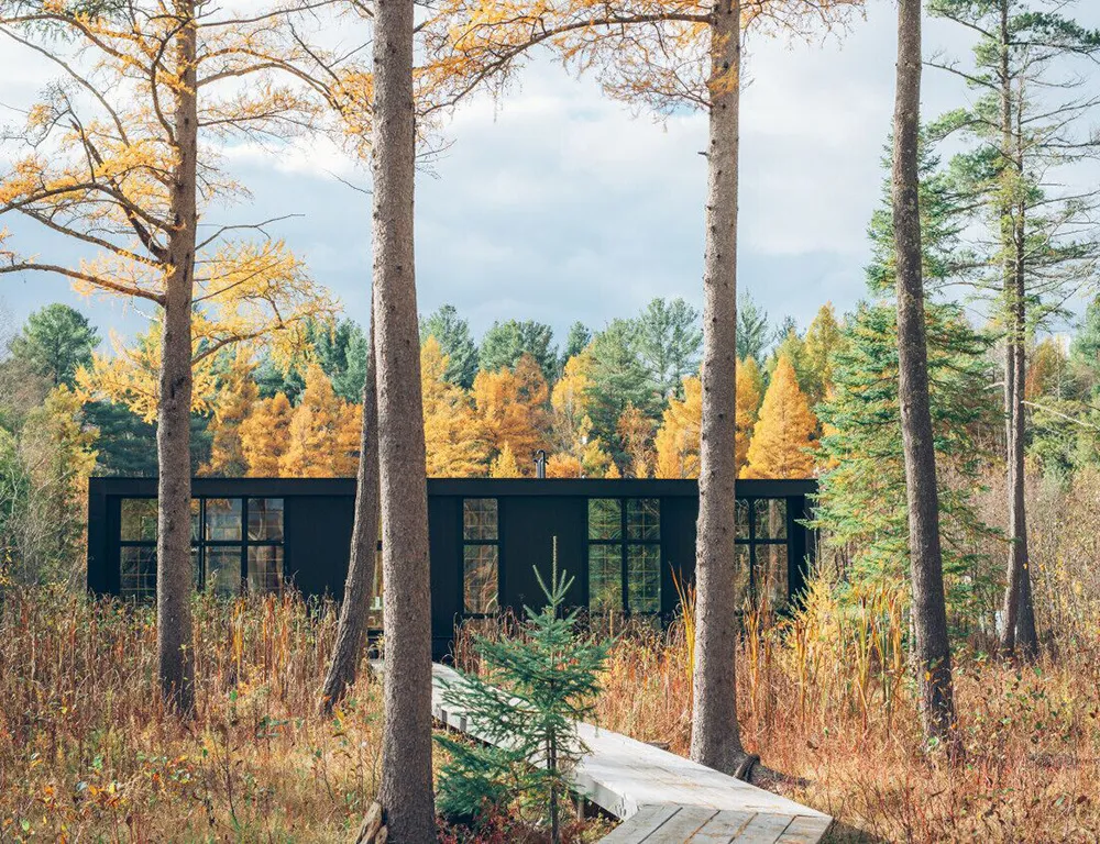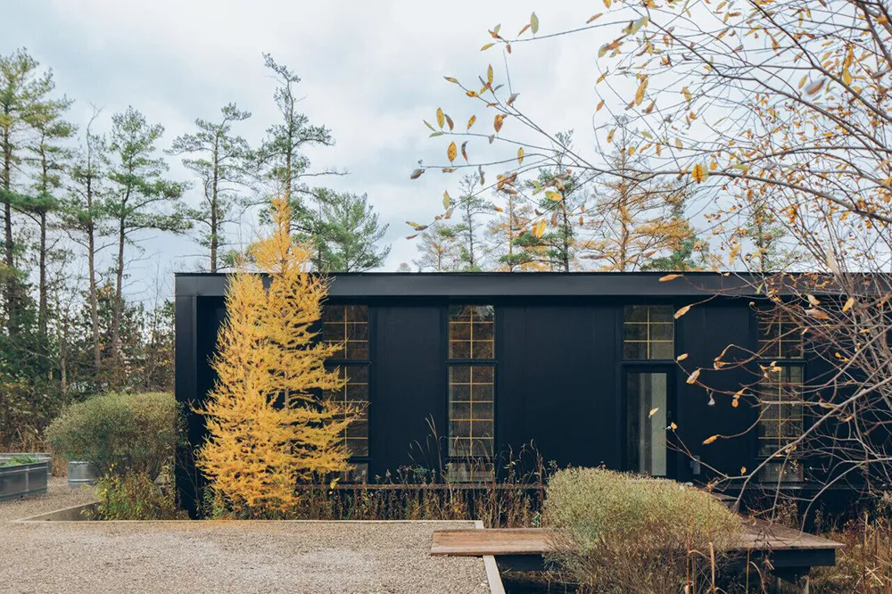 Esta moderna casa de campo con fachada rectangular negra es un oasis del estilo escandinavo en la orilla de un lago en el estado de Michigan.
