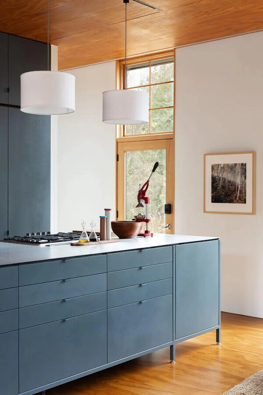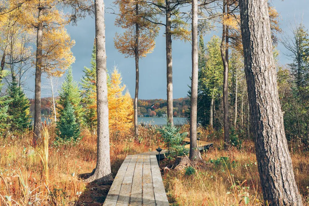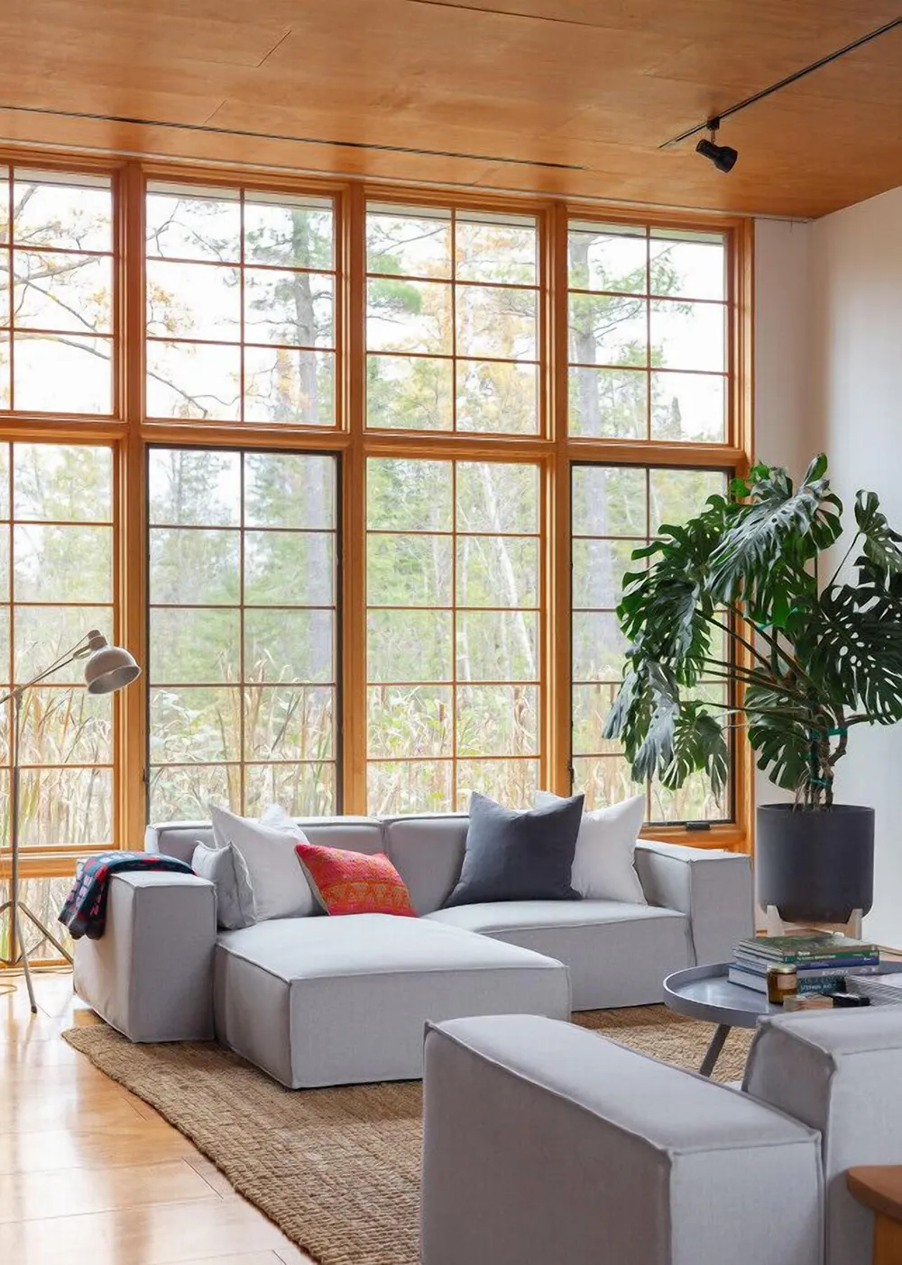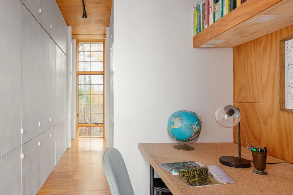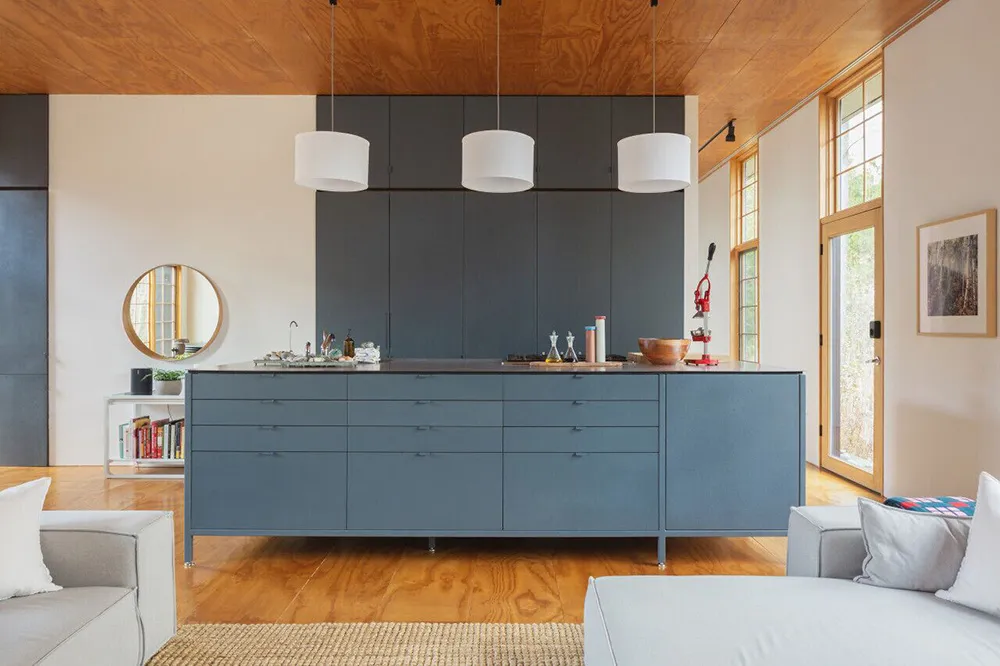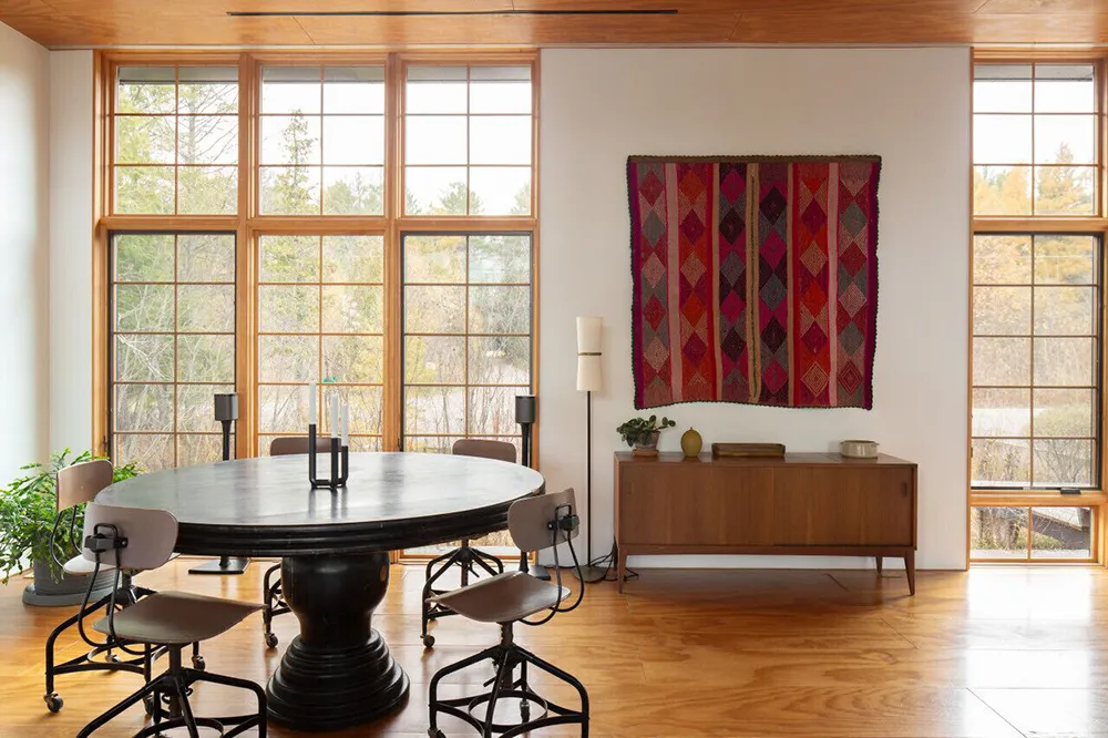 Esta moderna casa de campo con fachada rectangular negra es un oasis del estilo escandinavo en la orilla de un lago en el estado de Michigan.