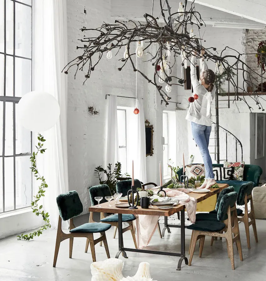 Lámpara viva y guirnaldas de abeto en un interior navideño