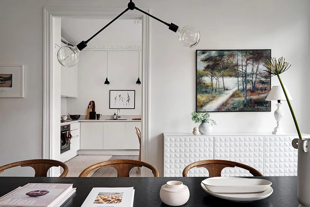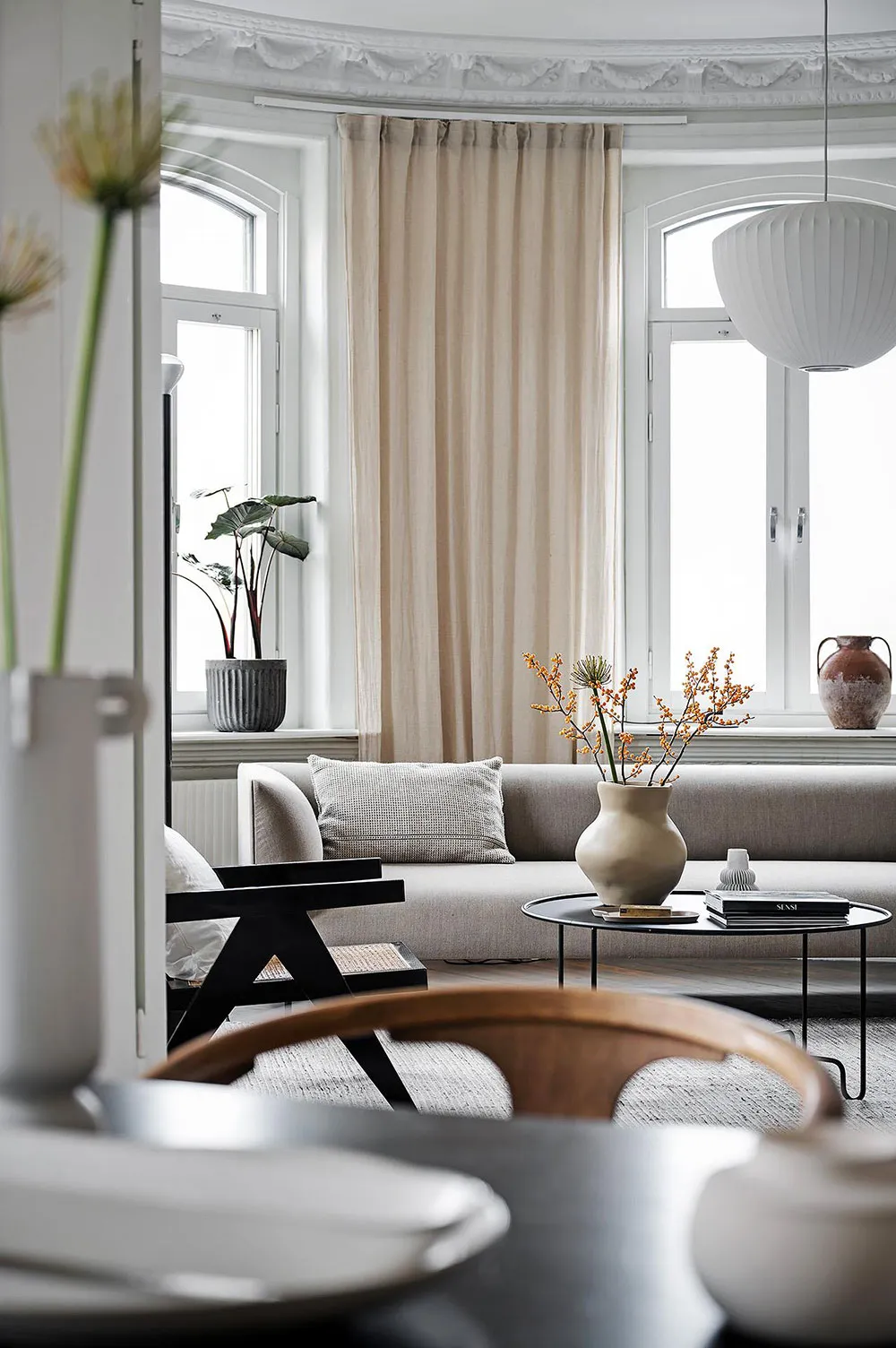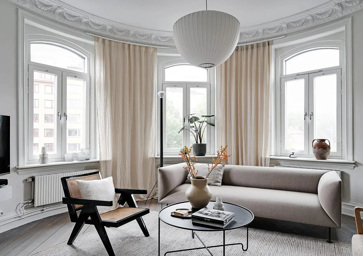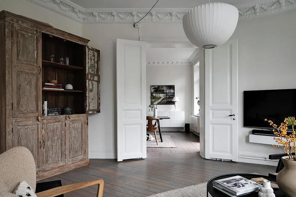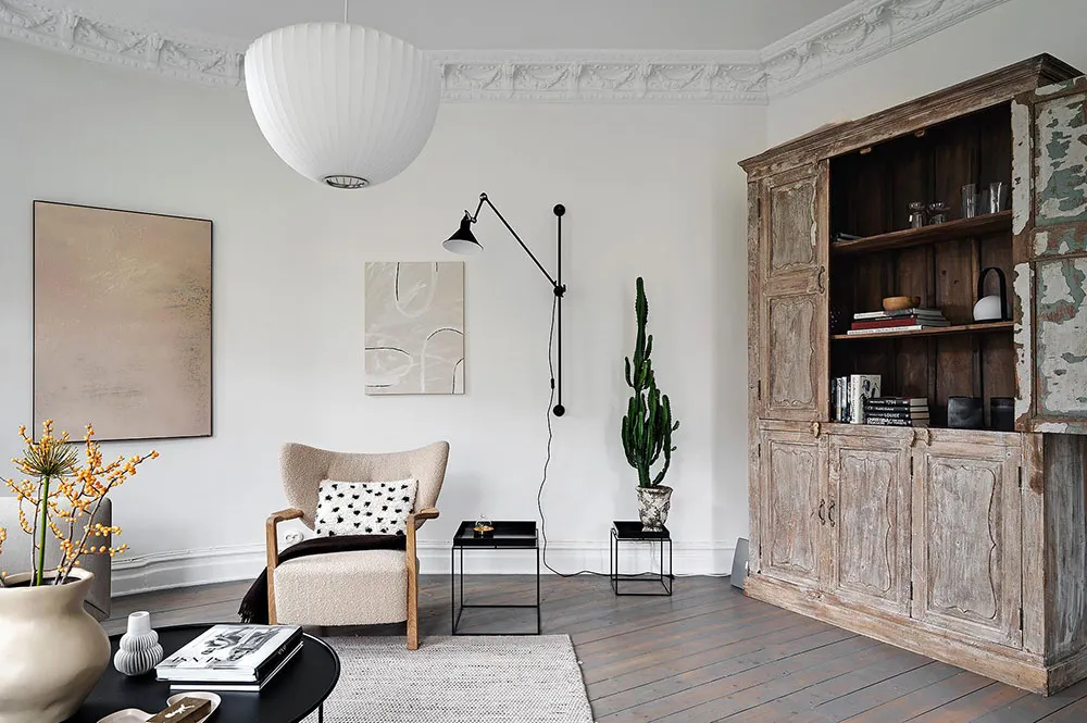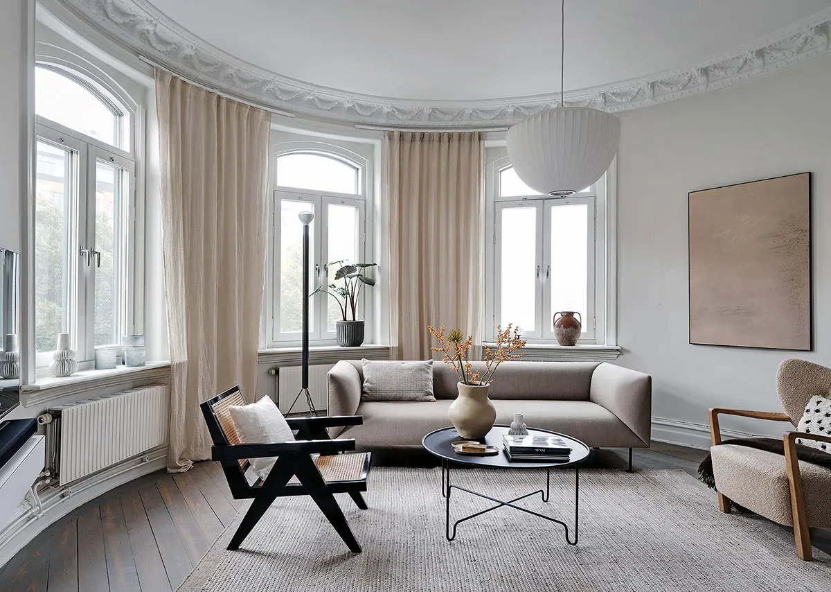 Sala redonda y vitrina de libros vintage: un interior elegante en Suecia