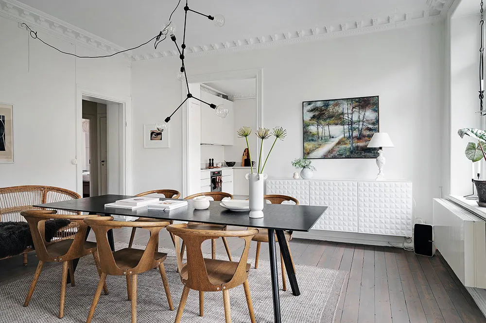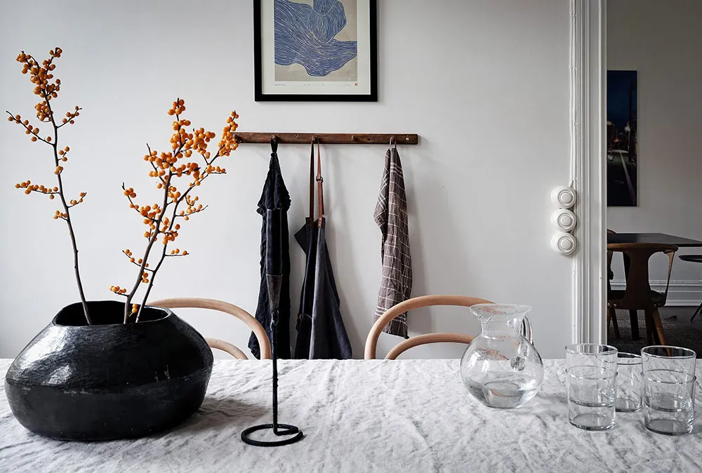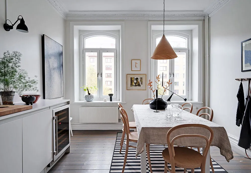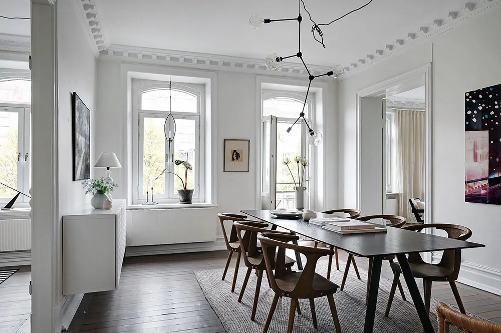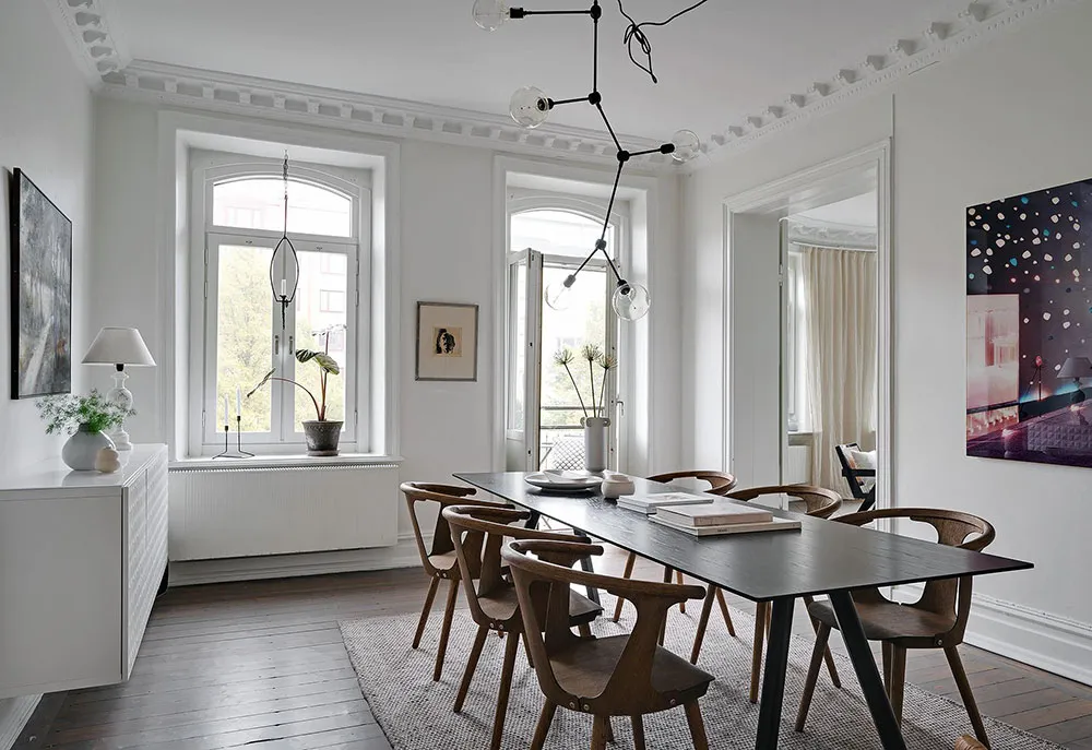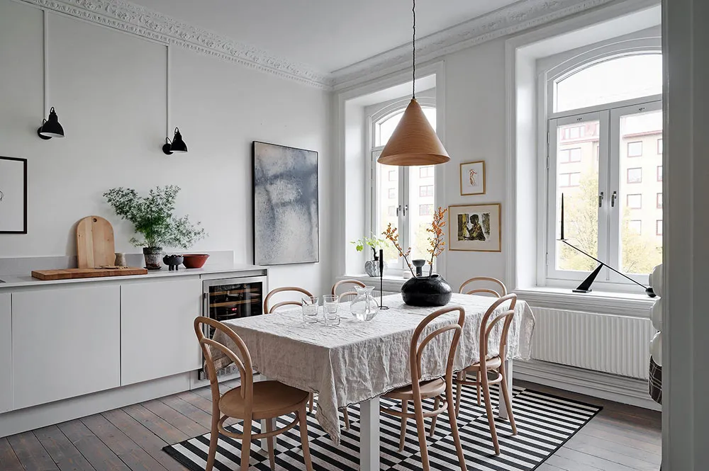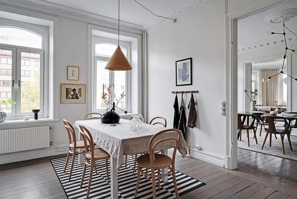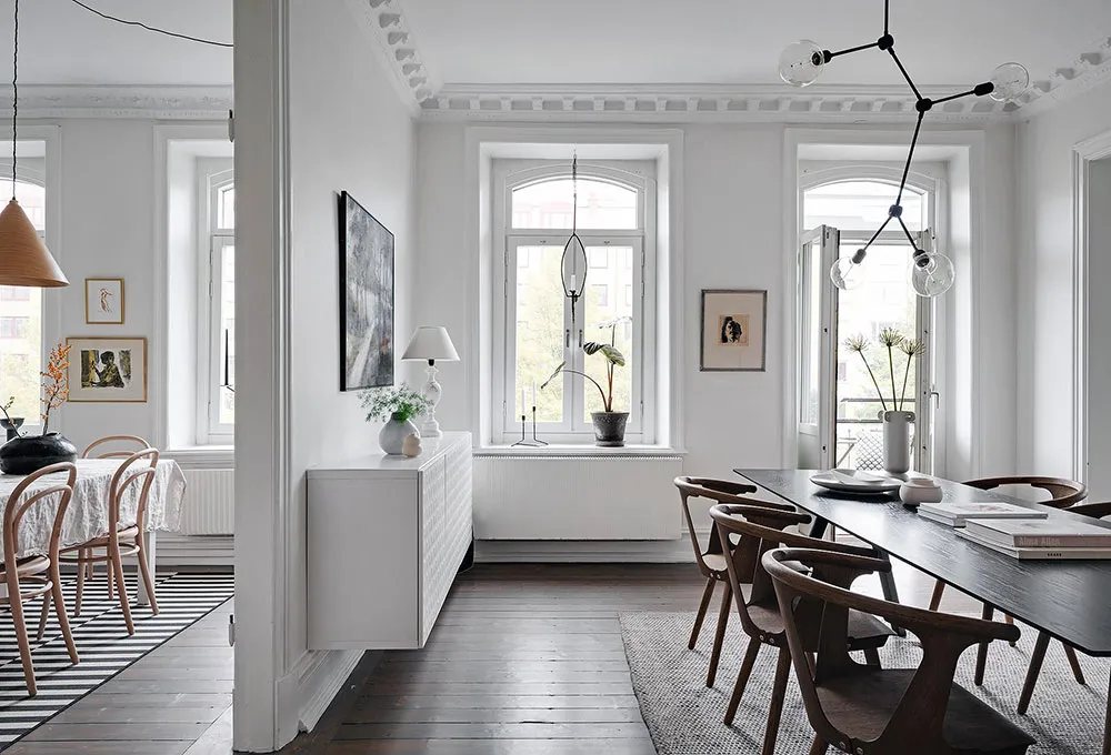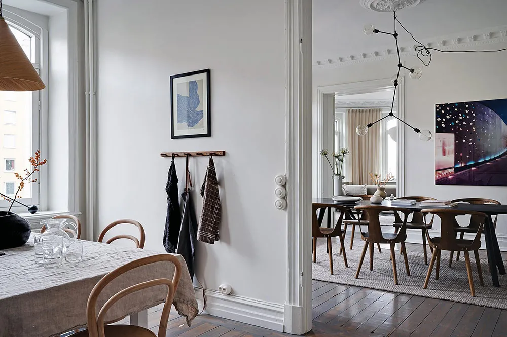 Sala redonda y vitrina de libros vintage: un interior elegante en Suecia