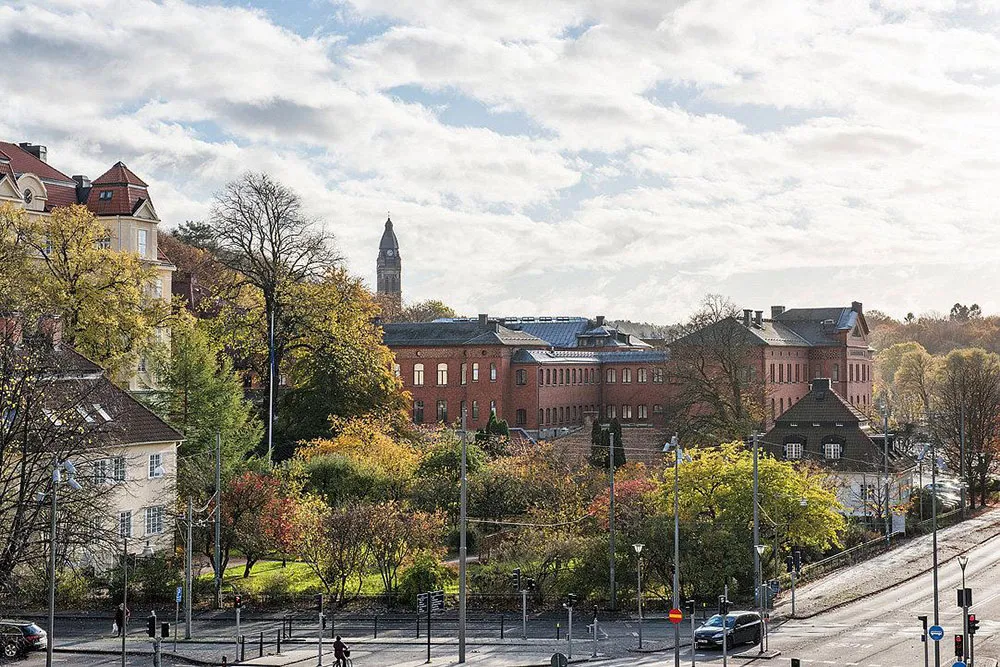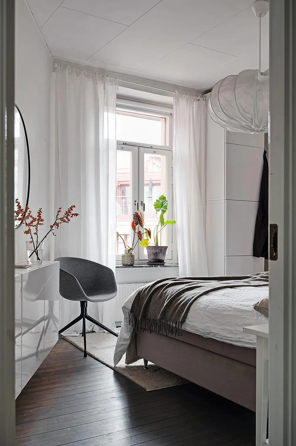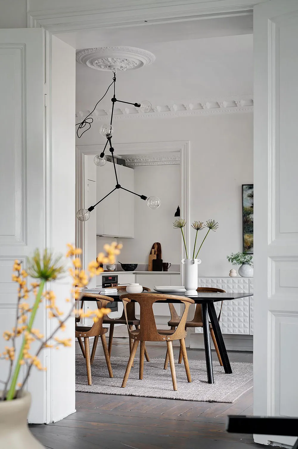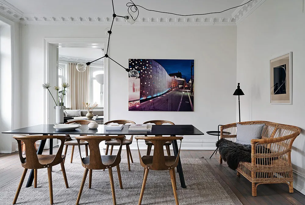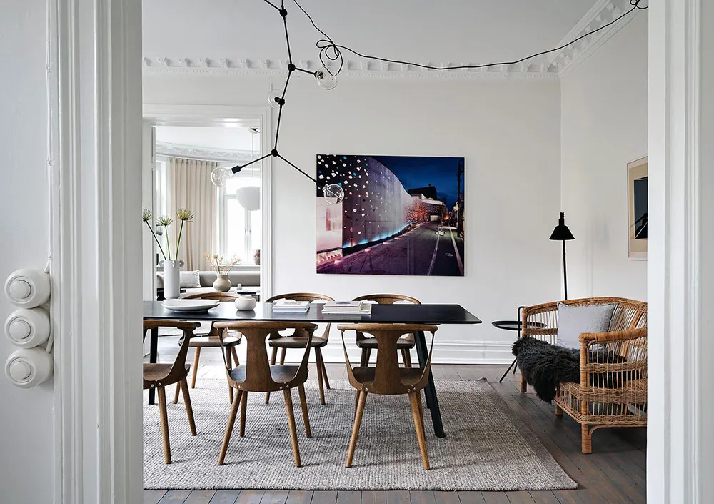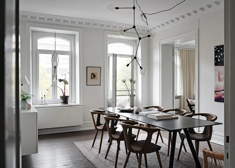 Sala redonda y vitrina de libros vintage: un interior elegante en Suecia