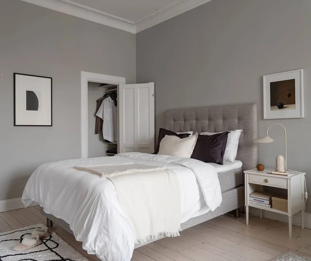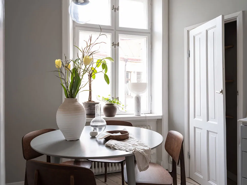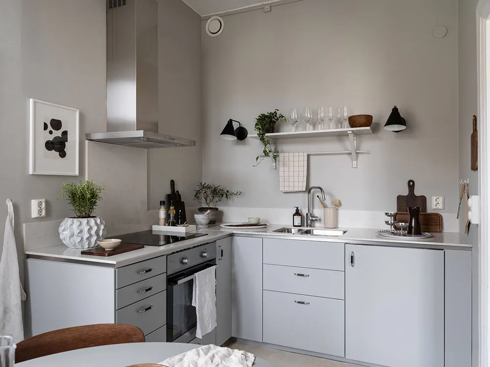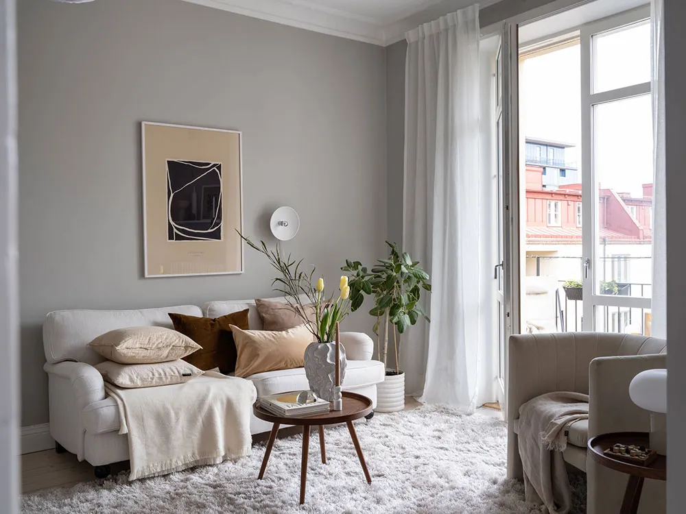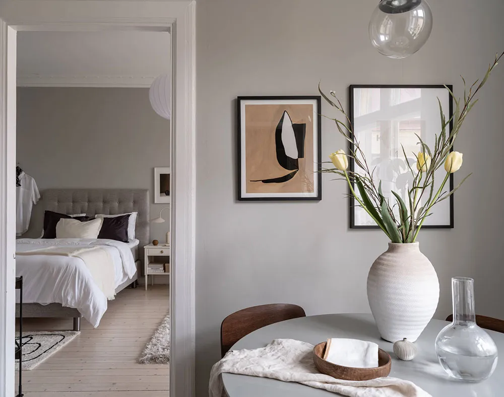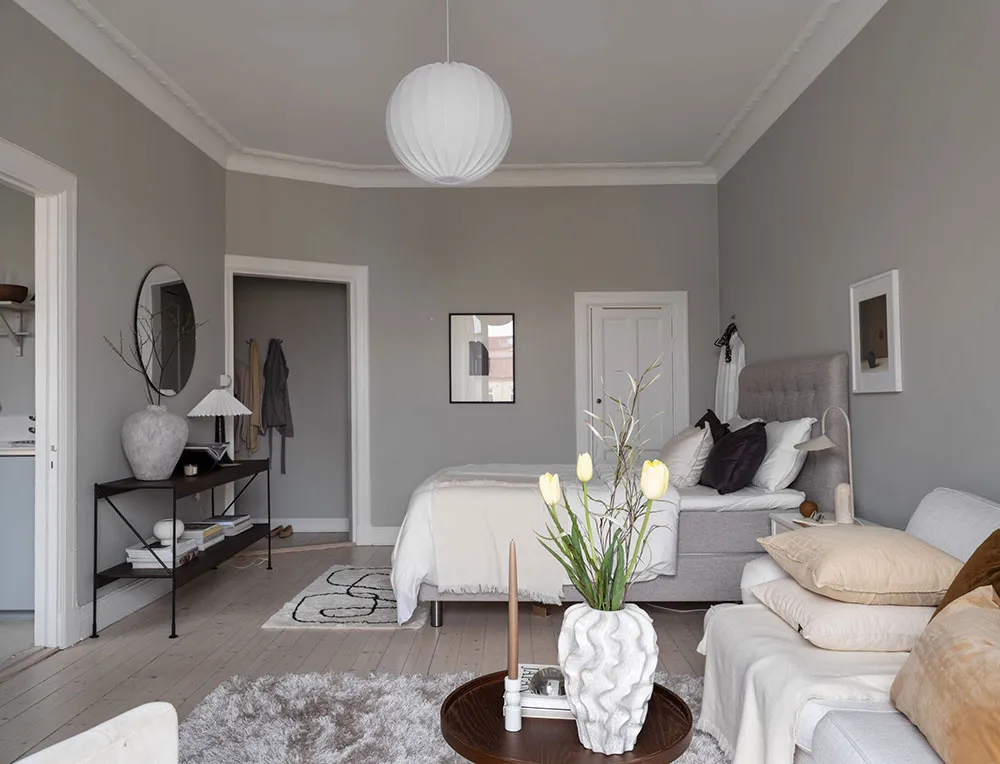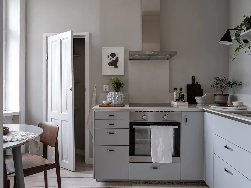 El color gris pastel, un toque de elegancia en la mobiliario y suaves acentos cálidos: esa es la receta del éxito de este agradable interior de una pequeña vivienda en Suecia.