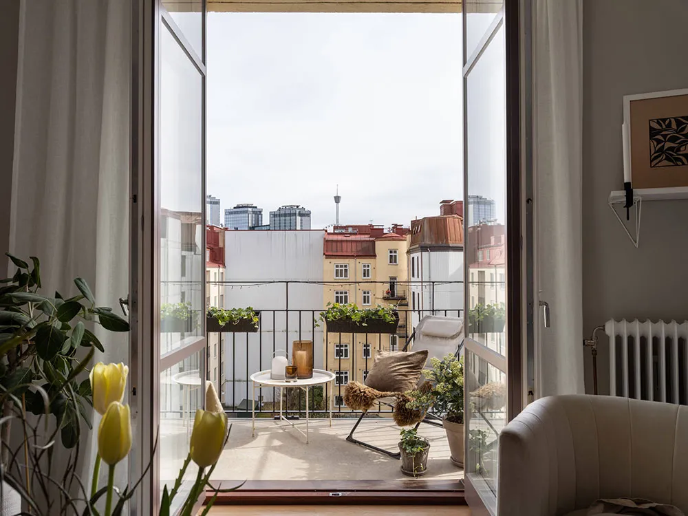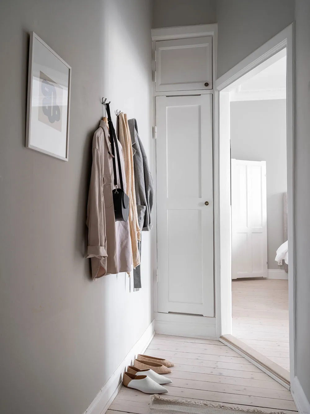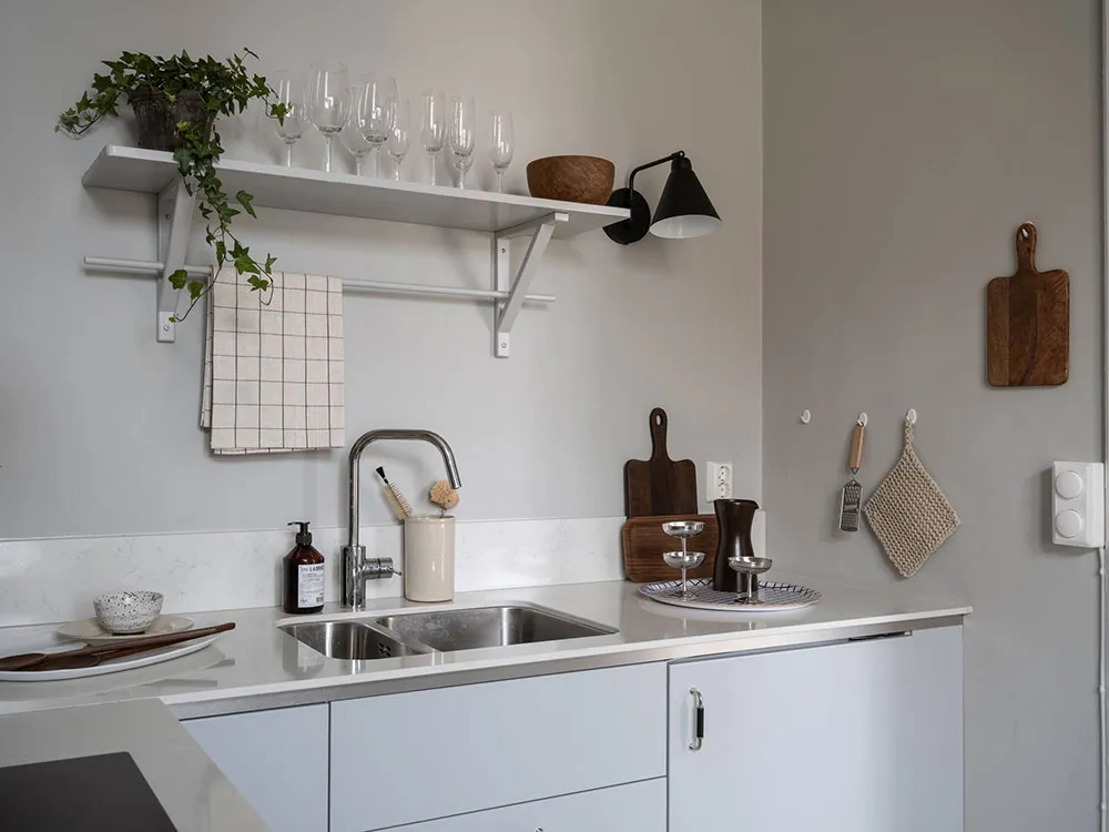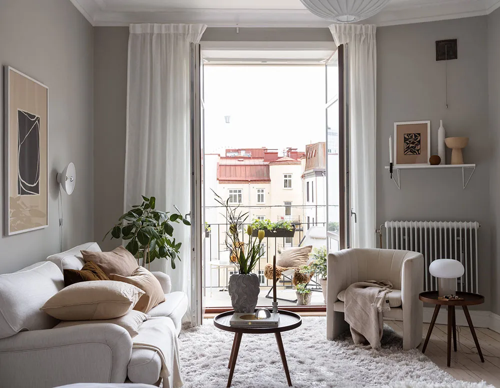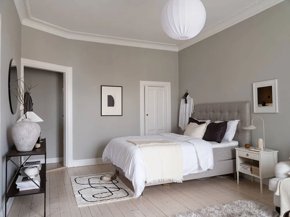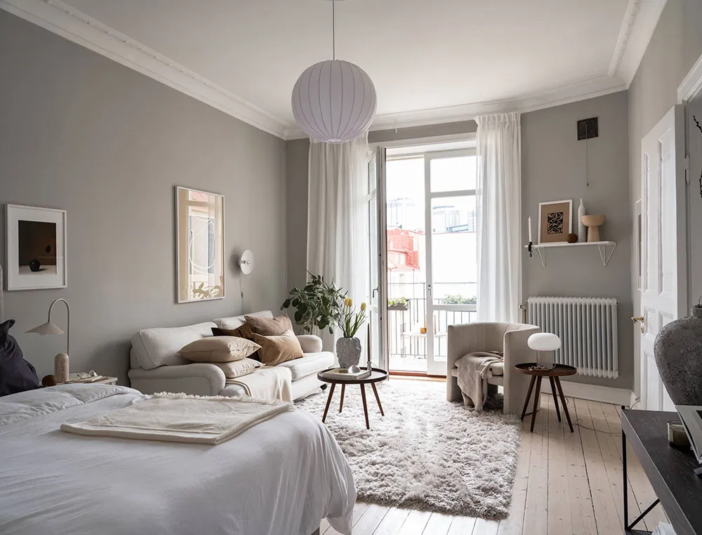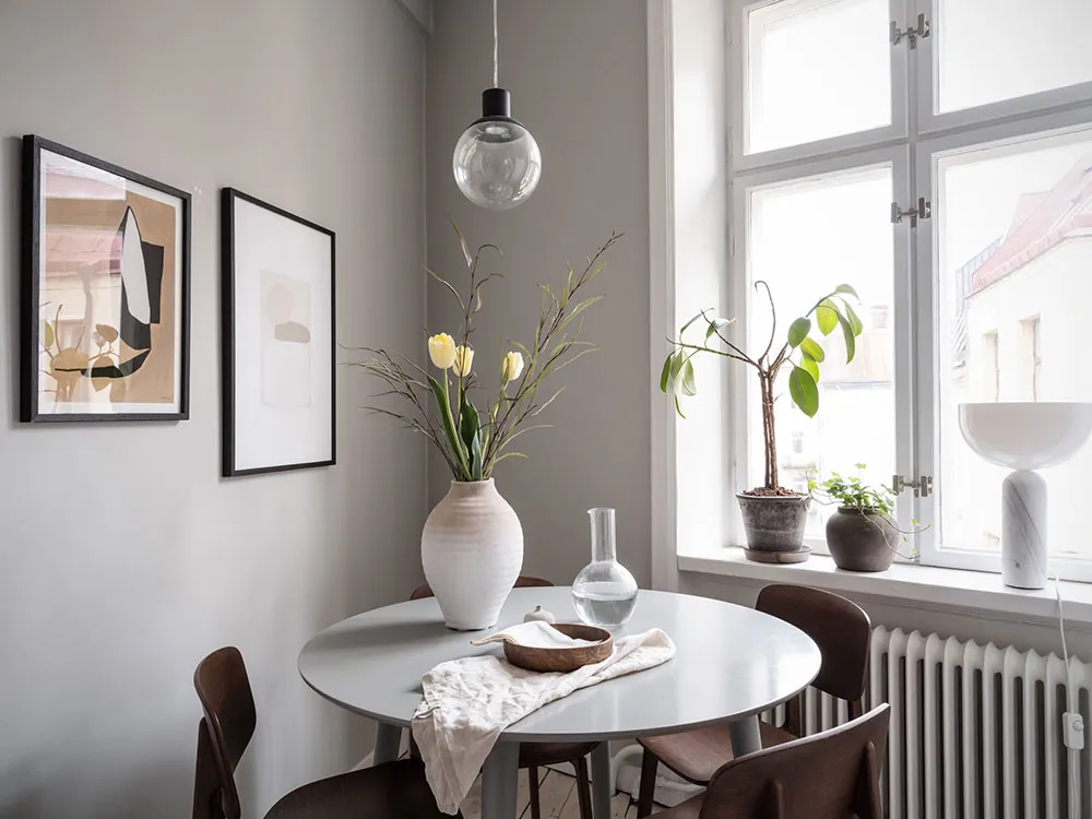 El color gris pastel, un toque de elegancia en la mobiliario y suaves acentos cálidos: esa es la receta del éxito de este agradable interior de una pequeña vivienda en Suecia.