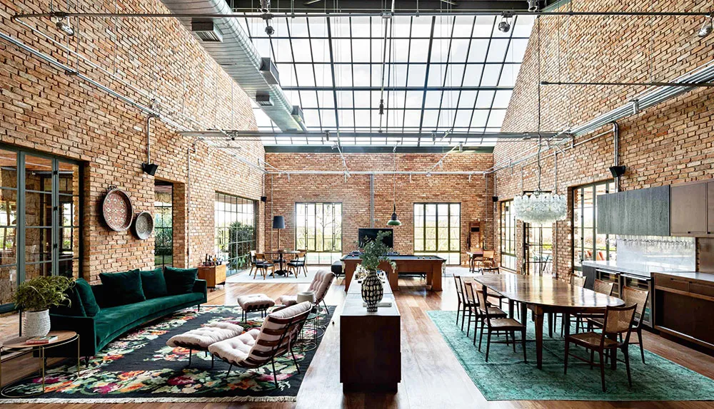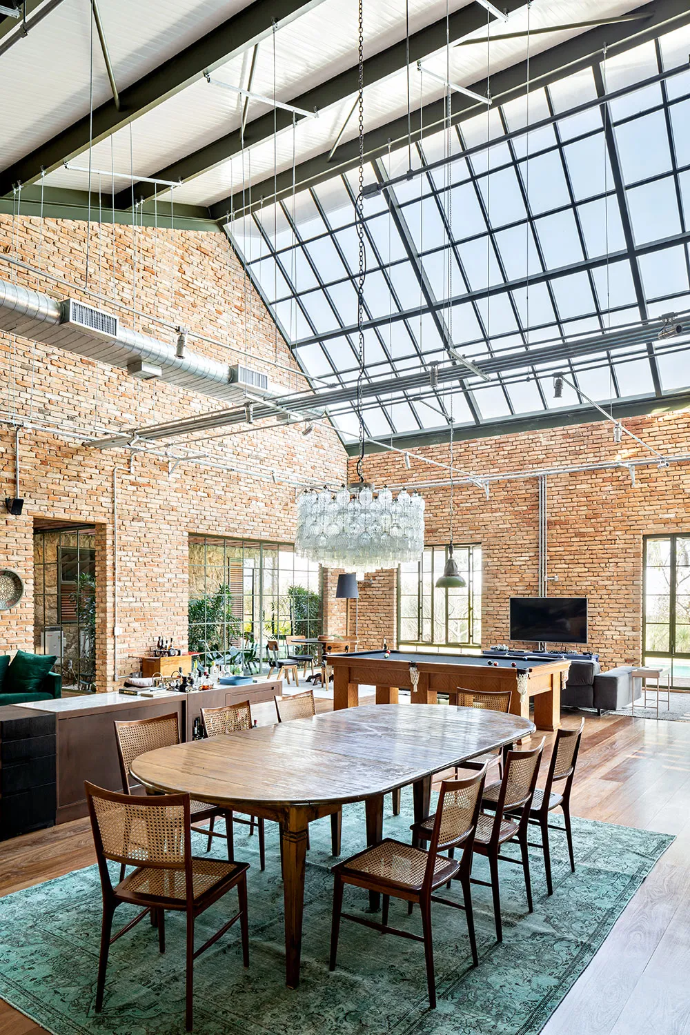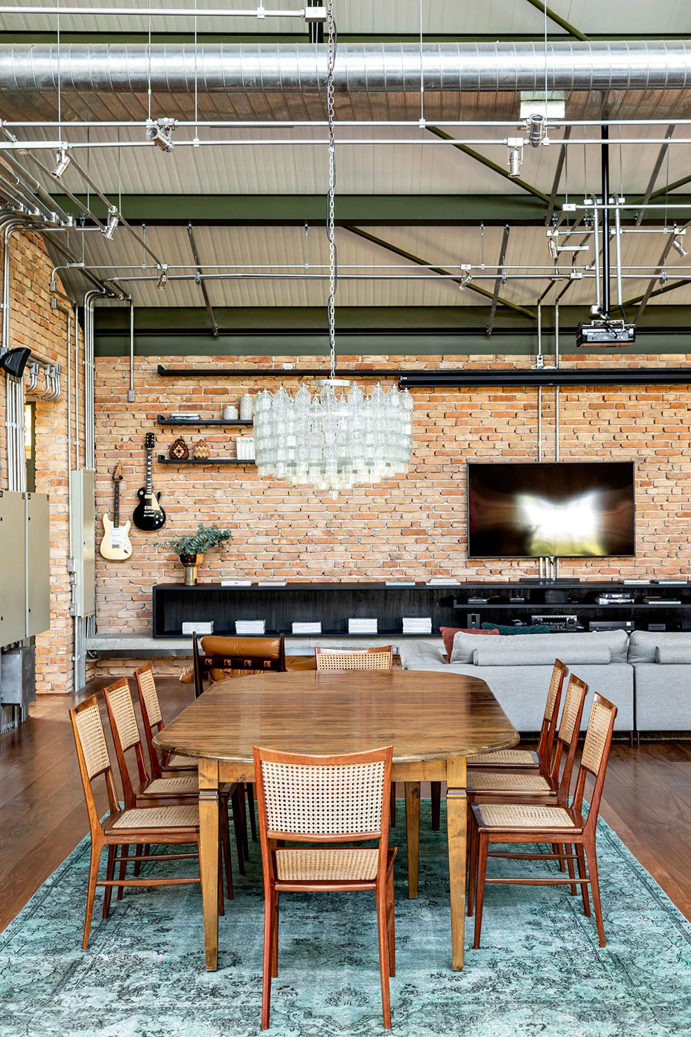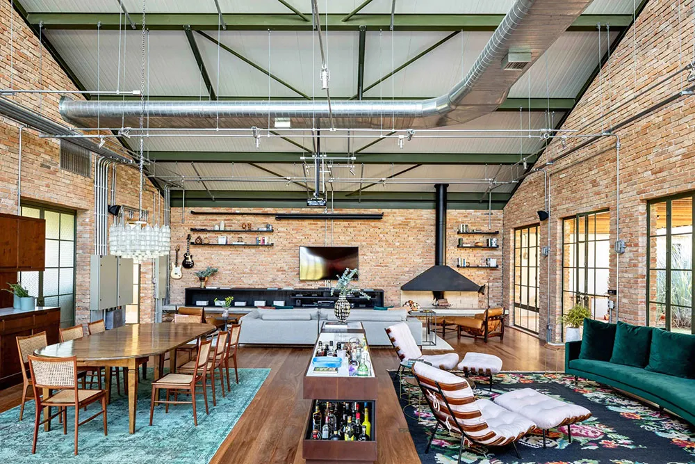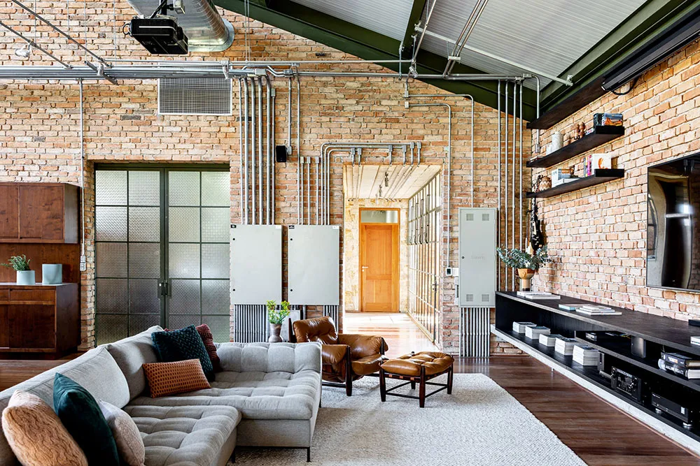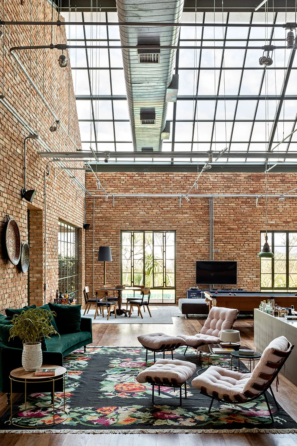 La amplia sala de estar de esta casa en Brasil luce como un antiguo almacén o taller industrial convertido en vivienda: techo alto (parcialmente de vidrio), gran espacio abierto con varias zonas funcionales y paredes de ladrillo rojo.