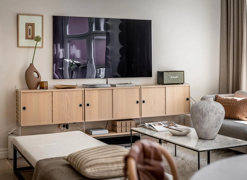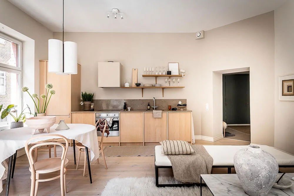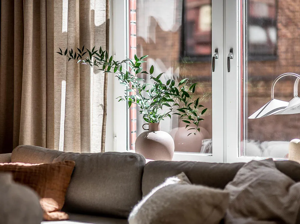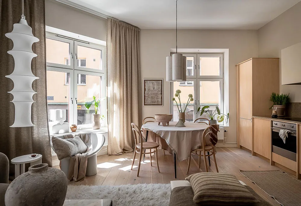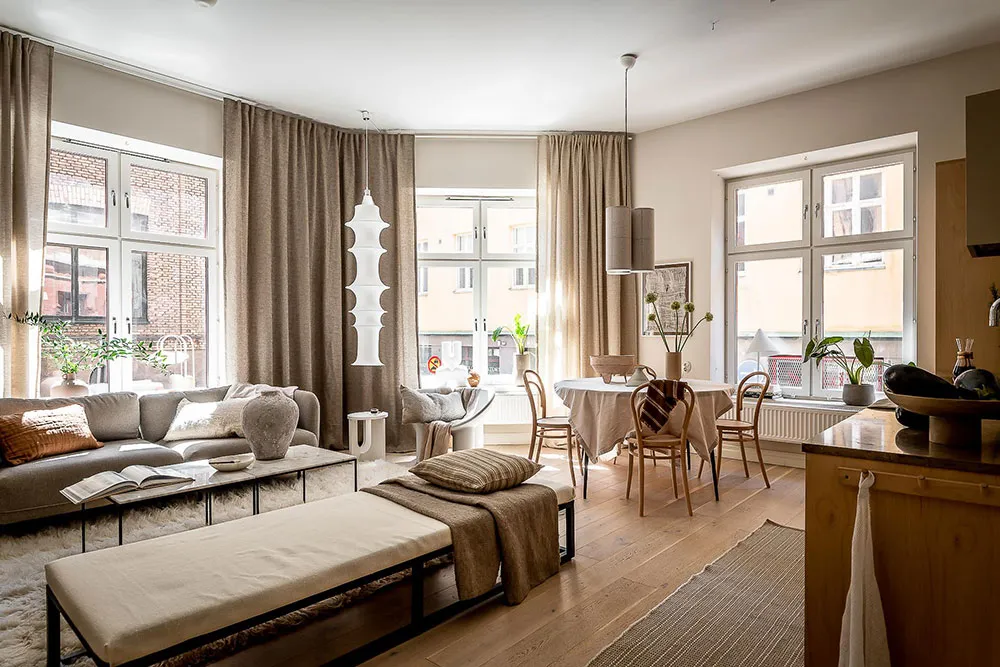El diseño de esta casa sueca transmite mucha calidez, y la razón es evidente: los diseñadores utilizaron diferentes tonos de beige en las paredes, cortinas, mobiliario y textiles.