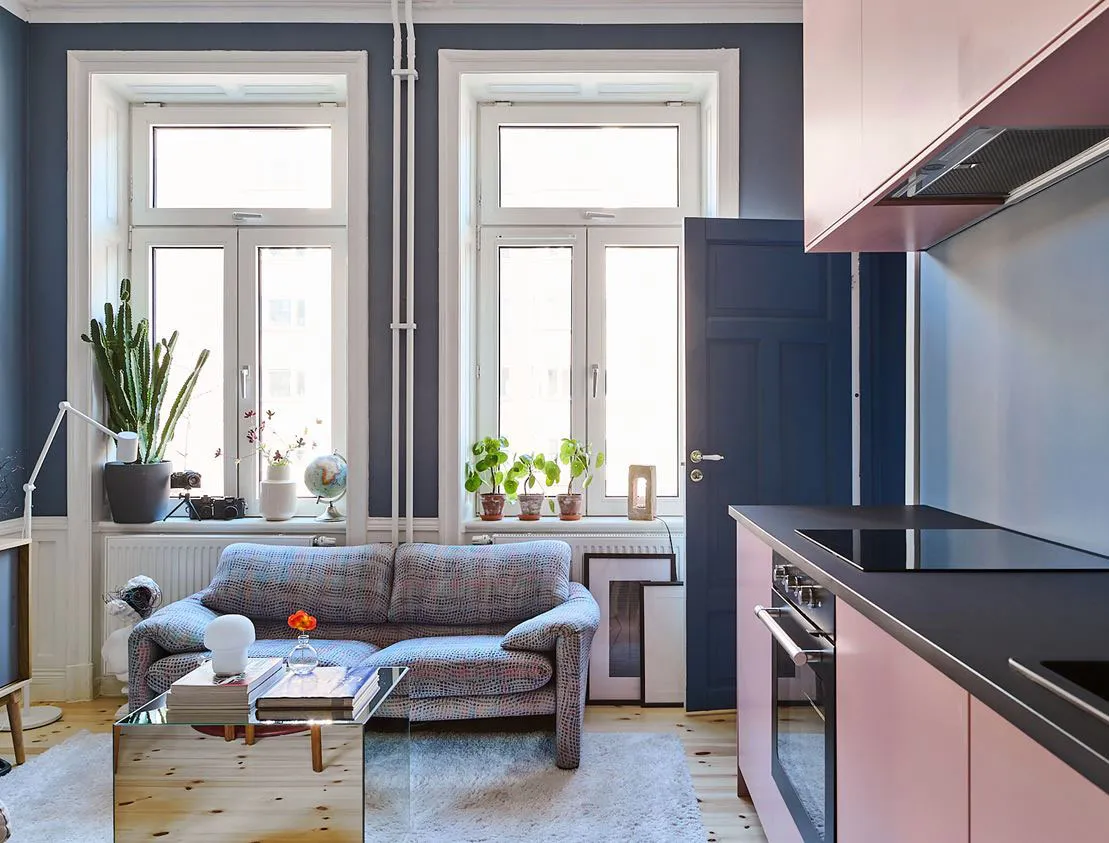 Increíble pequeña apartamento con paredes azules y decoración artística (33 m²)