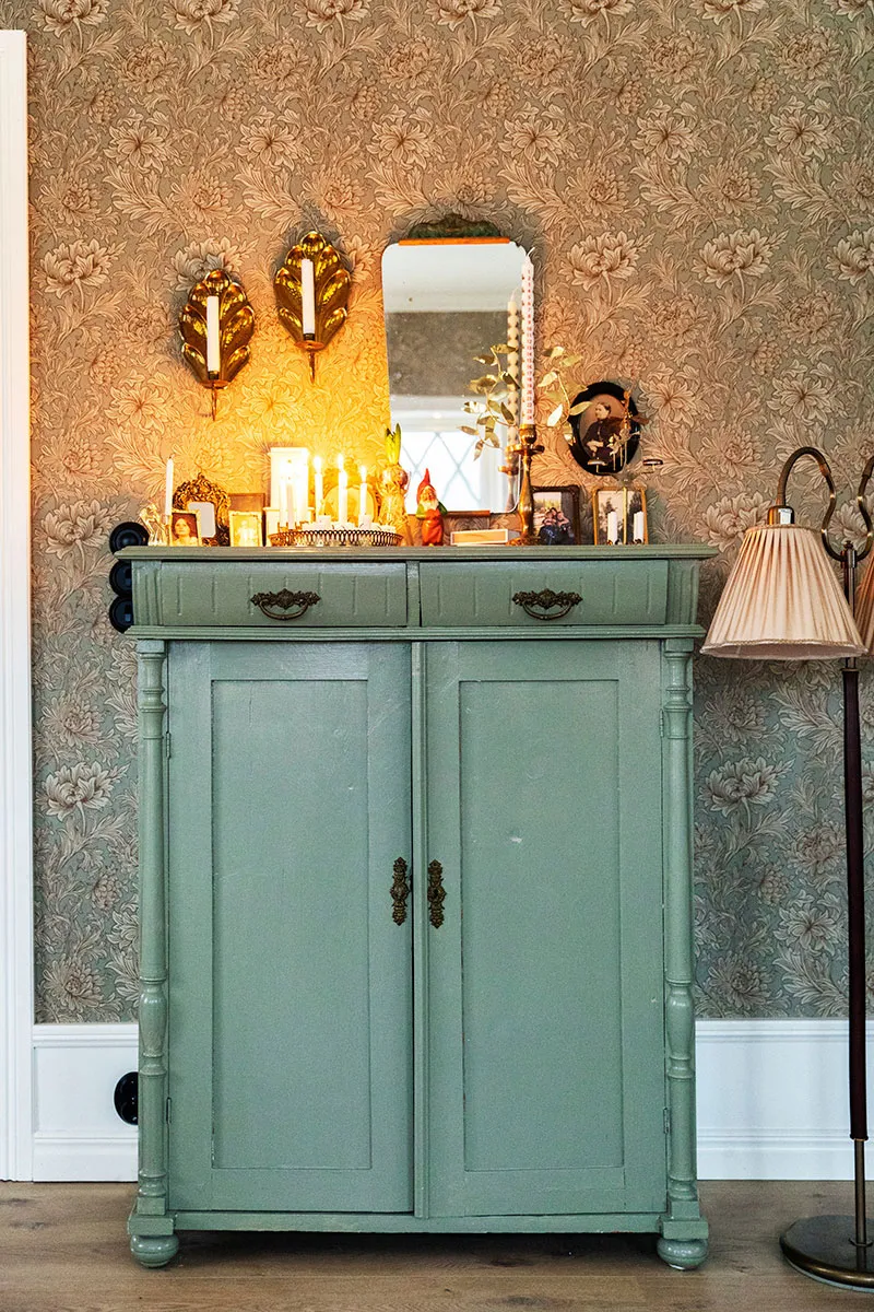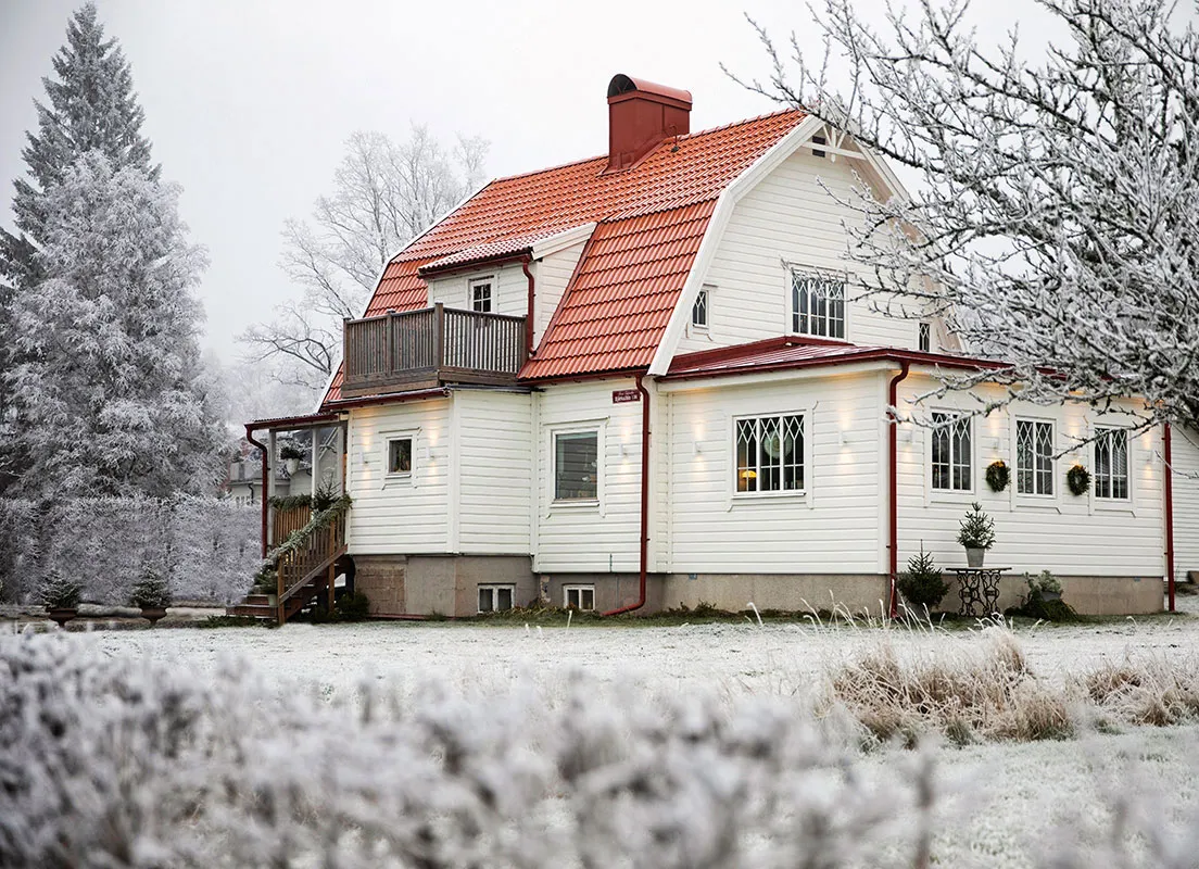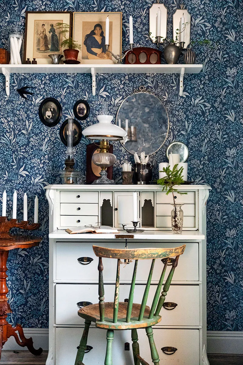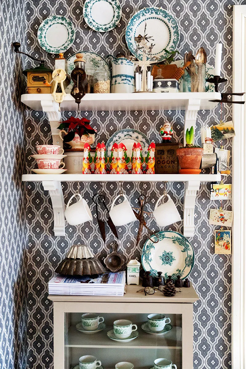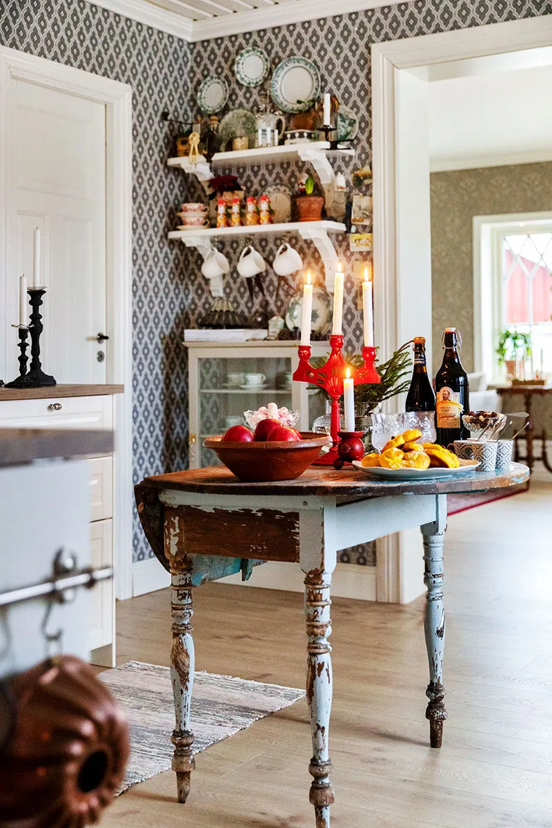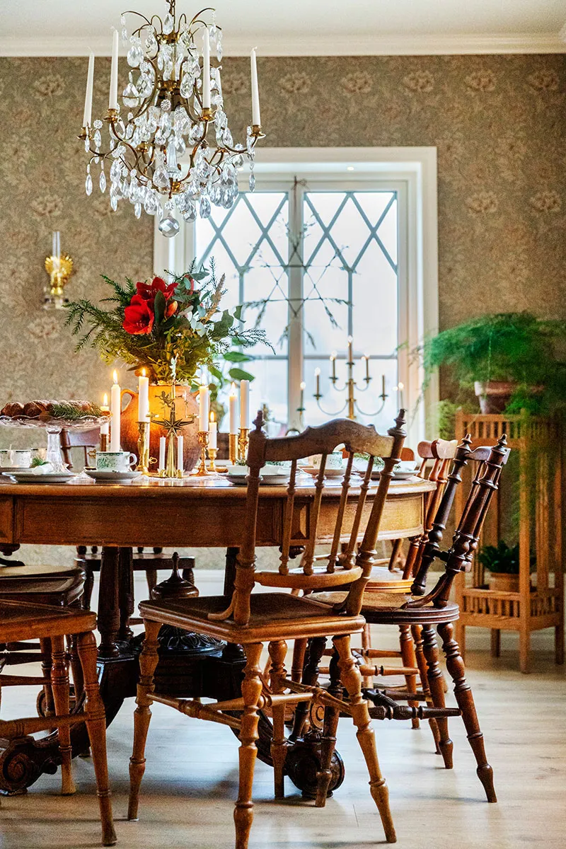 Los dueños de esta casa de los años 1920 en Grevsborg, Suecia, decoran su interior exclusivamente con objetos antiguos para las fiestas.