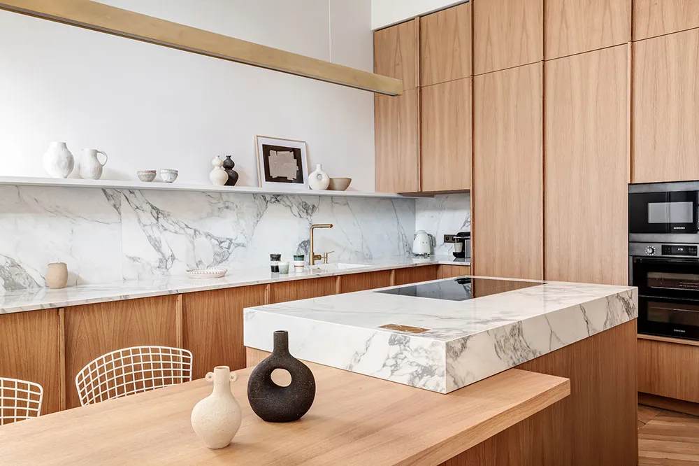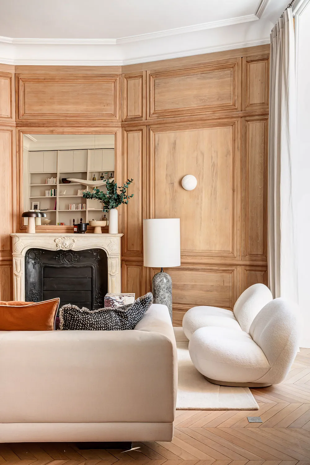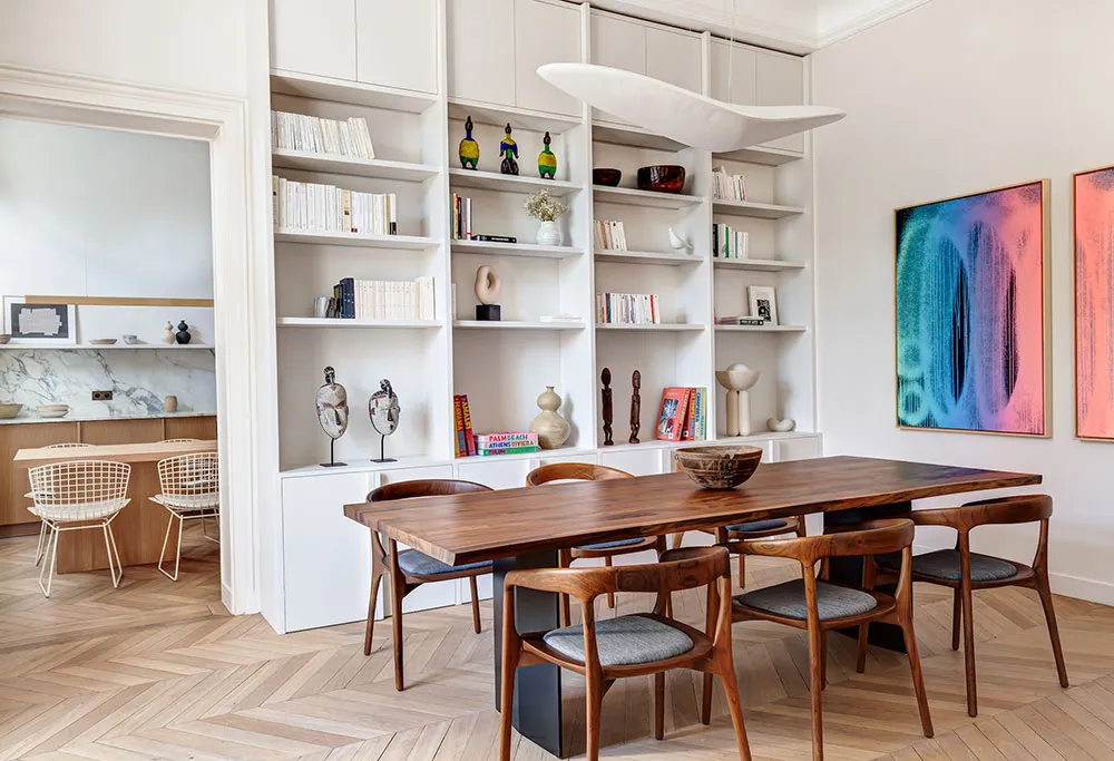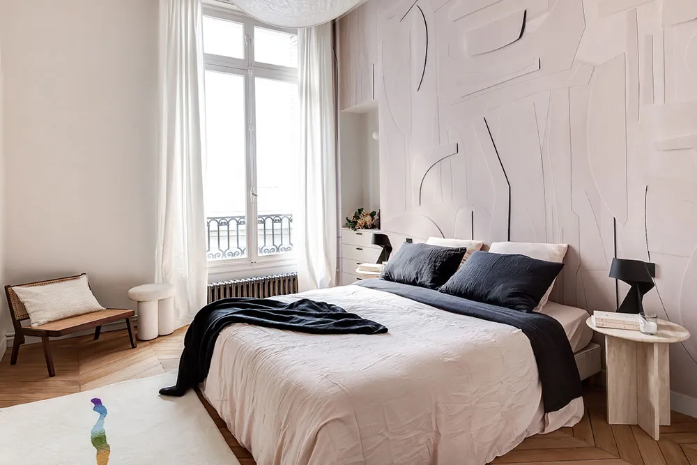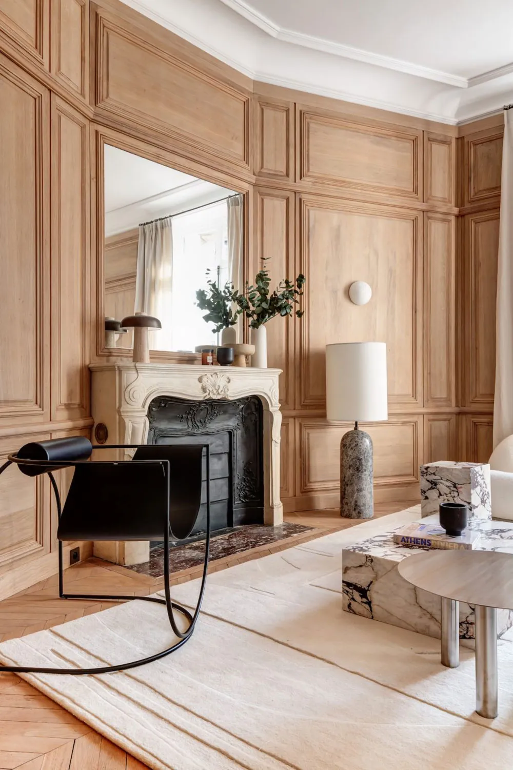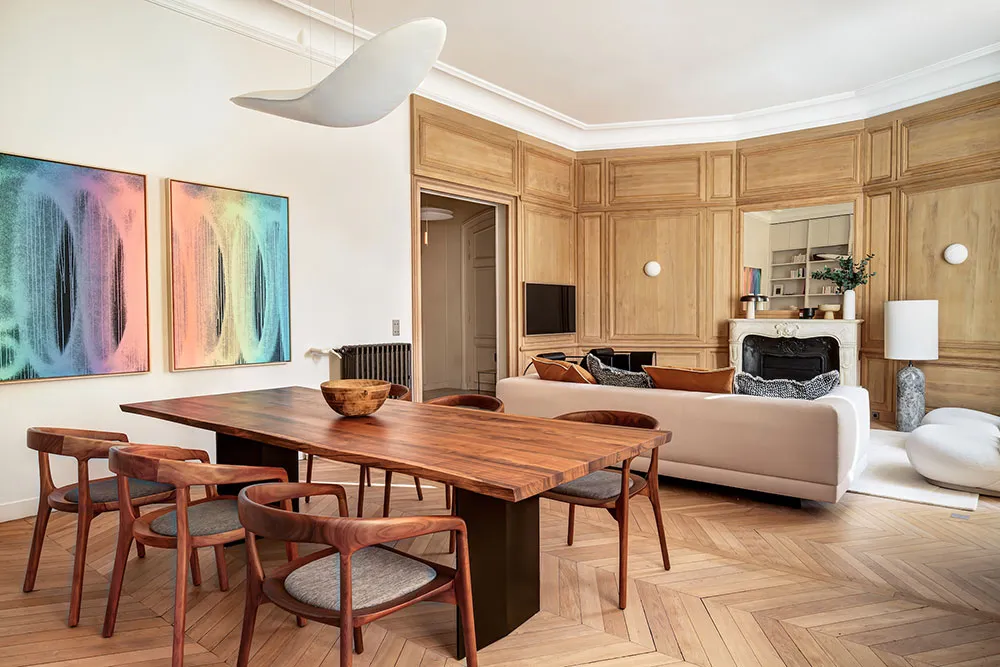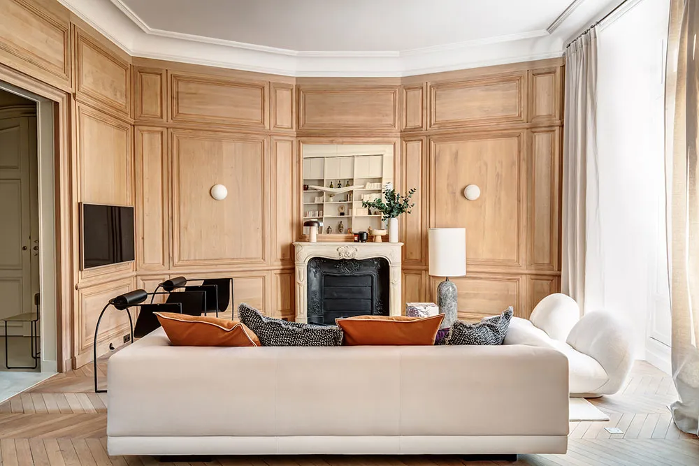 La diseñadora Karolin Andreoni tomó una decisión bastante atrevida para el diseño de estos apartamentos en París: decorar las paredes del interior con paneles de madera maciza.