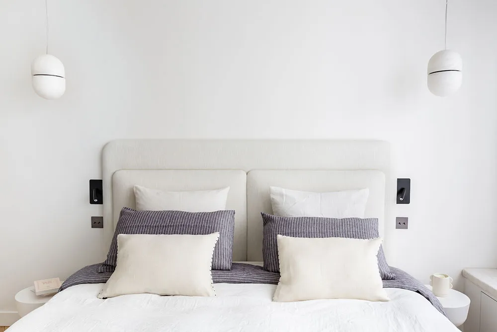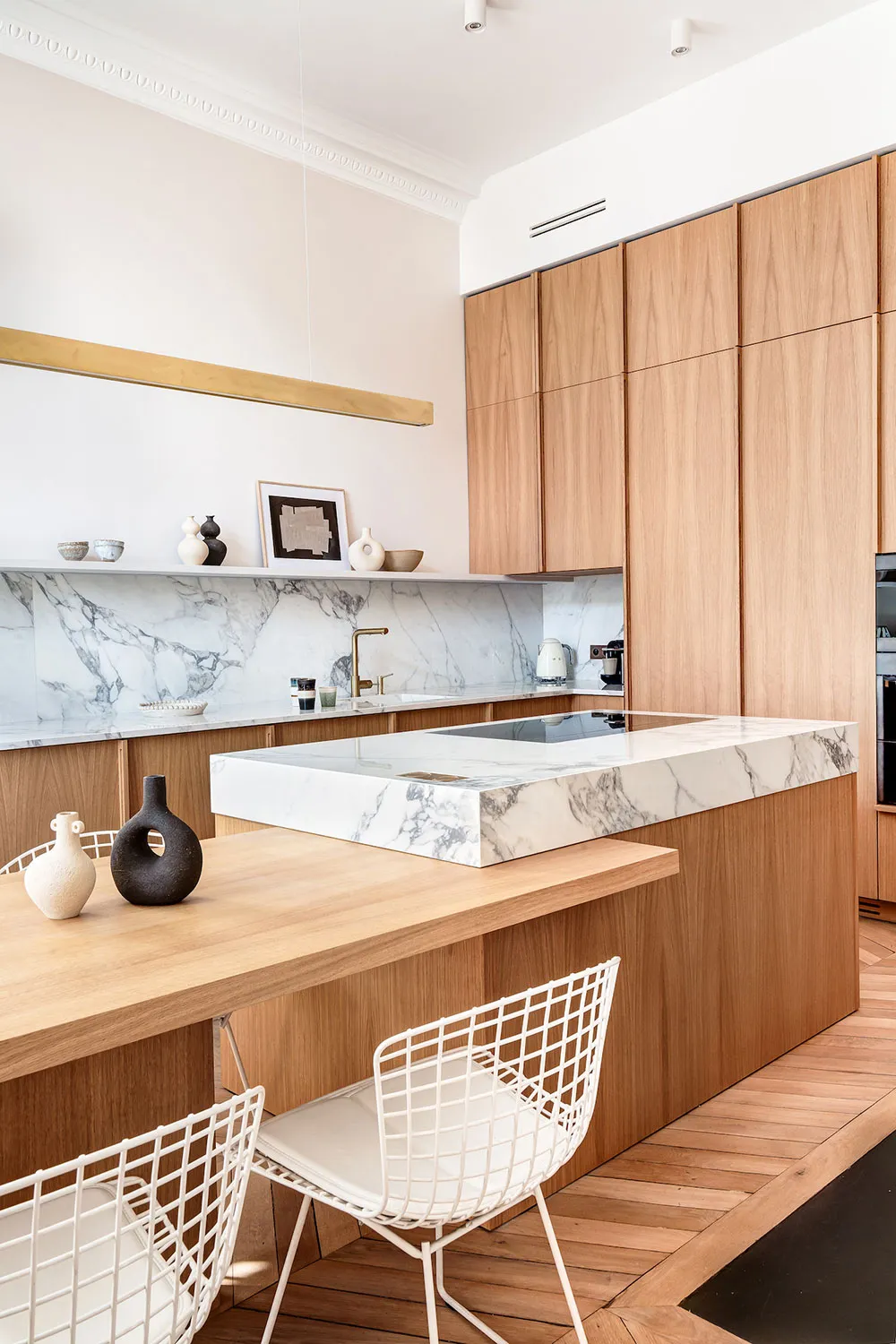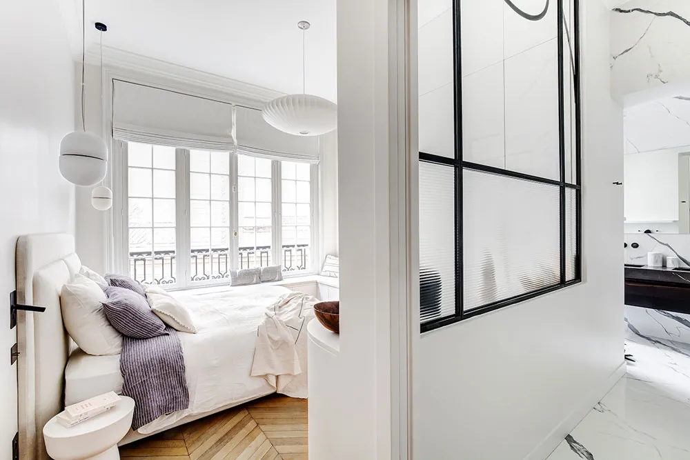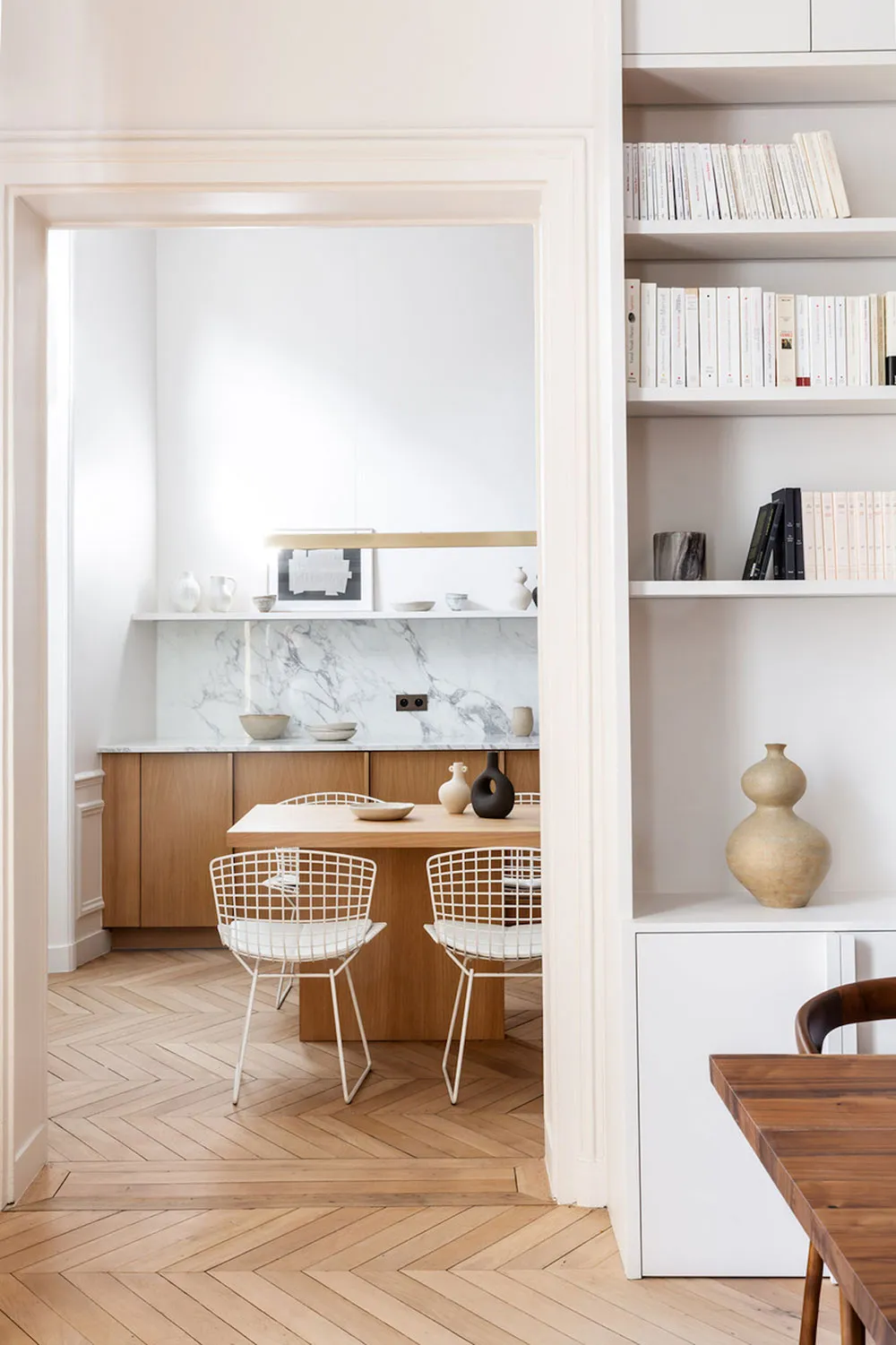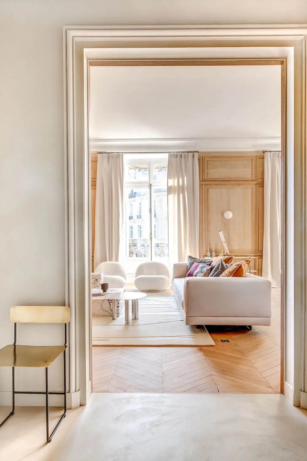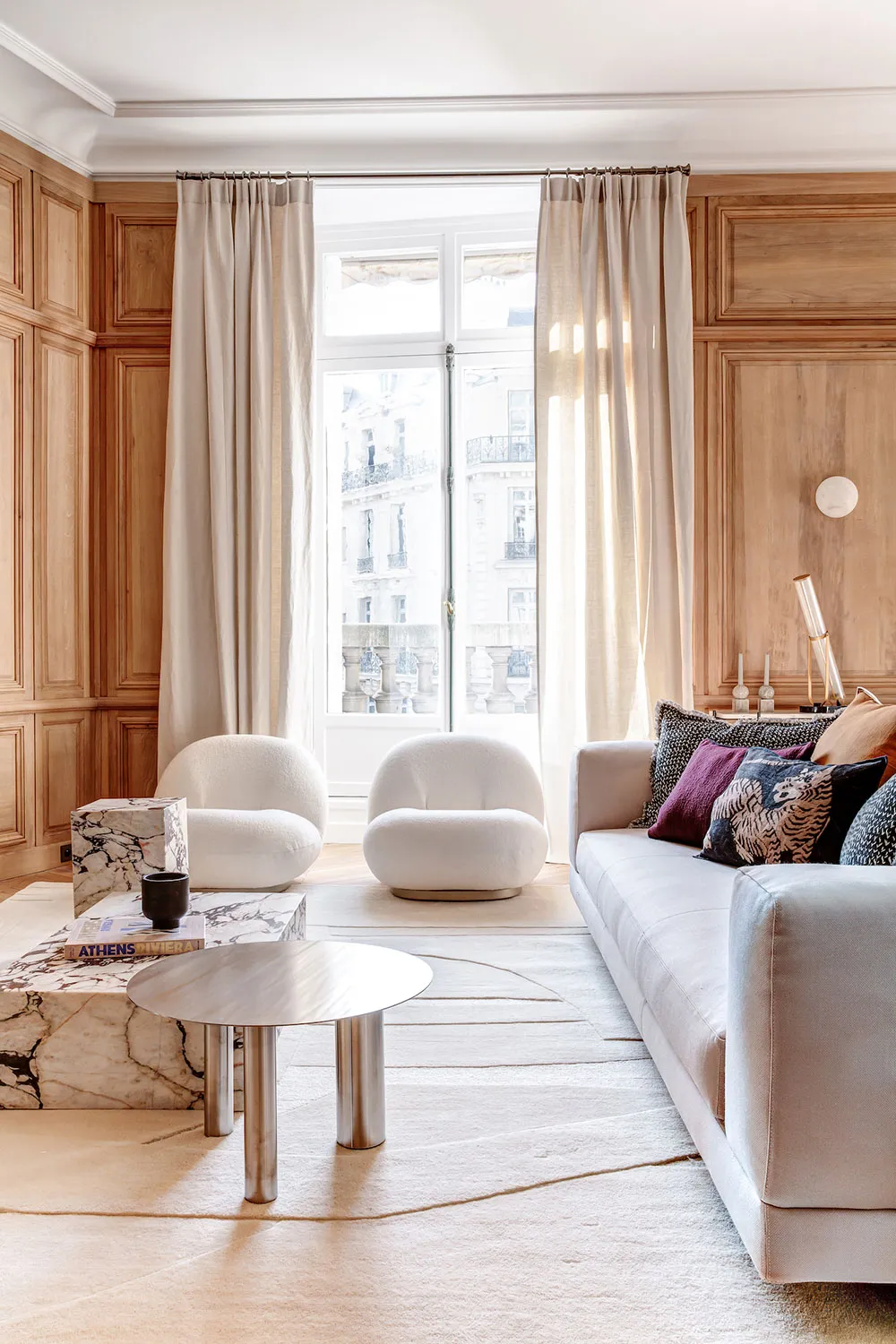 La diseñadora Karolin Andreoni tomó una decisión bastante atrevida para el diseño de estos apartamentos en París: decorar las paredes del interior con paneles de madera maciza.