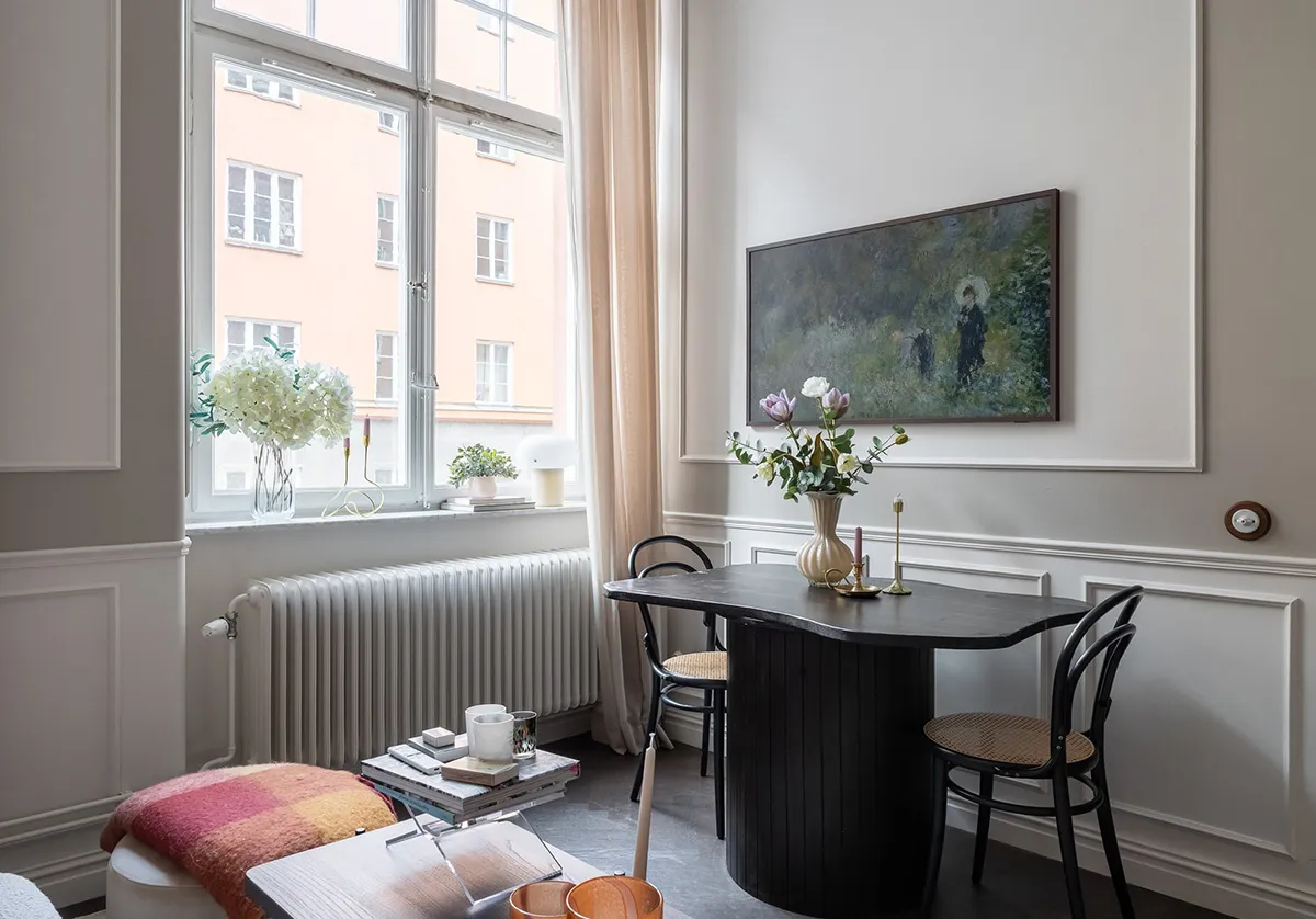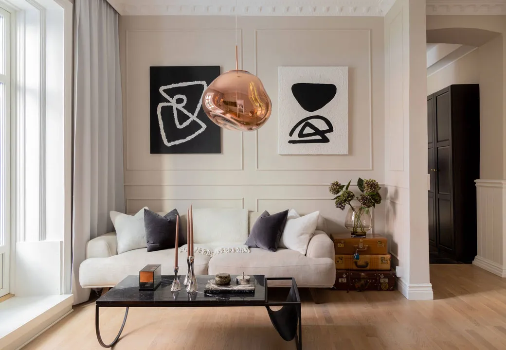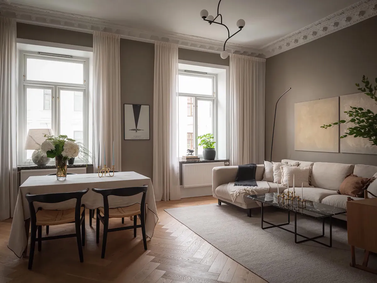 Paredes beige y decoración elegante en una casa sueca (71 m²)