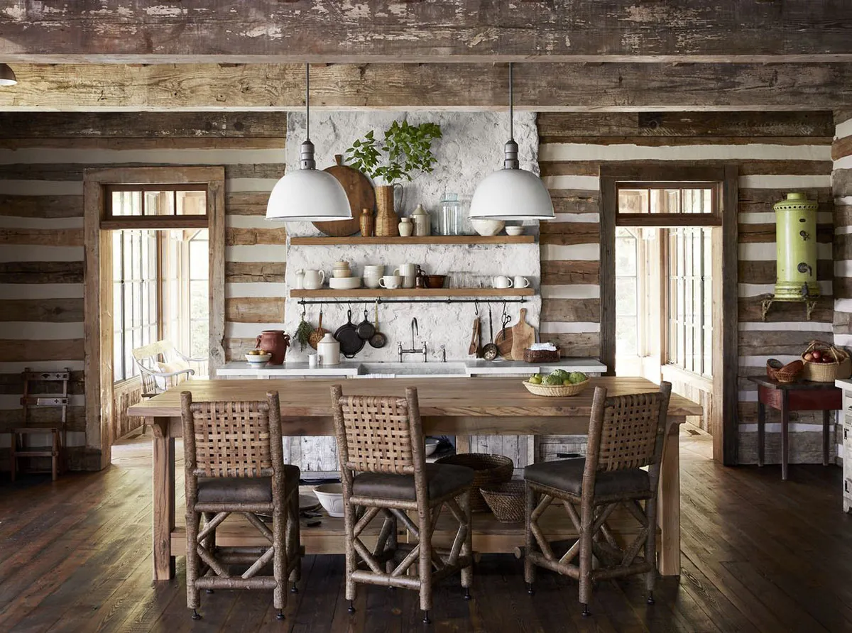 Casa de madera hecha de materiales reciclados con muebles vintage