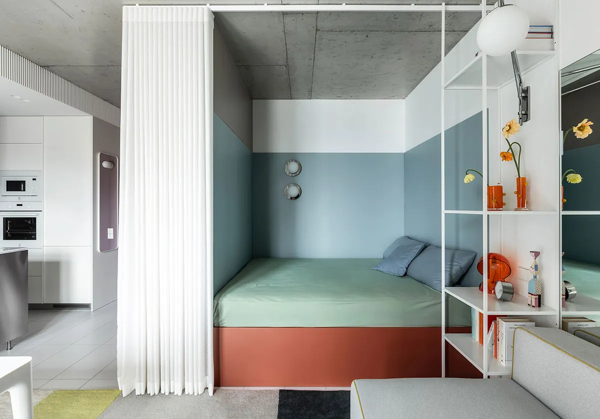 Pequeña habitación pastel con diseño de interior en Kiev para descanso y trabajo (38 m²)