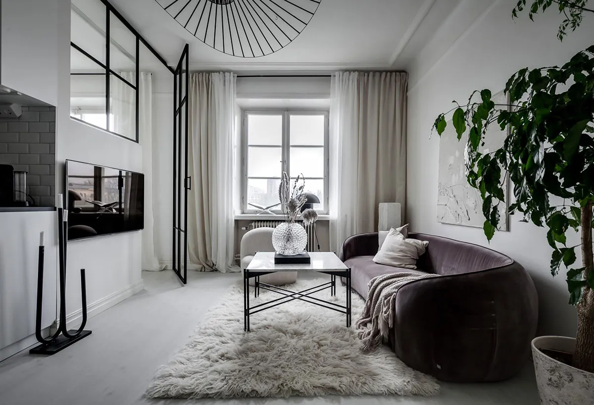 Plano abierto y micro-cuarto de dormitorio tras puerta de vidrio: pequeña apartamento en Estocolmo (38 m²)