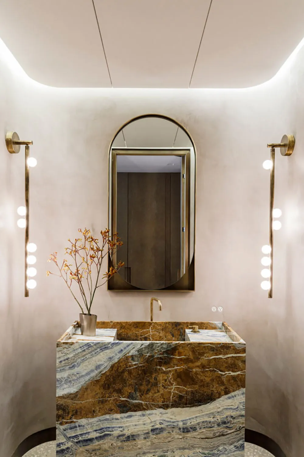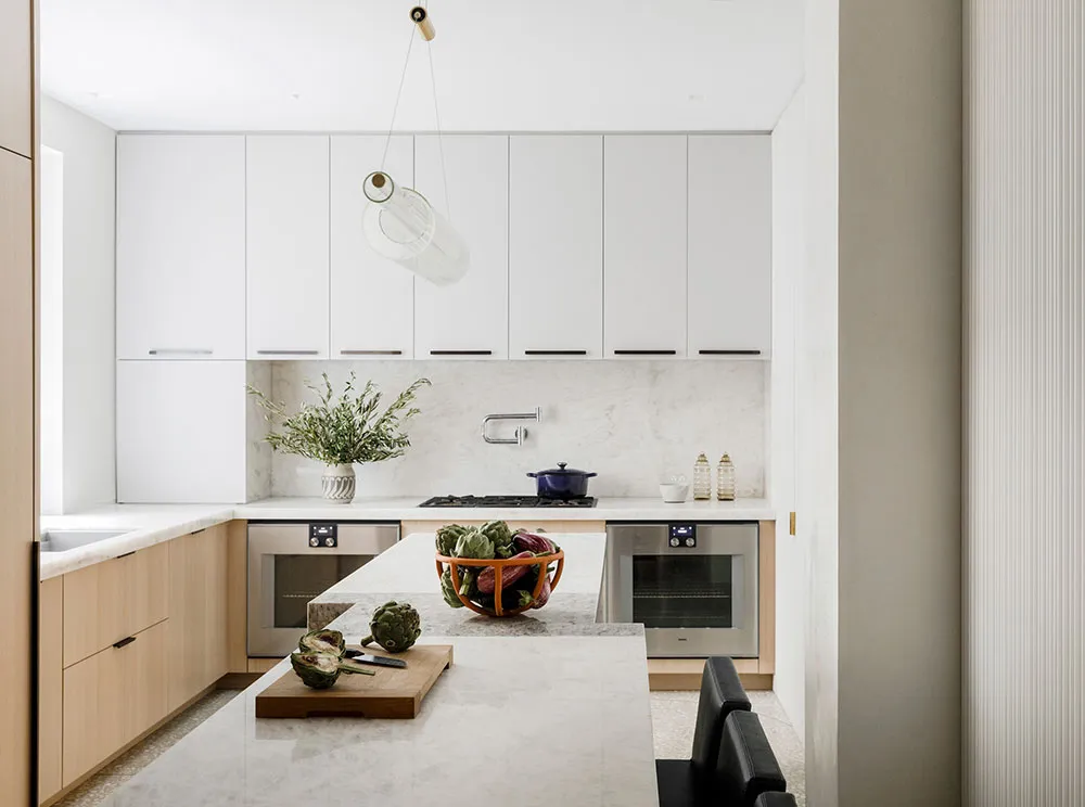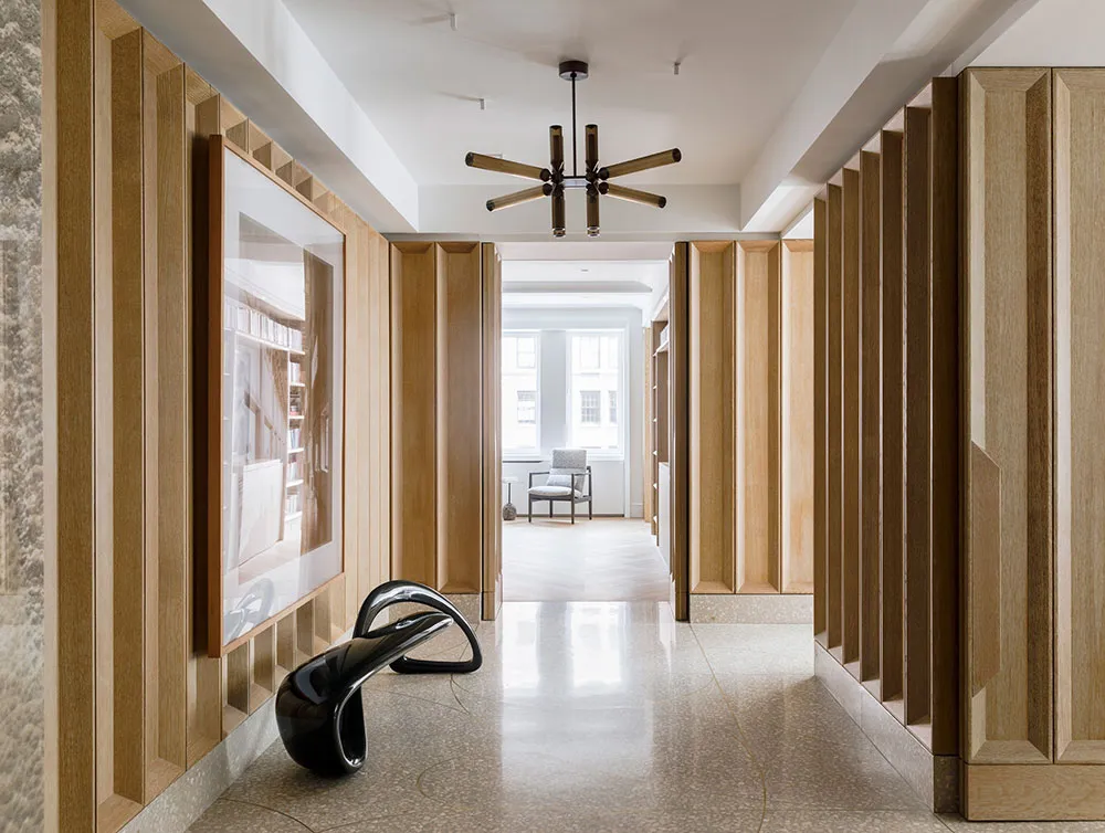 A pesar de una paleta de colores bastante tranquila y sobria, estos apartamentos modernos de la familia empresaria en Nueva York resultaron bastante ricos en texturas, materiales hermosos y soluciones de diseño interesantes.
