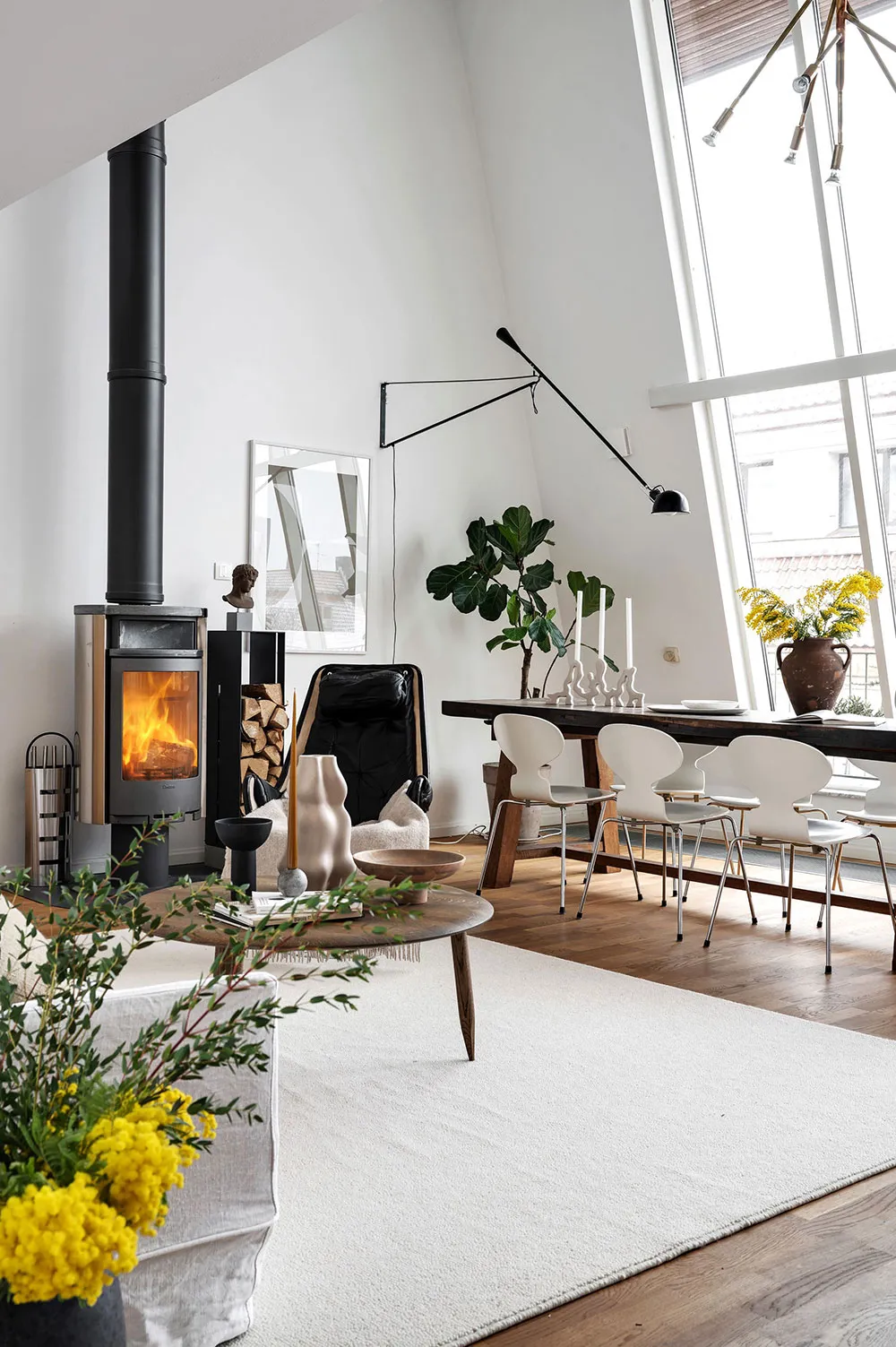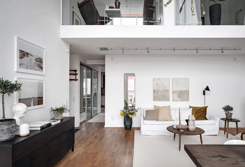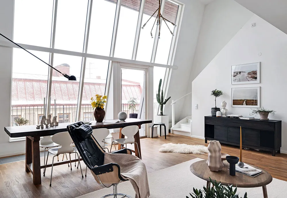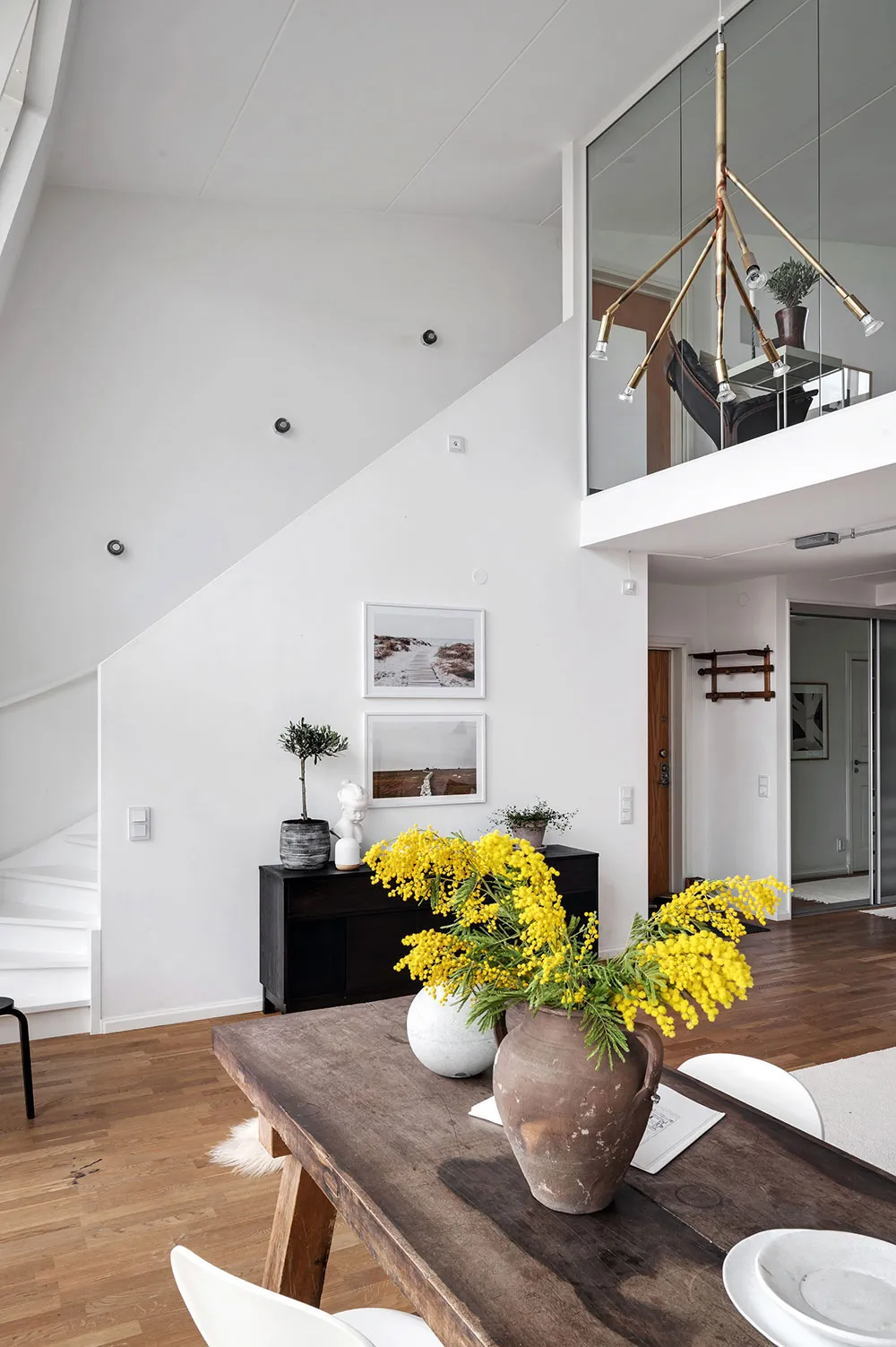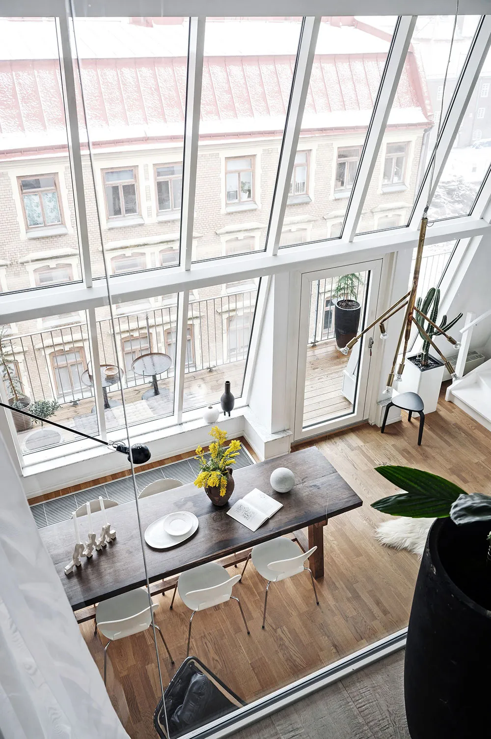 Por su configuración espacial, este dúplex en Gotemburgo recuerda a un estudio de artista; ya habíamos visto este tipo de apartamentos creativos en París y otras ciudades de Europa antigua.