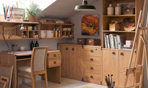Un avantage du mobilier en bois est qu'il convient à une organisation efficace de l’espace dans la chambre d’enfant non seulement dans des espaces standards, mais aussi pour les chambres avec un angle (erker) et les espaces de type mansardes facilement aménagés (cela se voit bien sur la photo ci-dessous).