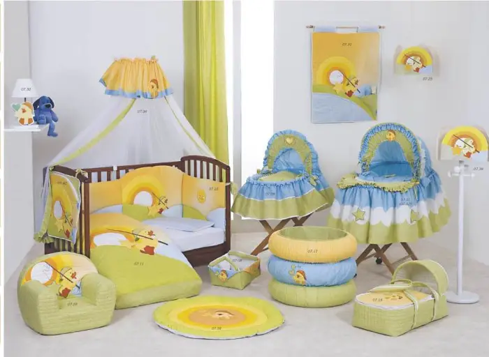 Compte tenu de la nature temporaire et unique de la meublature pour bébés, certains parents peuvent suivre une voie complètement différente et acheter uniquement la meublature indispensable qui ne prend pas beaucoup de place. Un ensemble comme celui montré ci-dessus peut servir de bâton de secours pour une jeune famille. De plus, ce même ensemble peut fixer le ton dans le design de toute la chambre d'enfant.
