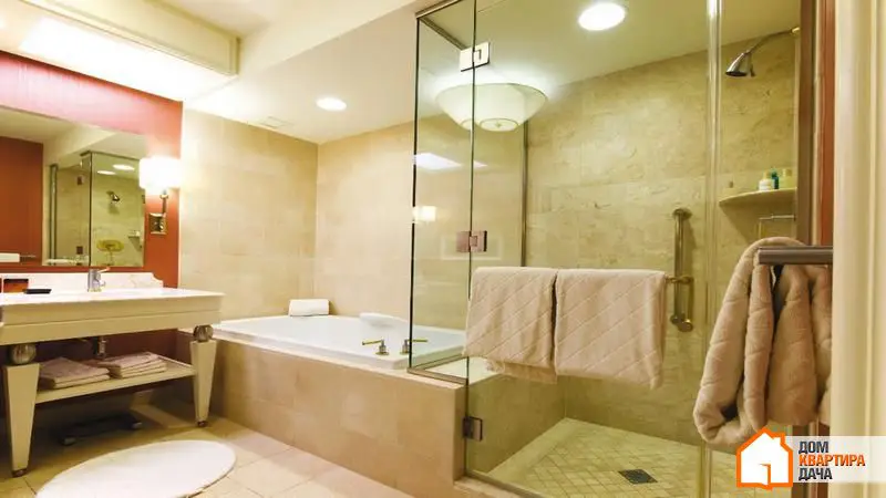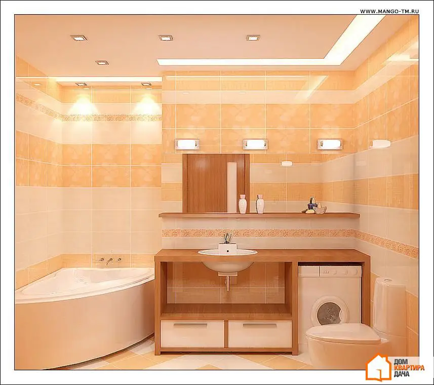 Encore une fois, des couches. Les luminaires intégrés sont la solution idéale pour l'éclairage haut, les appliques murales sont les meilleurs compagnons du miroir. Les lampes avec abat-jour créeront un éclairage plus doux sans ombres trop fortes. Il est important de planifier à l'avance l'éclairage dans la salle de bain pour cacher les câbles dans les murs et protéger au maximum l'électricité contre tout risque d'humidité. N'oubliez pas que dans la salle de bain, des prises spéciales avec protection sont nécessaires. Les interrupteurs doivent également être isolés des gouttelettes et de la vapeur.