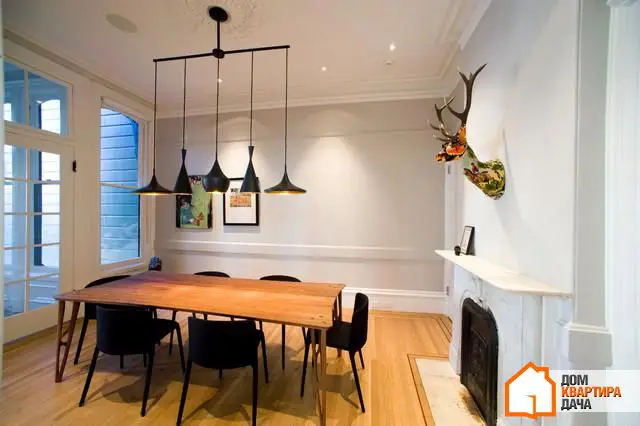 Généralement, l'éclairage principal dans la salle à manger est constitué de luminaires suspendus. Un seul global ou plusieurs au-dessus de la table — c'est important que la lumière provenant de ces ampoules soit tamisée et ne crée pas d'ombres trop fortes. N'oubliez pas non plus les variateurs.