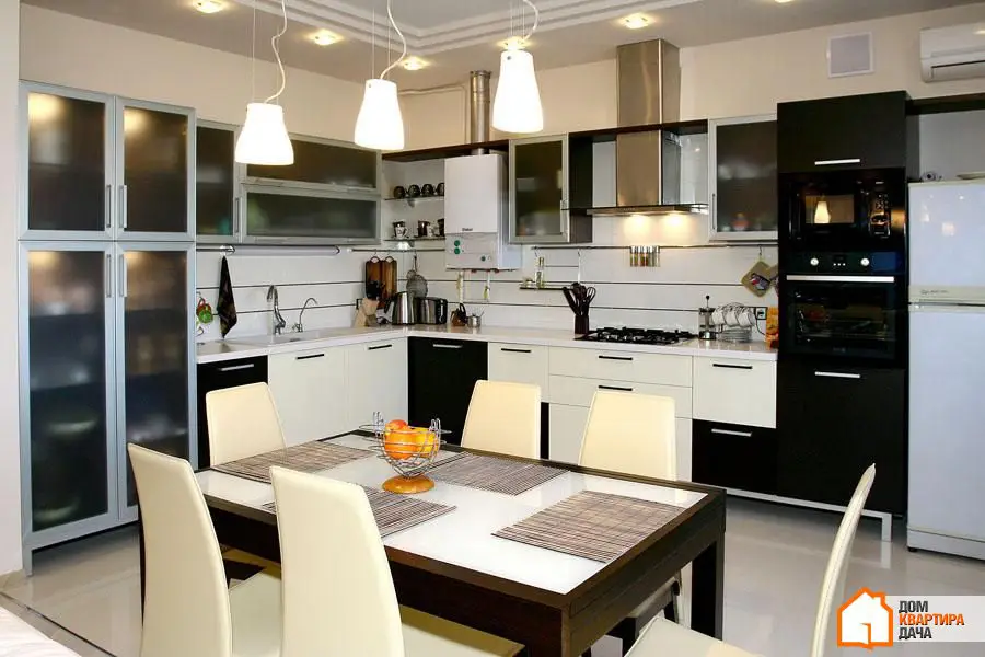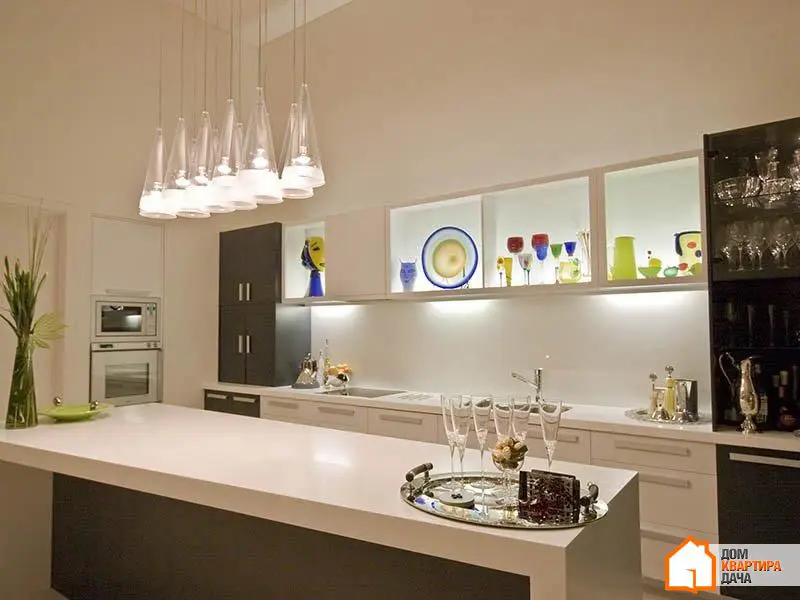 Dans la cuisine, comme dans le salon, le principe de superposition fonctionne très bien. L'éclairage sous la surface de travail, un lampadaire individuel au-dessus de la table pour le petit-déjeuner. Une belle mise en valeur est l'éclairage des tiroirs de la cuisine avec des portes en verre. Un lampadaire individuel peut être monté dans l'extracteur au-dessus de la plaque.