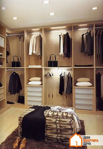 L'éclairage dans la chambre à vêtements doit être soigneusement planifié : une lumière suffisamment vive en haut, un éclairage du miroir et des tiroirs internes avec cravates et vêtements de dessous. La règle fondamentale de la chambre à vêtements est qu'il n'y a jamais trop de lumière.