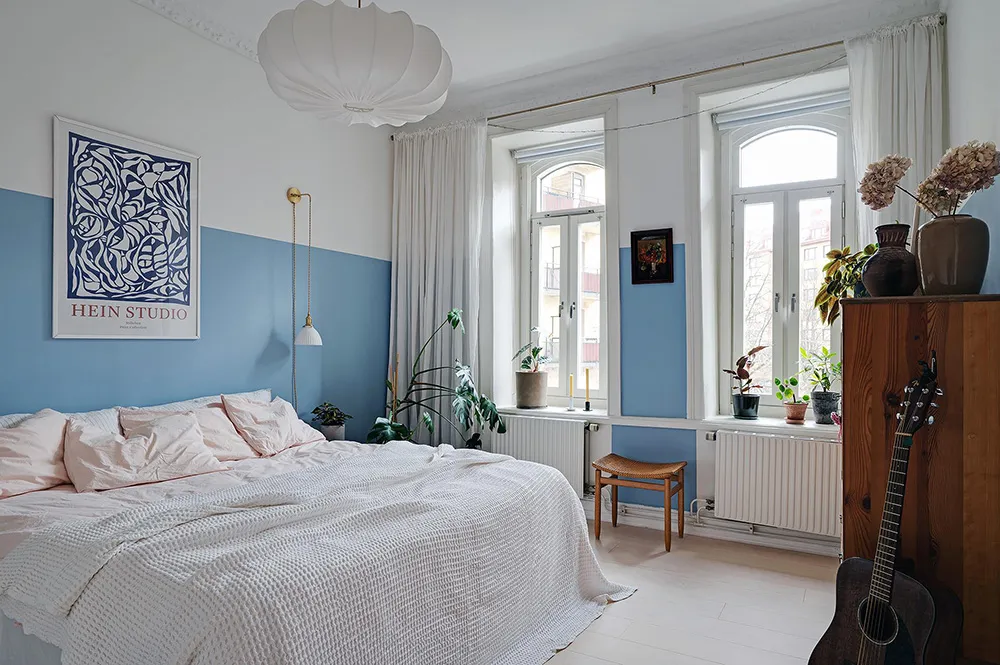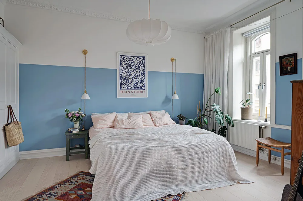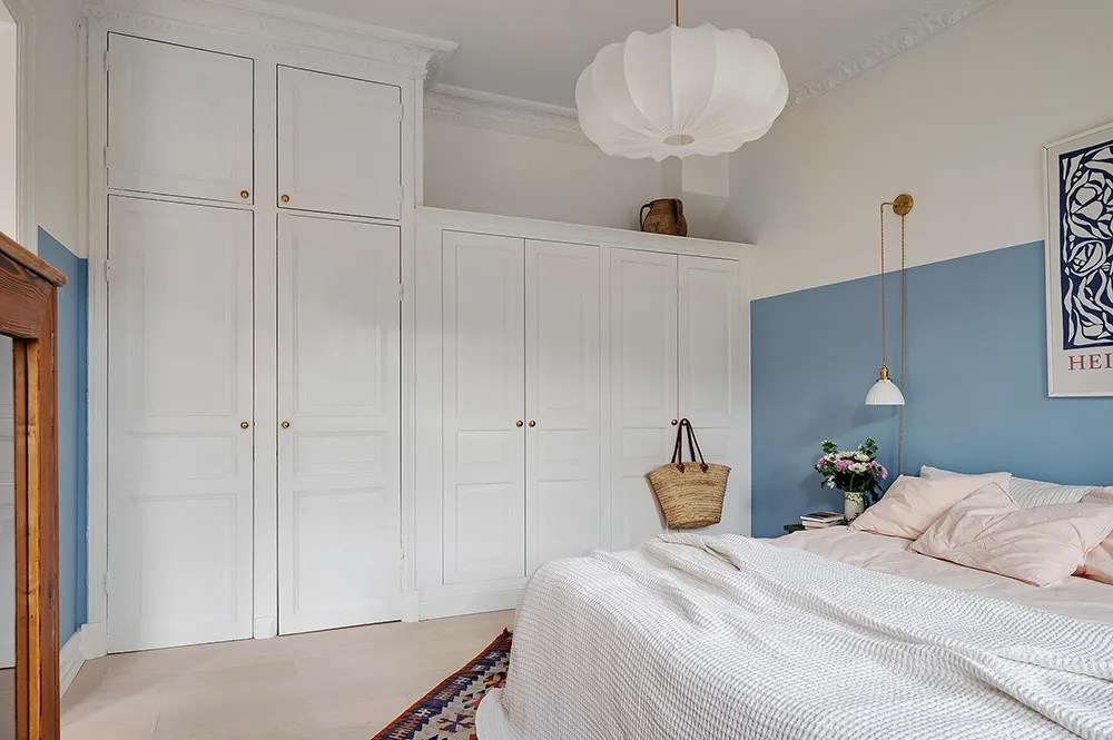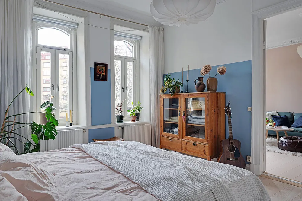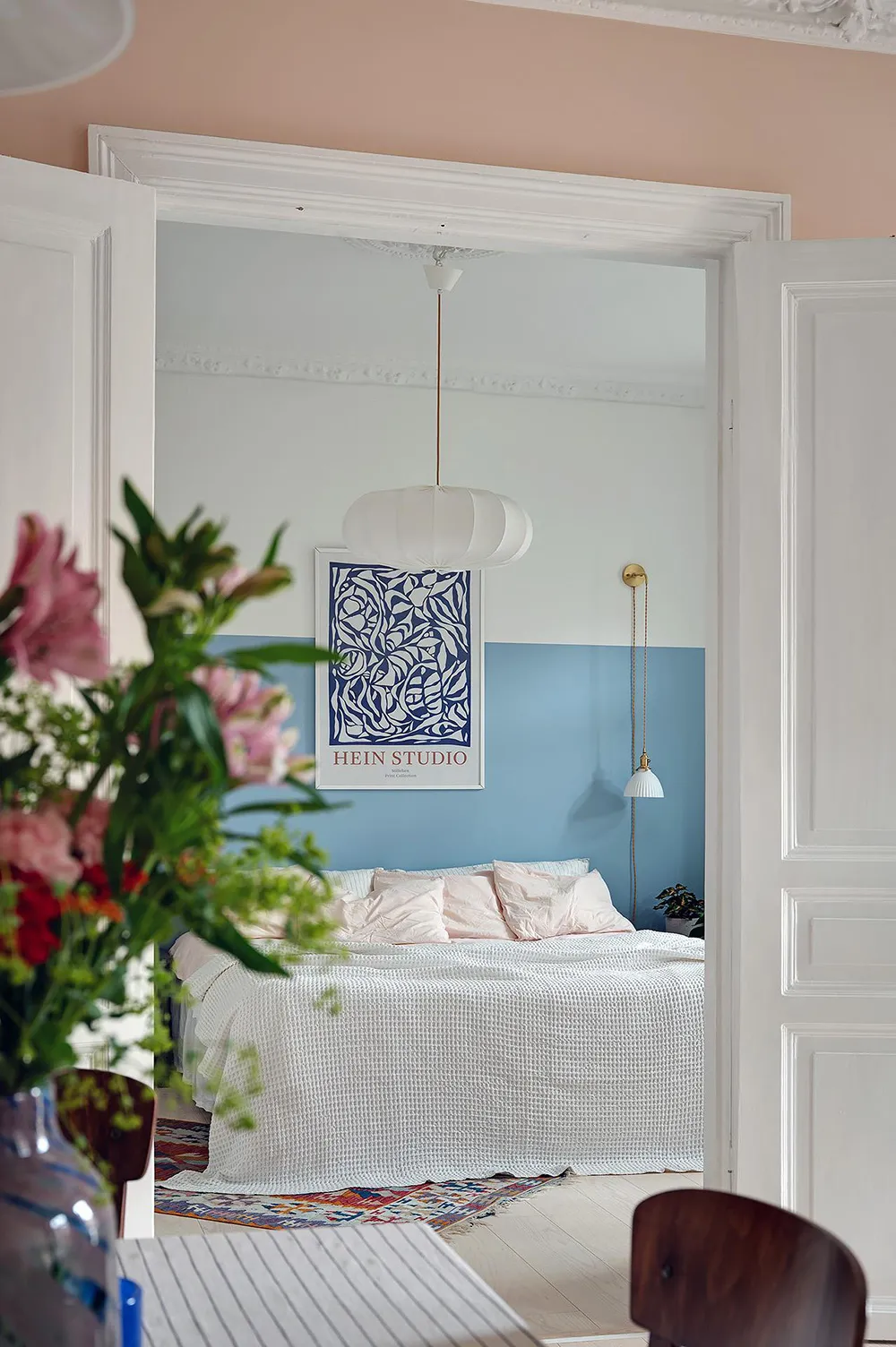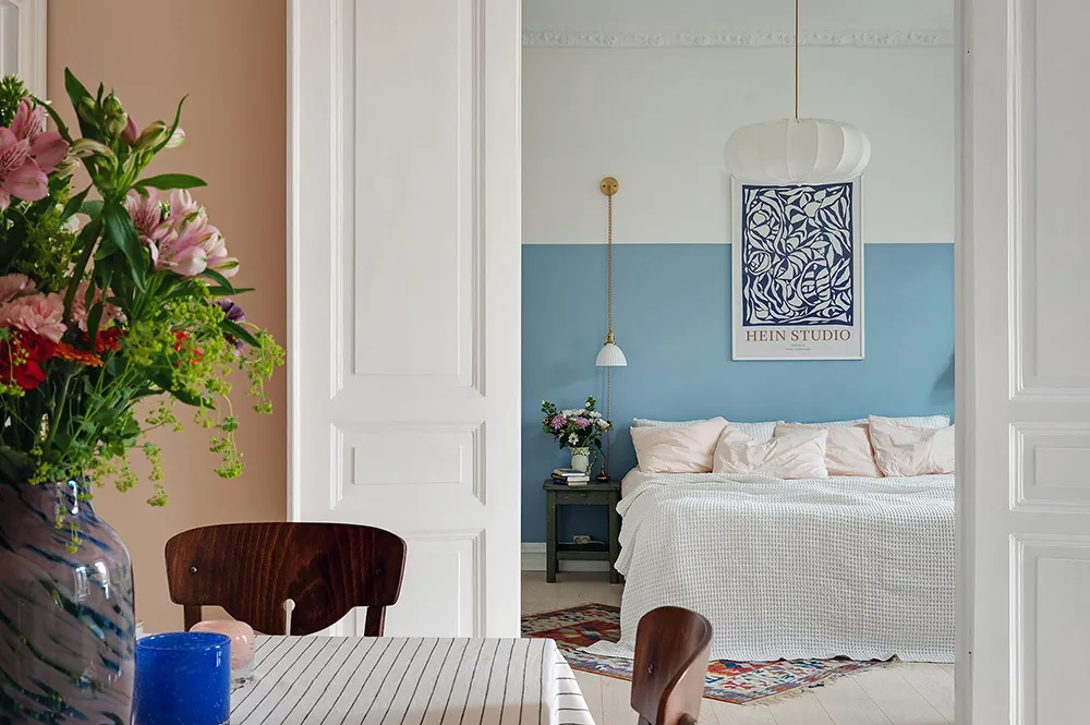 Rouge et bleu pâle : appartement pastel en Suède (77 m²)