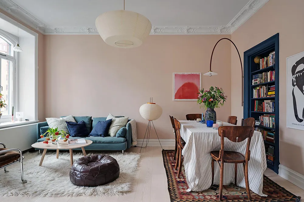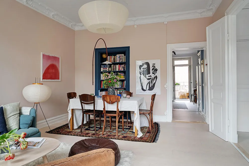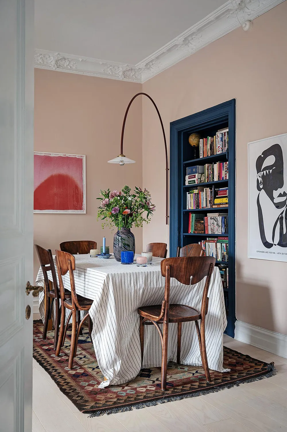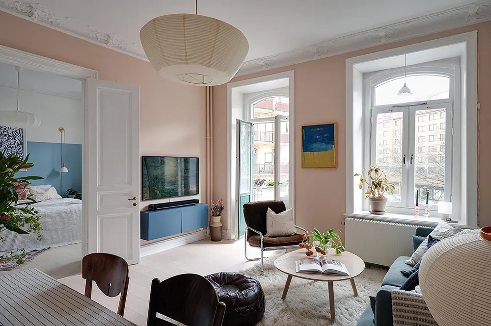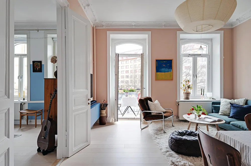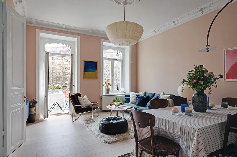 L'intérieur de cet appartement dans un ancien bâtiment à Göteborg est basé sur une combinaison assez inattendue, mais familiale : des teintes pastel de rose et de bleu.