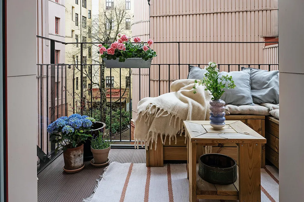 Intérieur beige à Gétteborg avec des détails floraux chaleureux
