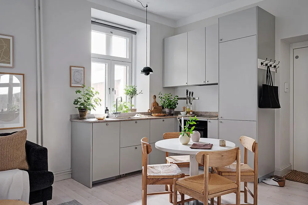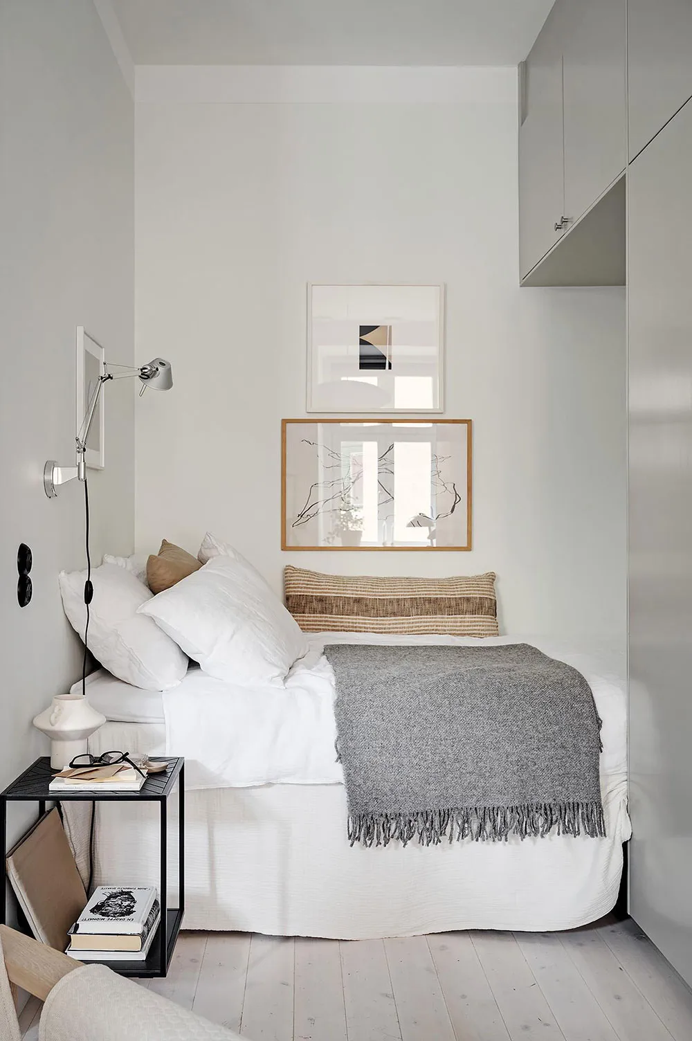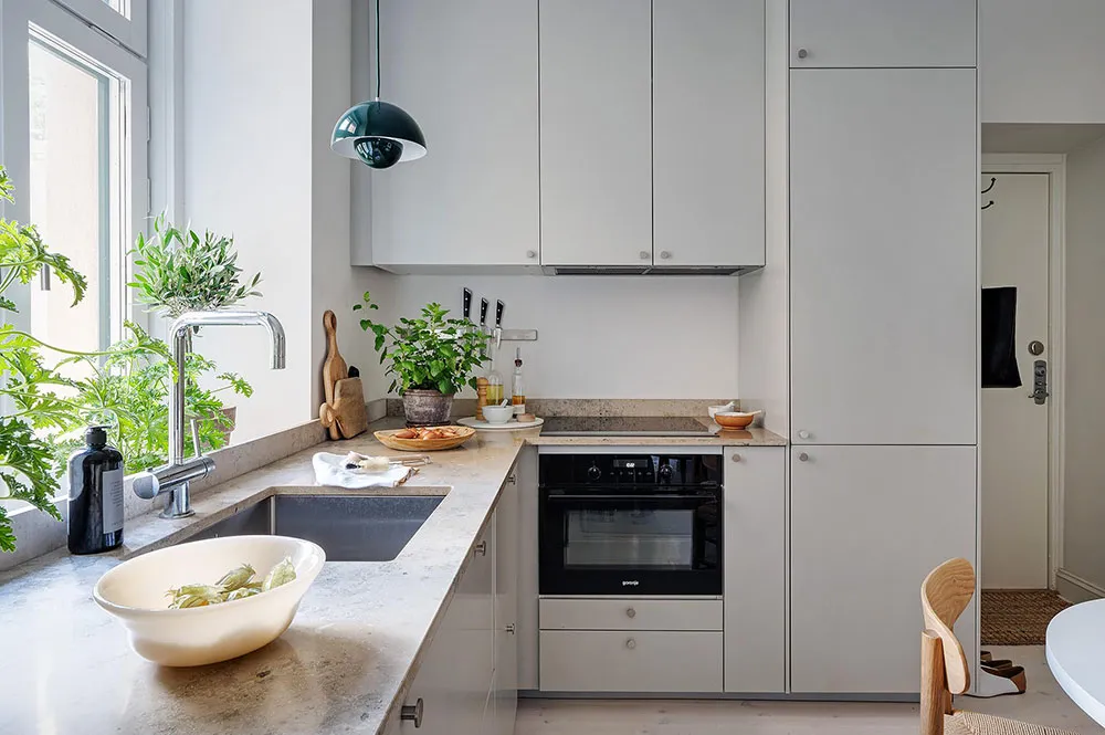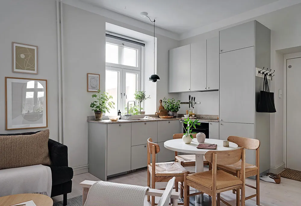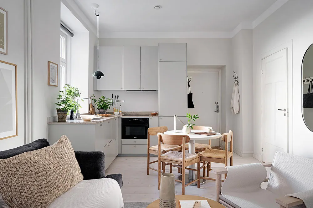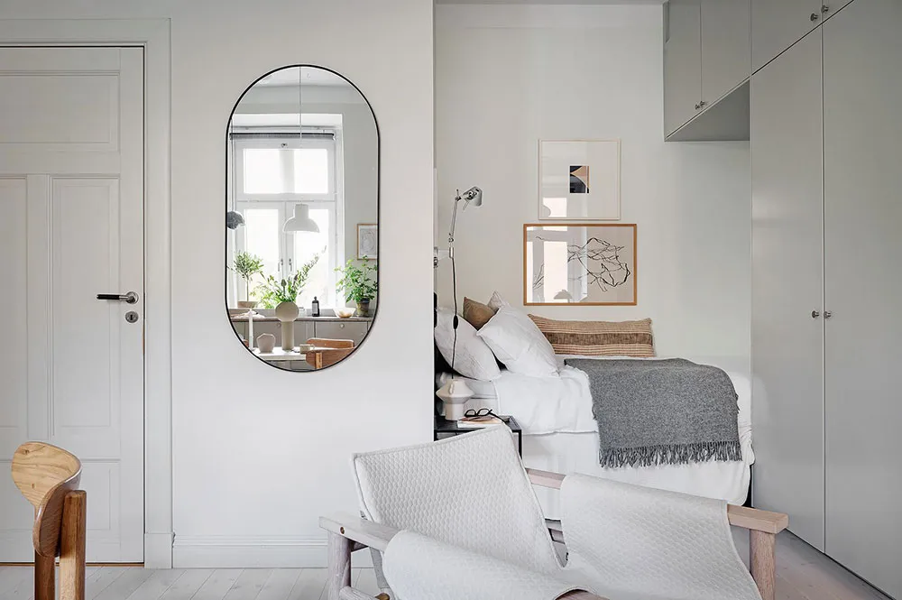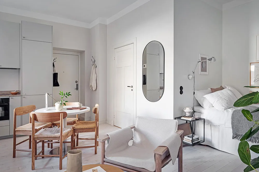 Puisque la superficie totale de cette minuscule appartement à Göteborg ne fait que 28 m², les designers ont décidé de ne pas perdre de précieux centimètres carrés et se sont complètement passés de cloisons intérieures (seule la salle de bain est séparée de l'espace commun).
