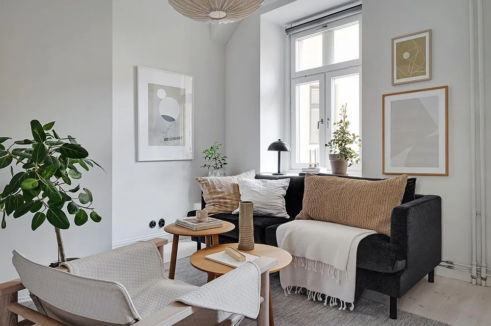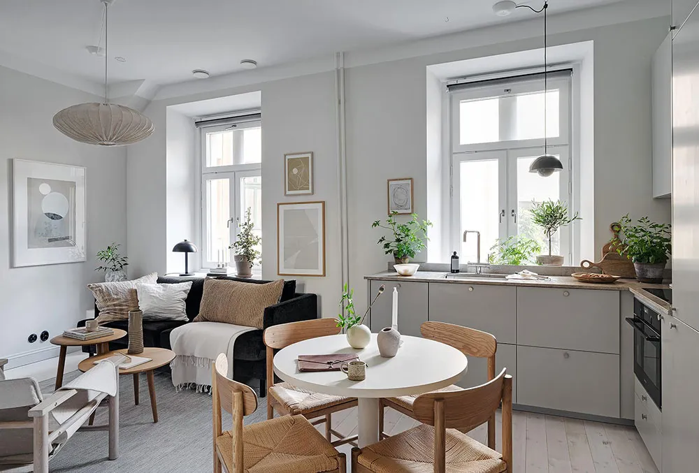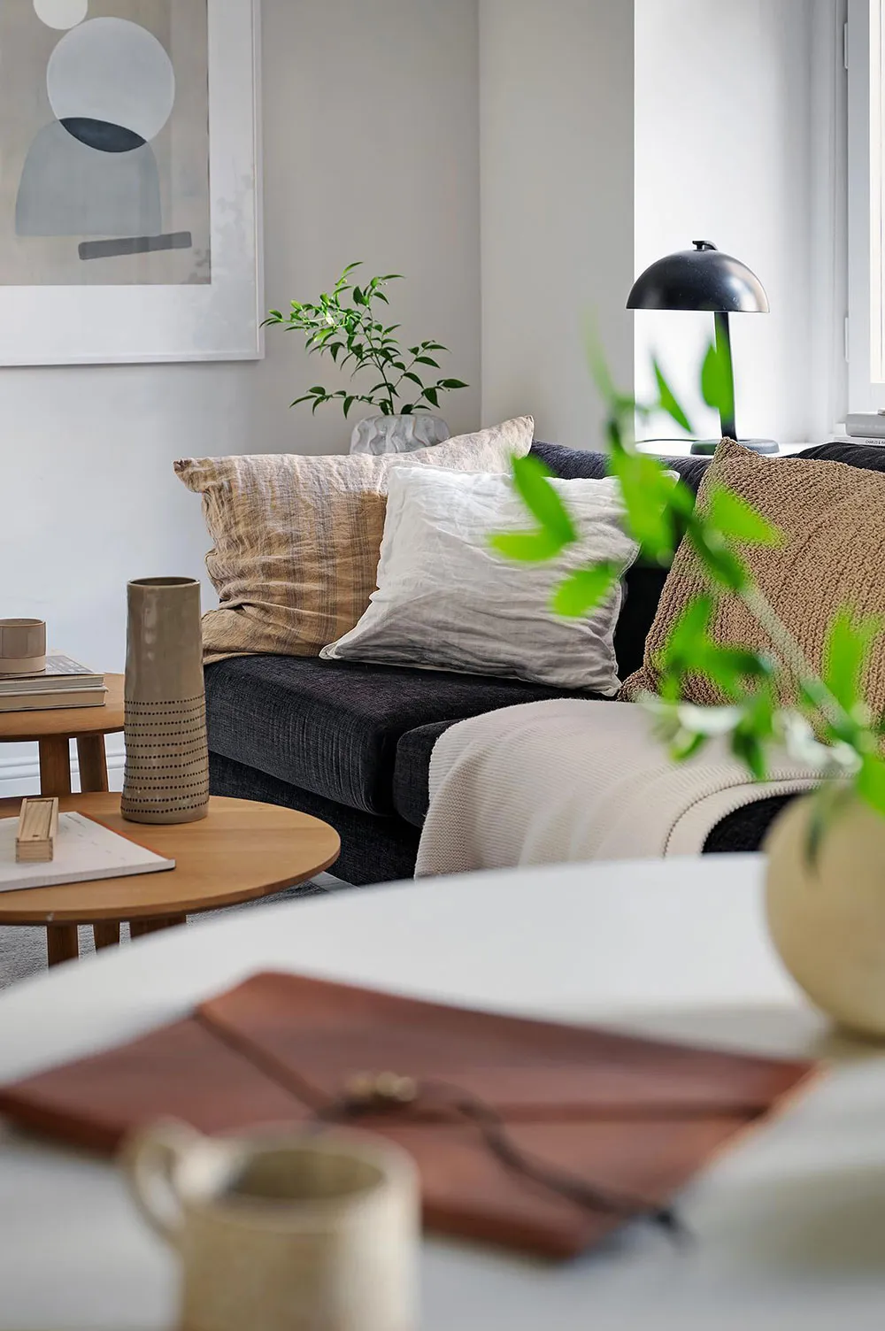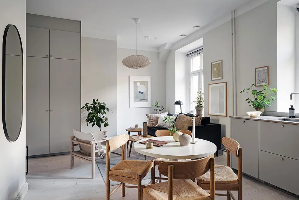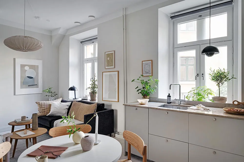 Intérieur beige à Gétteborg avec des détails floraux chaleureux