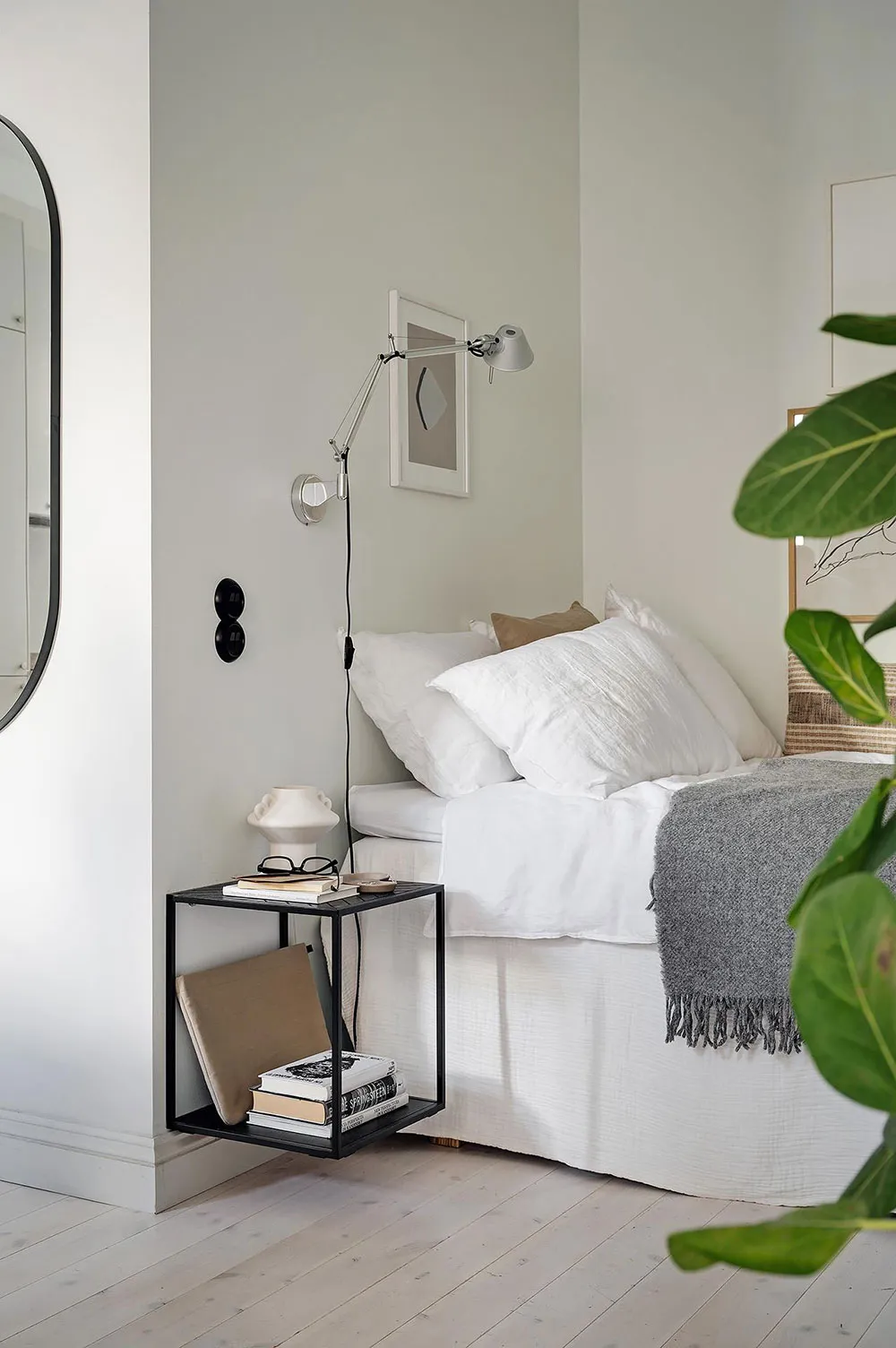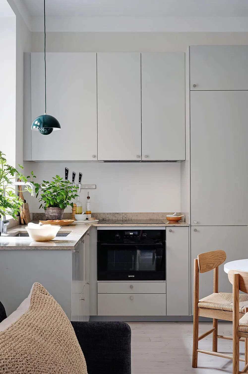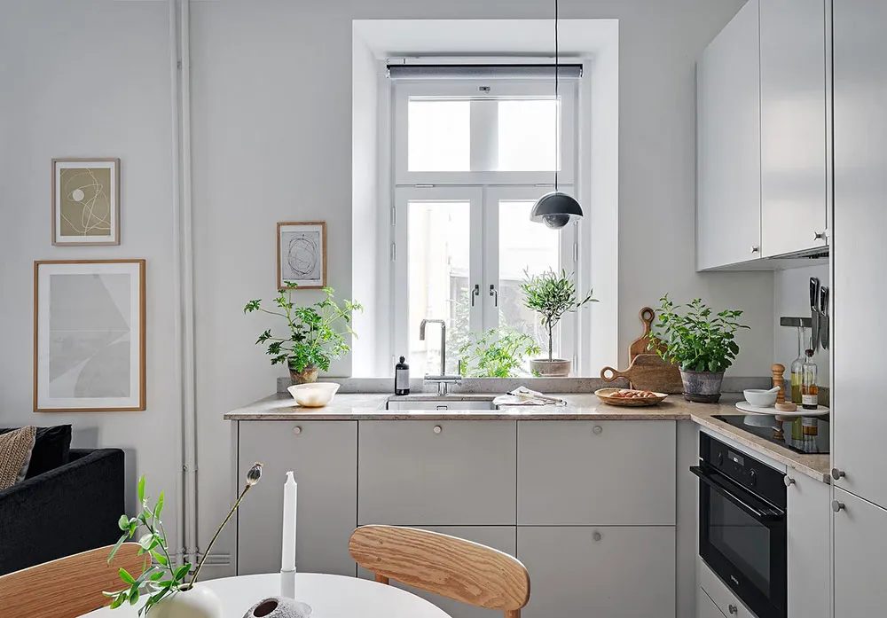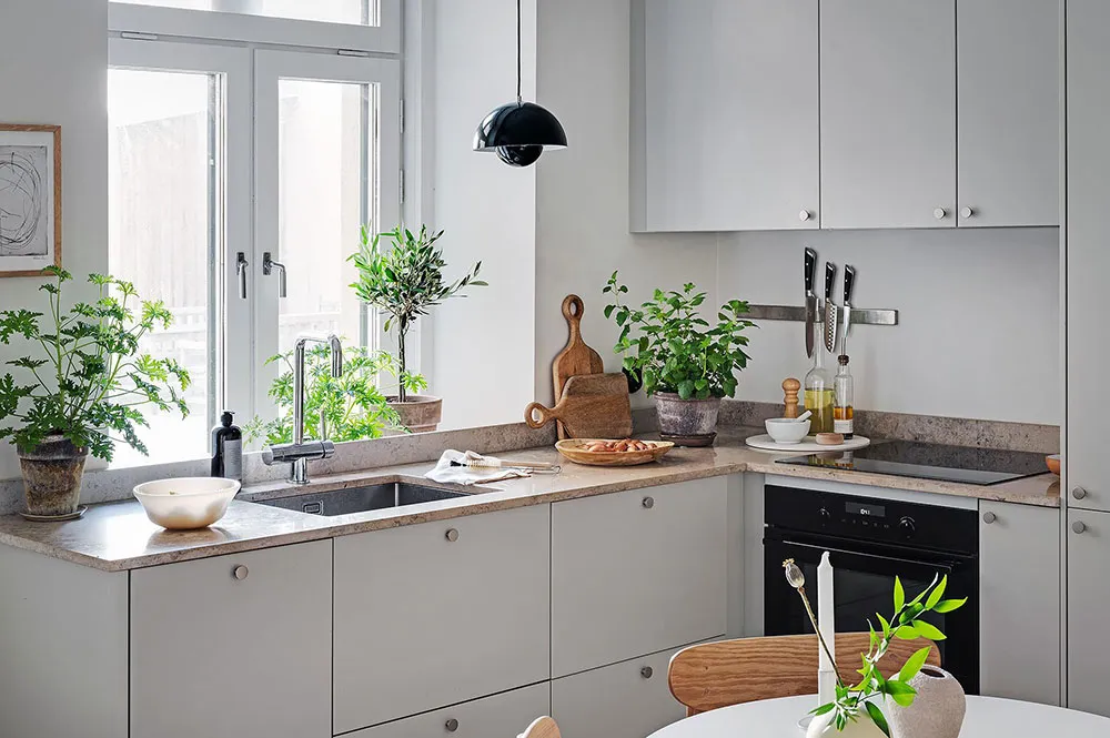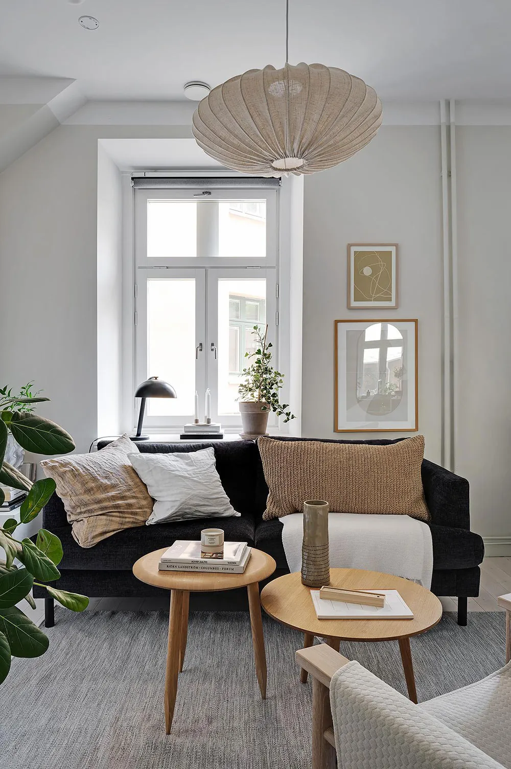 Intérieur beige à Gétteborg avec des détails floraux chaleureux